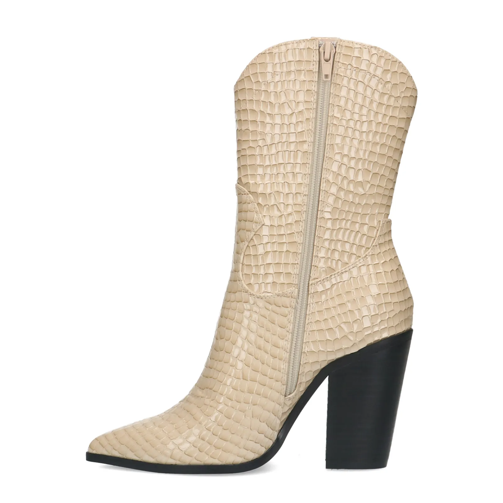 Deze Enkellaarsjes Met Hak Van Sacha Hebben Een Beige Kleur, Western Details En Een Glimmend Croco Design. De Laarsjes Hebben Een Spitse Neus En Een Blokhak Van 10 Cm. Hierbij Hoort Een Schachthoogte Van 16 Cm En Een Schachtomtrek Van 30 Cm.Maak Gebruik Van De Juiste Onderhoudsproducten Om De Western Boots Te Beschermen!