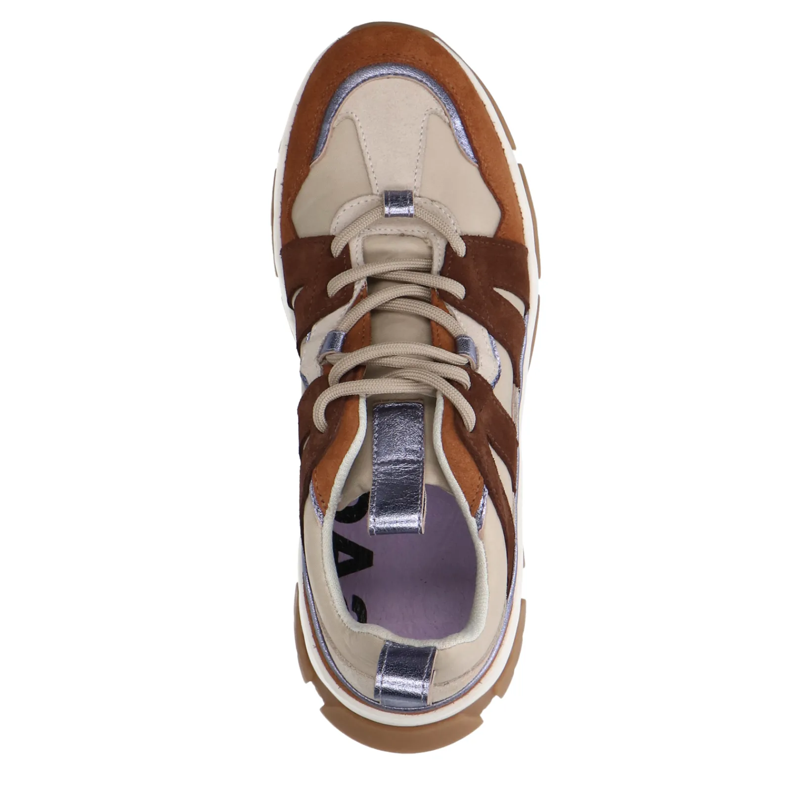 Deze Chunky Sneakers Van Sacha Hebben Een Grof Karakter Die Wordt Gecombineerd Met Opvallende Metallic Paarse Details. Naast De Beige Synthetische Basis Aan De Buitenzijde, Hebben De Dames Sneakers Verschillende Camel Suede Overlays. De Zool Heeft Een Dikte Van 3 Cm. Maak Gebruik Van De Juiste Onderhoudsproducten.