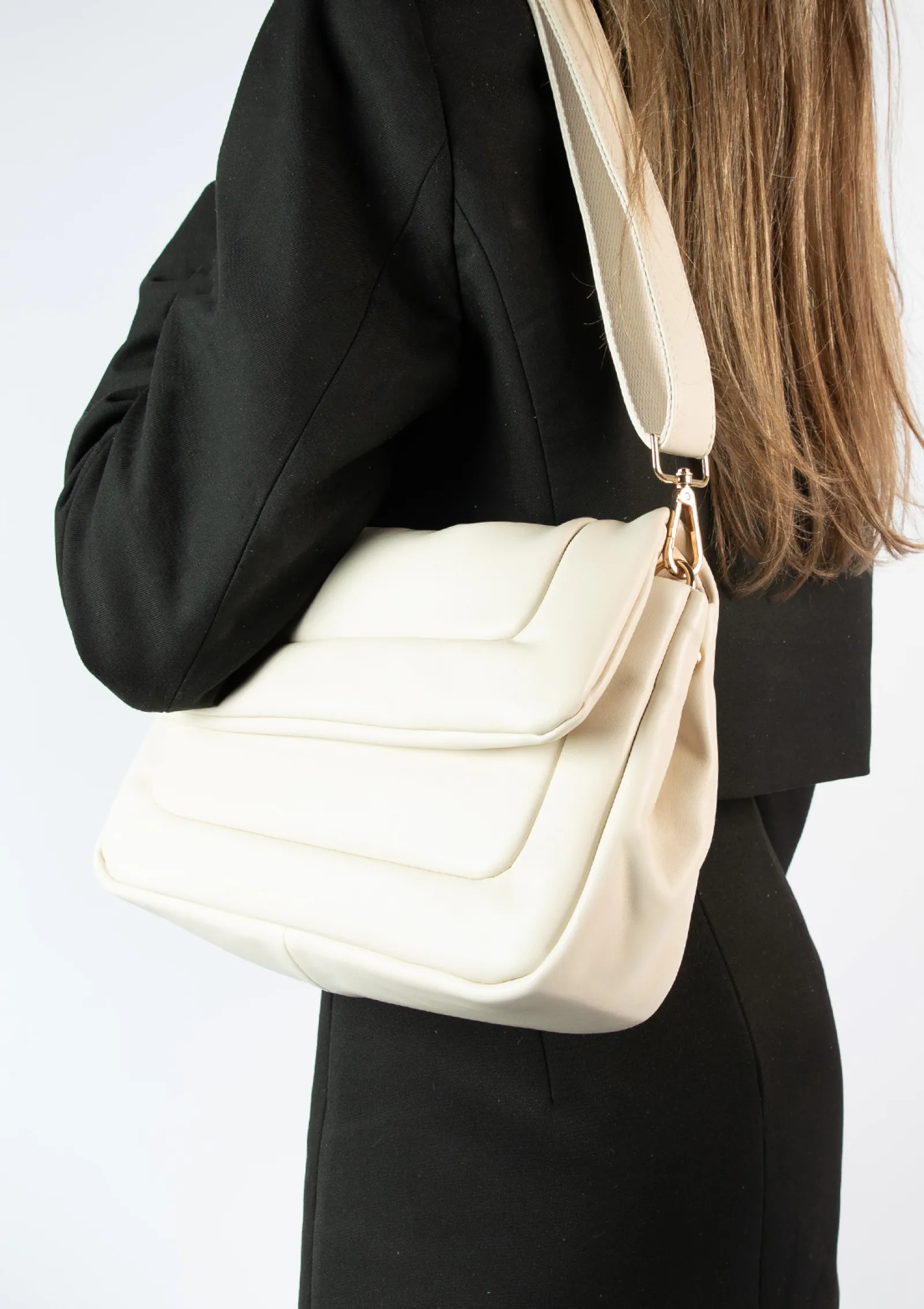 Deze Beige Schoudertas Van Sacha Heeft Een Puffer Design. De Tas Heeft Een Latte Kleur En Een Verstelbare Schouderband Met Een Totale Lengte Van 63 Cm. De Binnenzijde Heeft Een Groot Insteek Vak Met Daarbij Twee Kleine Opbergvakjes. De Schoudertas Is Te Sluiten Middels Twee Magnetische Druk Knopen. De Totale Afmeting Van De Tas Is 20X30X10 Cm.