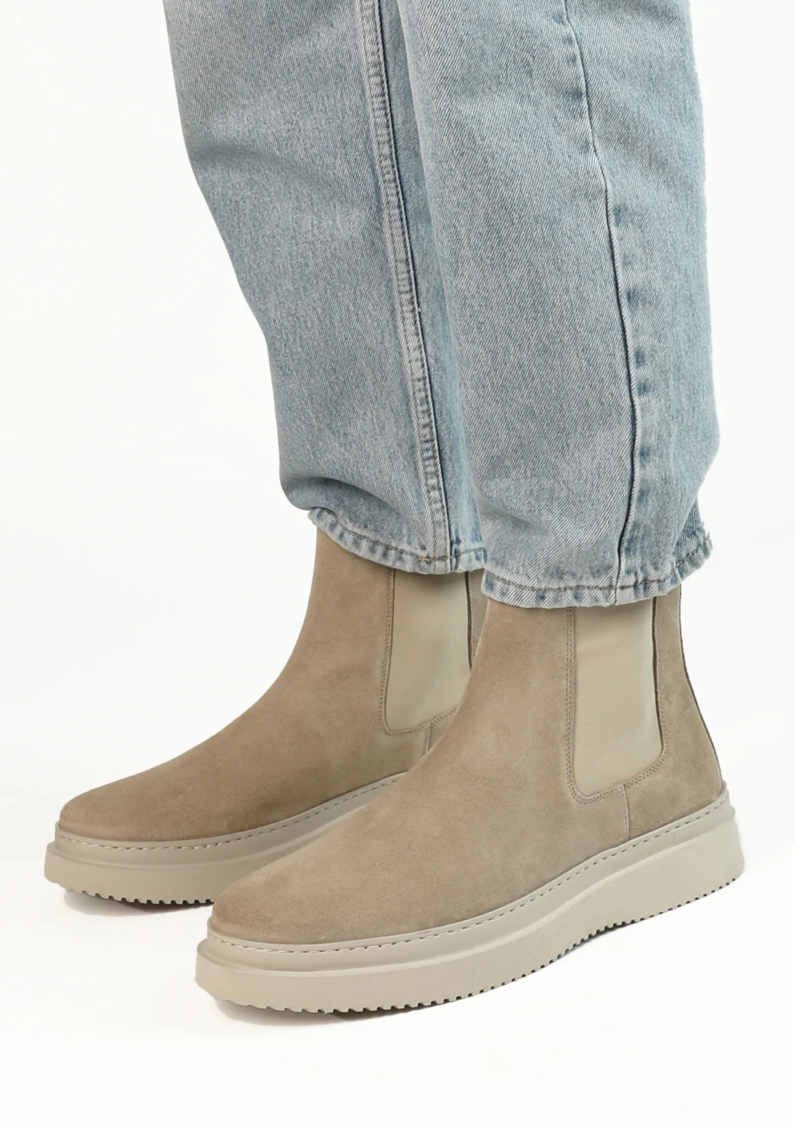 Beige Chelsea Boots Van Sacha In Een Suede Uitvoering Met Extra Lichte Zool! De Zool Is Gemaakt Van Eva Materiaal Wat Zorgt Voor Een Goede En Comfortabele Demping. De Zool Heeft Een Dikte Van 4 Cm. De Boots Hebben Een Schachthoogte Van 14 Cm En Een Schachtomtrek Van 30 Cm. Maak Gebruik Van De Juiste Onderhoudsproducten!