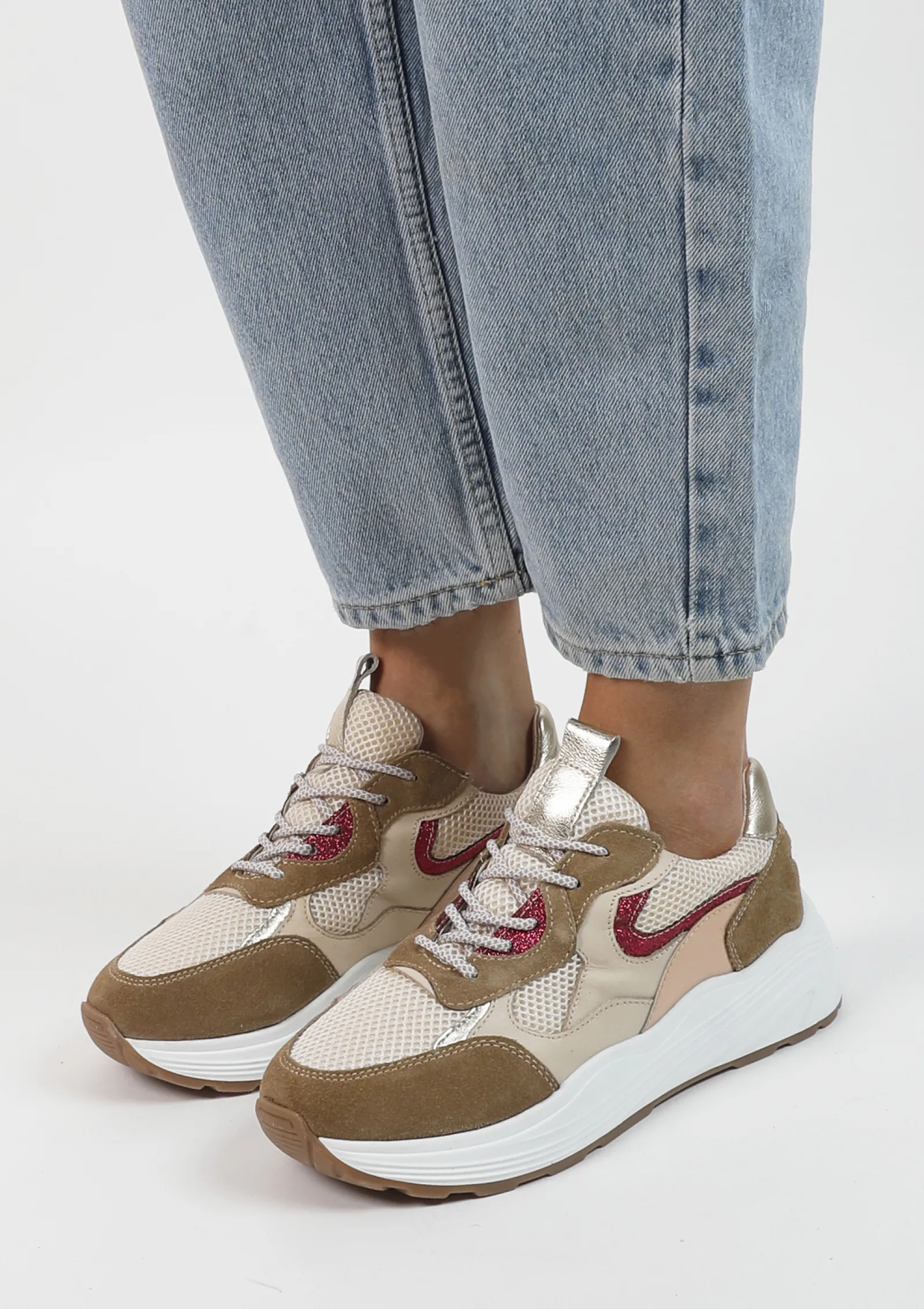 Trendy Beige Sneakers Van Sacha. De Sneakers Hebben Roze Glitter Details Met Aan De Achterzijde Een Goudkleurig Detail. De Buitenzijde Van De Sneakers Zijn Gemaakt Van Suede Met Beige Tinten. De Sneakers Hebben Beige Met Witte Veters En Een Chunky Plateau Zool Van 4 Cm. Maak Gebruik Van De Juiste Onderhoudsproducten!