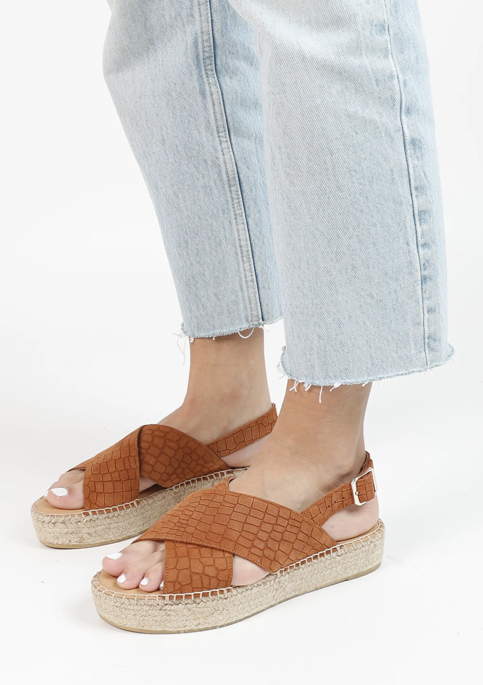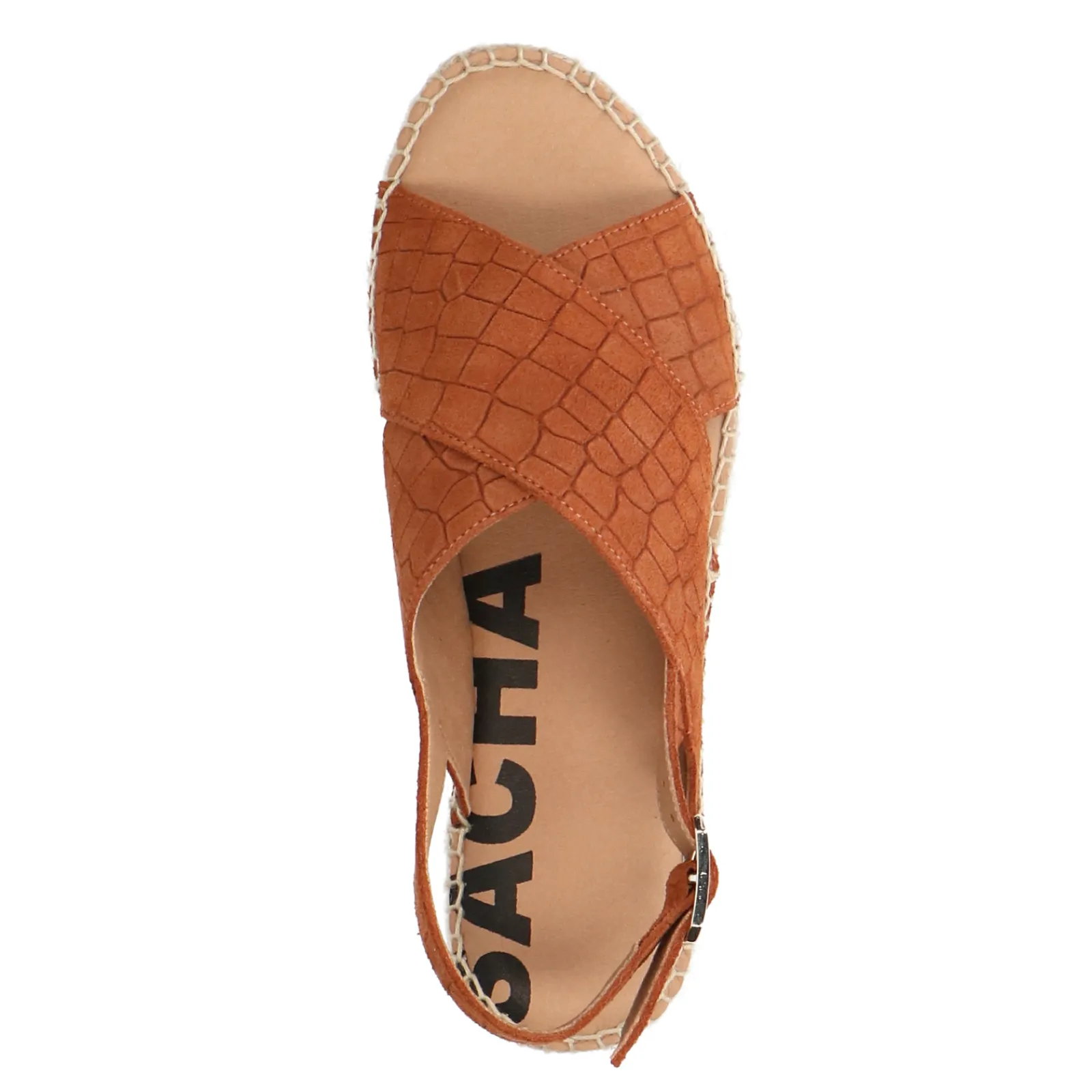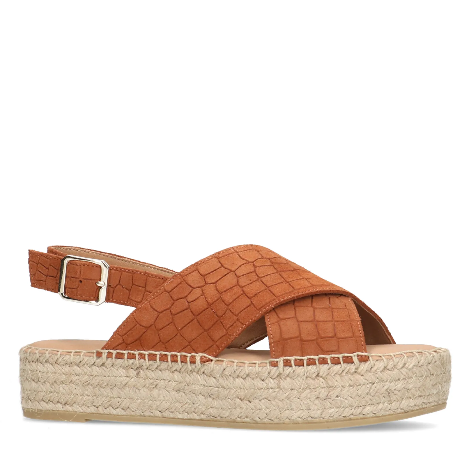 Summer Ready Met Deze Cognac Suede Plateau Sandalen Van Sacha! De Sandalen Zijn Aan De Buitenzijde Gemaakt Van Suede En Aan De Binnenzijde Van Leer. De Plateau Zool Is Gemaakt Van Gewoven Touw Met Een Hoogte Van 4 Cm. Het Design Heeft Een Subtiele Croco Print Voor Een Unieke Twist. Maak Gebruik Van De Juiste Onderhoudsproducten!
