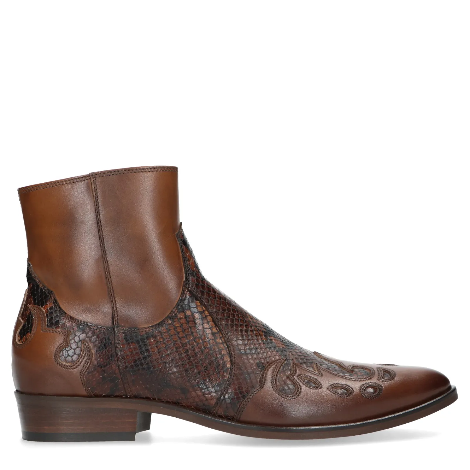 Met Deze Cognac Western Boots Uit De Dandy Collection Van Sacha Geef Je Een Stoere Twist Aan Elke Look! De Snakeprint, Western Stiksels, Lage Hak Van 3 Cm Hoog En De Spitsere Neus Zorgen Voor Een Typische Westerse Uitstraling. De Boots Zijn Volledig Gemaakt Van Leer En Door De Rits Aan De Binnenzijde Trek Je Ze Gemakkelijk Aan En Uit. Combineer Met Een Mooie Jeans En Blouse Of Trui Voor Een Compleet Gestylede Look!
