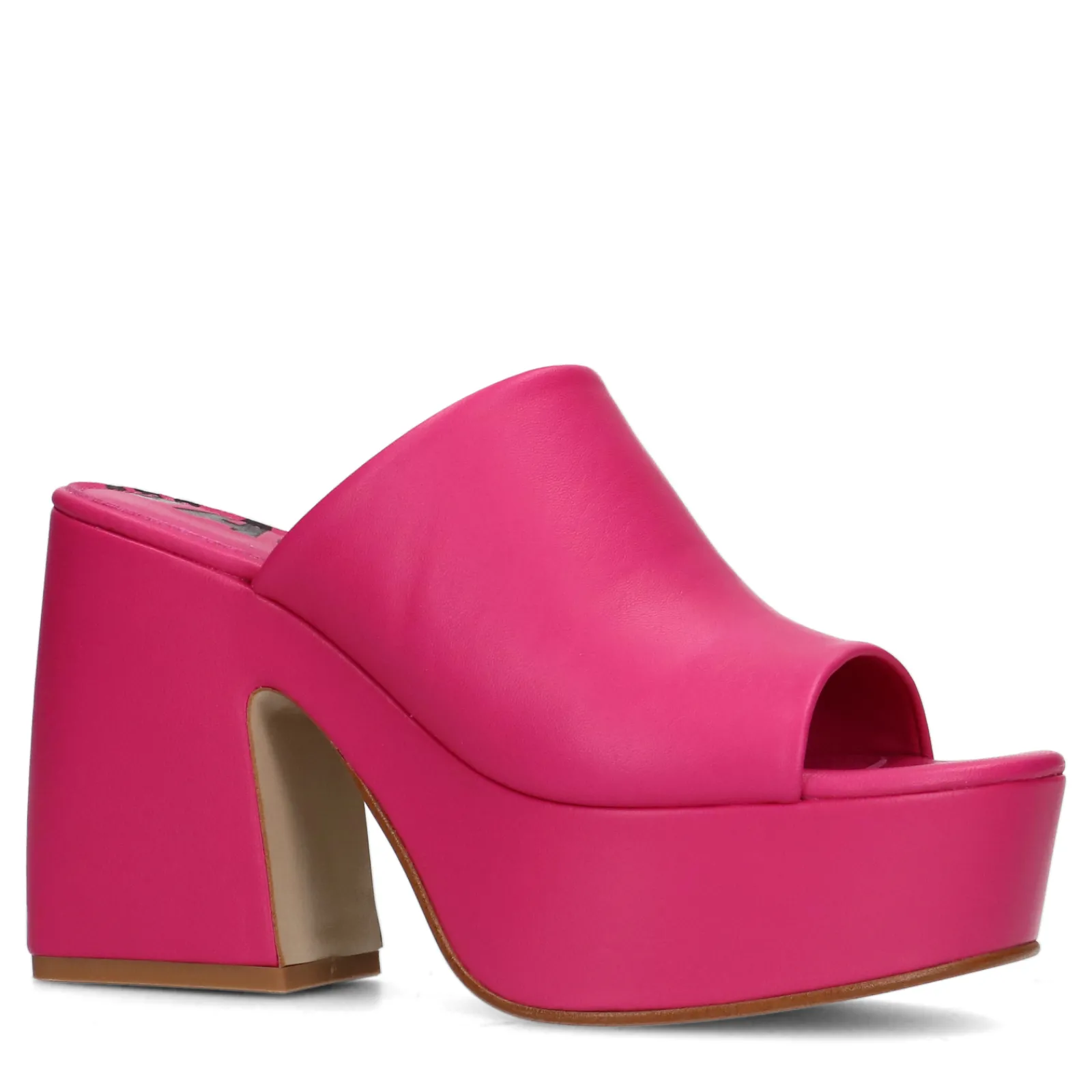 High In The Sky Met Deze Fuchsia Roze Leren Muiltjes Van Sacha! Deze Muil Slippers Met Brede Band Hebben Een Chunky Plateau Hak Van 11 Cm Hoog En Een Plateau Zool Van 4 Cm. Bescherm En Verzorg Je Muiltjes Met De Juiste Onderhoudsproducten!