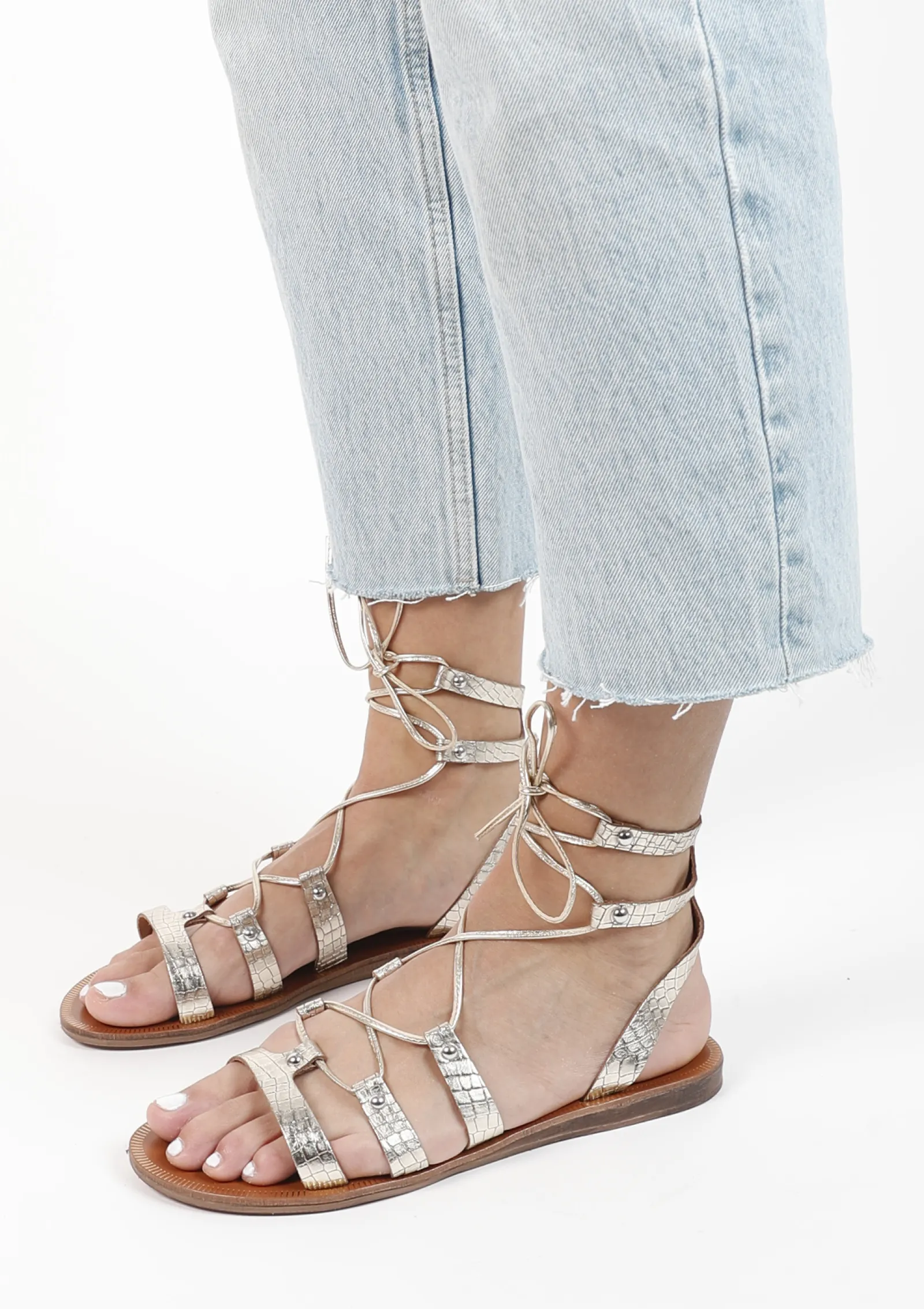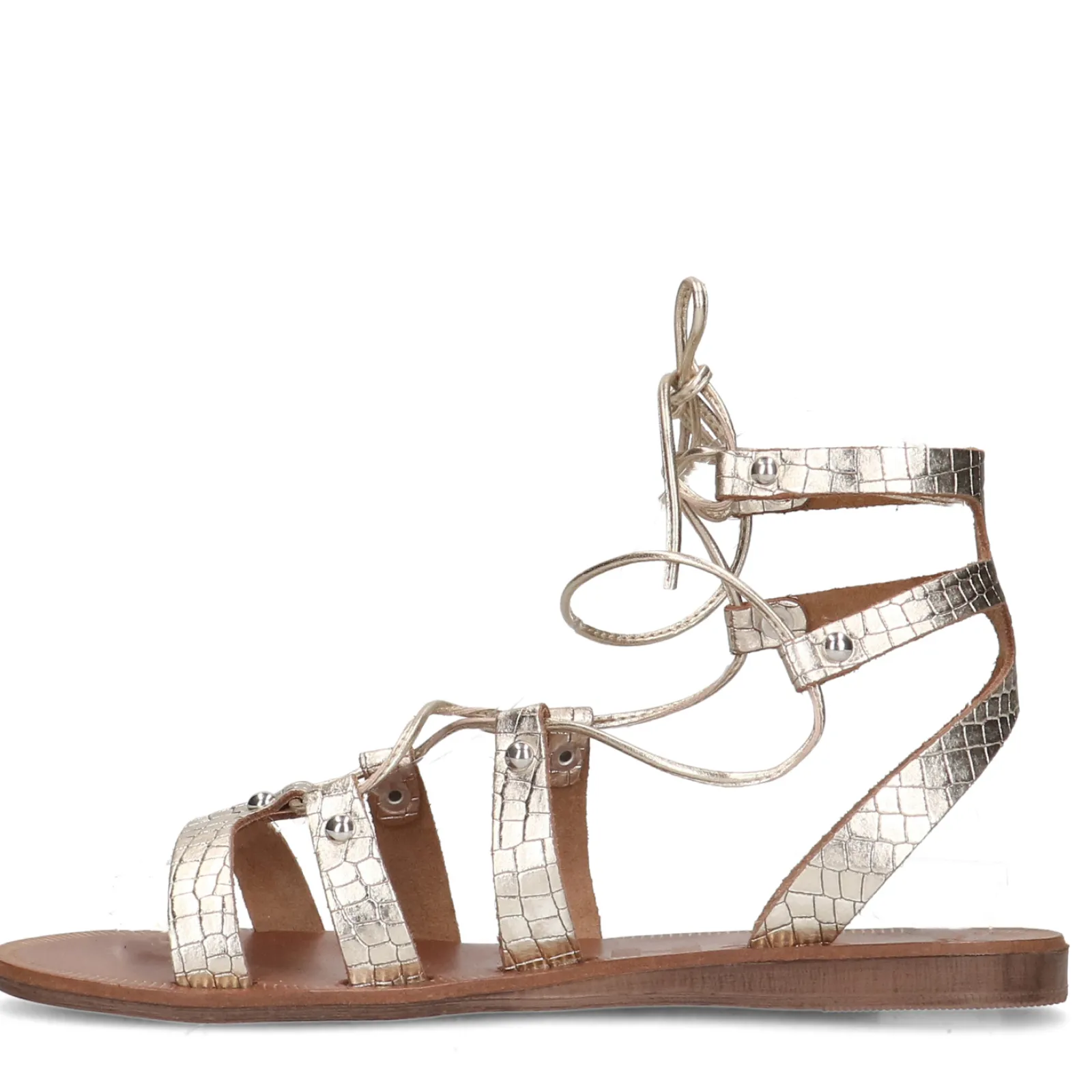 Deze Sandalen Van Sacha Zijn Goudkleurig En Hebben Een Subtiele Crocoprint. De Schoenen Zijn Met Goudkleurige Veters Te Strikken En Hebben Aan De Achterkant Een Kleine Hakverhoging Van 1 Cm. De Sandalen Zijn Aan De Buitenkant Gemaakt Van Leer. Maak Gebruik Van De Juiste Onderhoudsproducten!