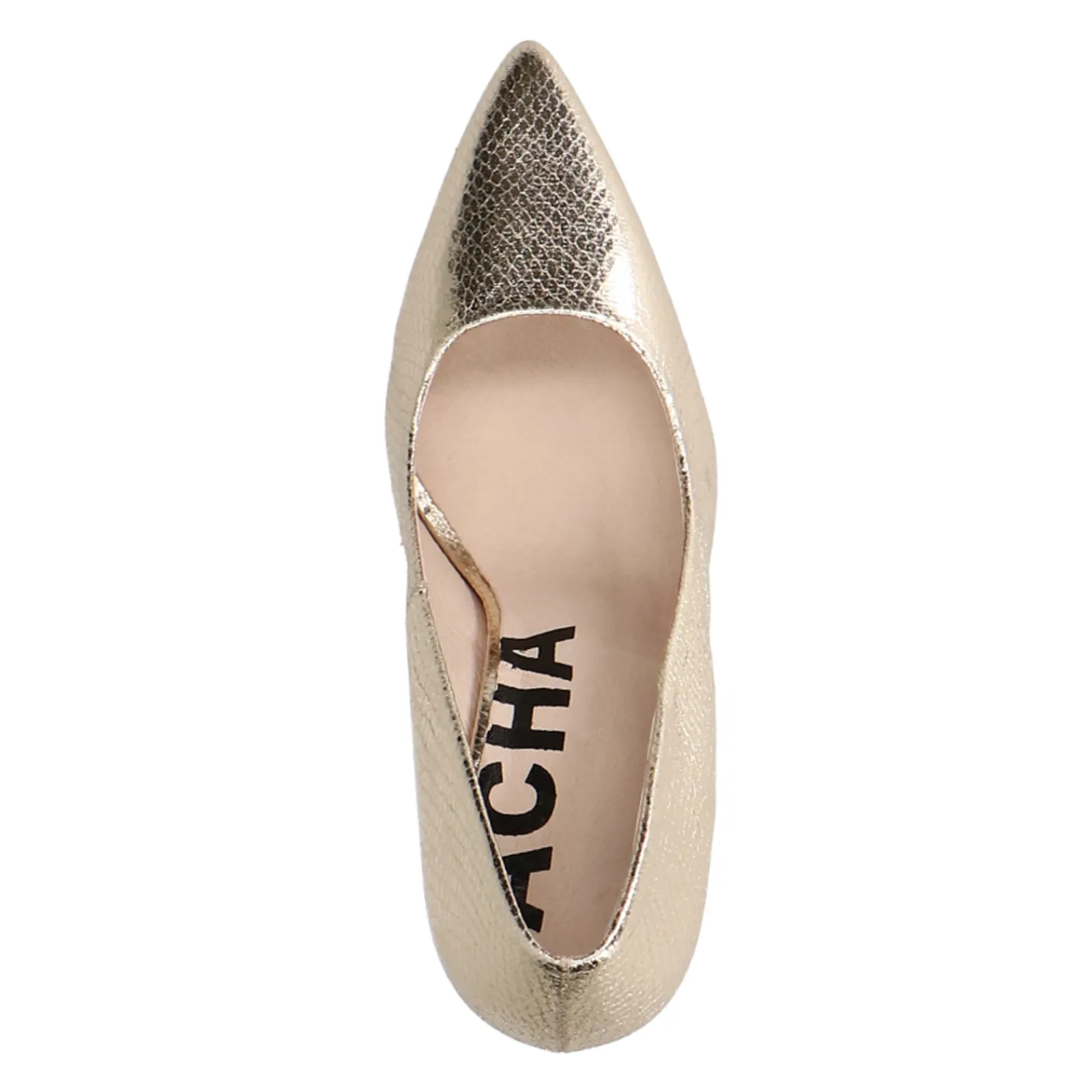 Deze Goudkleurige Pumps Van Sacha Hebben Een Glinsterend Metallic Croco Patroon. De Pumps Hebben Een Puntige Neus En Een Naaldhak Van 11 Cm Hoog. De Binnenkant Is Gemaakt Van Leer En De Buitenkant Van Synthetisch Materiaal. Maak Gebruik Van De Juiste Onderhoudsproducten!