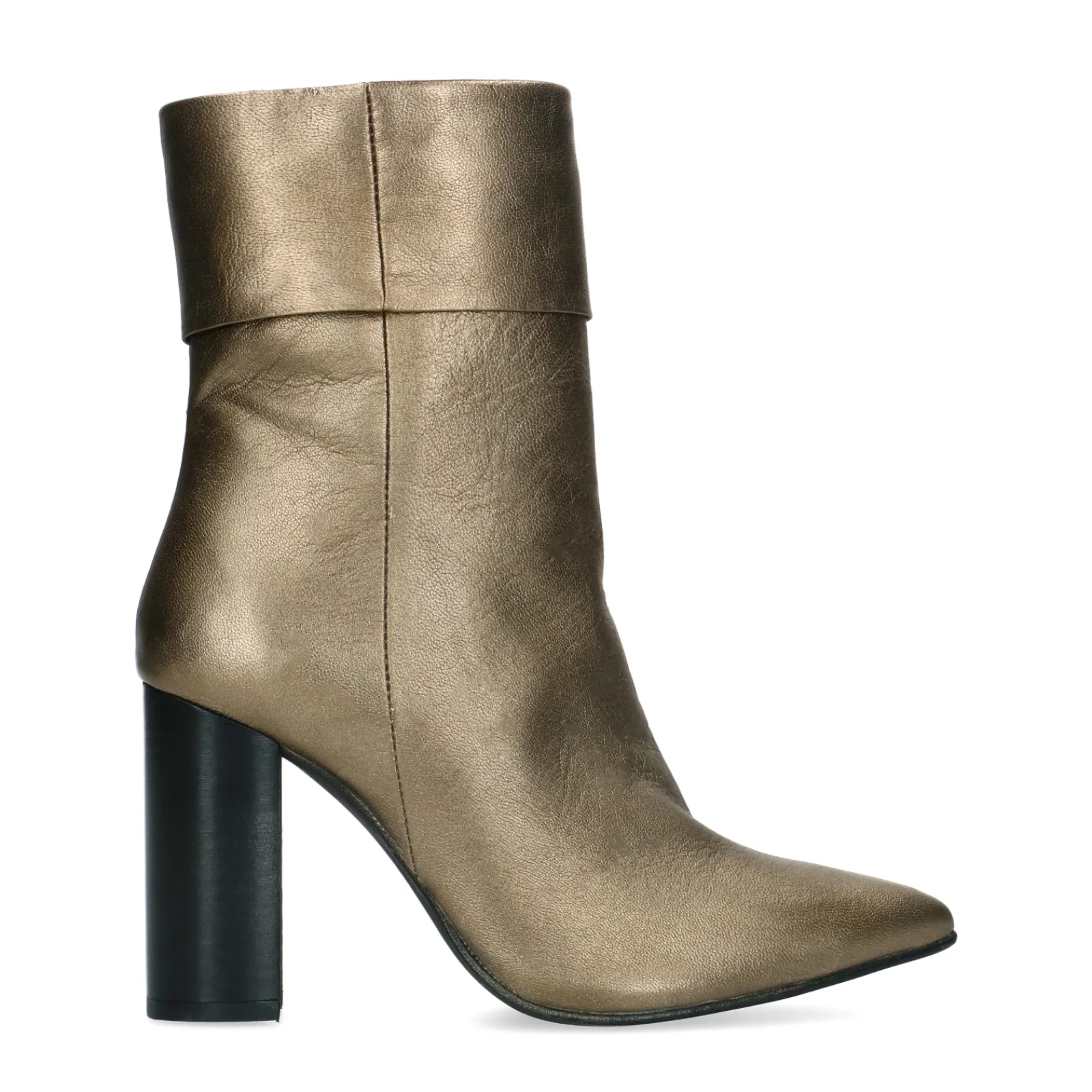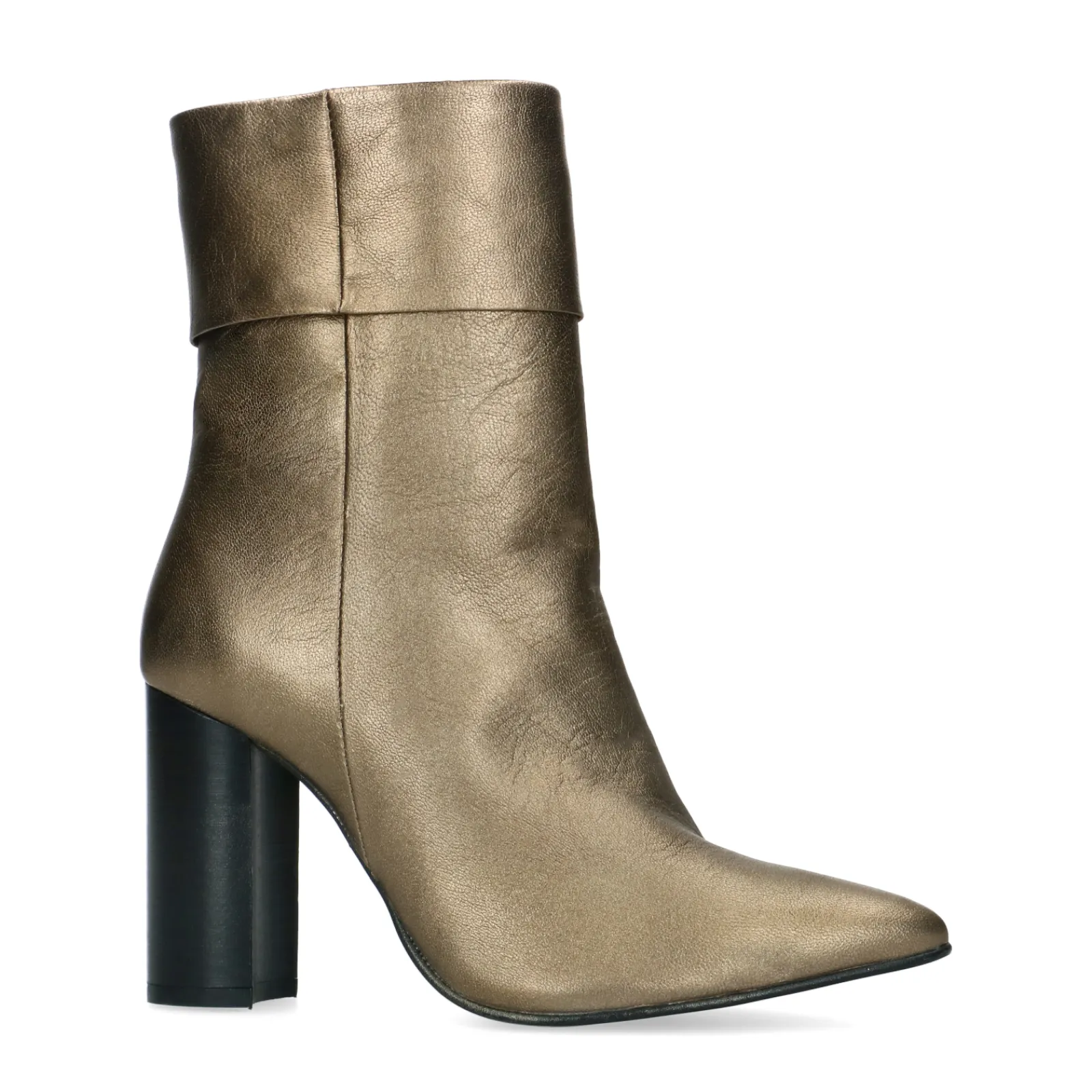 Deze Goudkleurige Enkellaarsjes Met Hak Van Sacha Hebben Matte Metallic Finish. De Laarsjes Hebben Aan De Bovenkant Een Omslageffect En Een Handige Rits Aan De Binnenzijde. Hiernaast Hebben De Laarsjes Een Schachthoogte Van 16 Cm, Een Schachtomtrek Van 30 Cm En Een Rechte Hak Van 9 Cm Hoog. Maak Gebruik Van De Juiste Onderhoudsproducten Om De Leren Binnen- En Buitenkant Te Onderhouden.