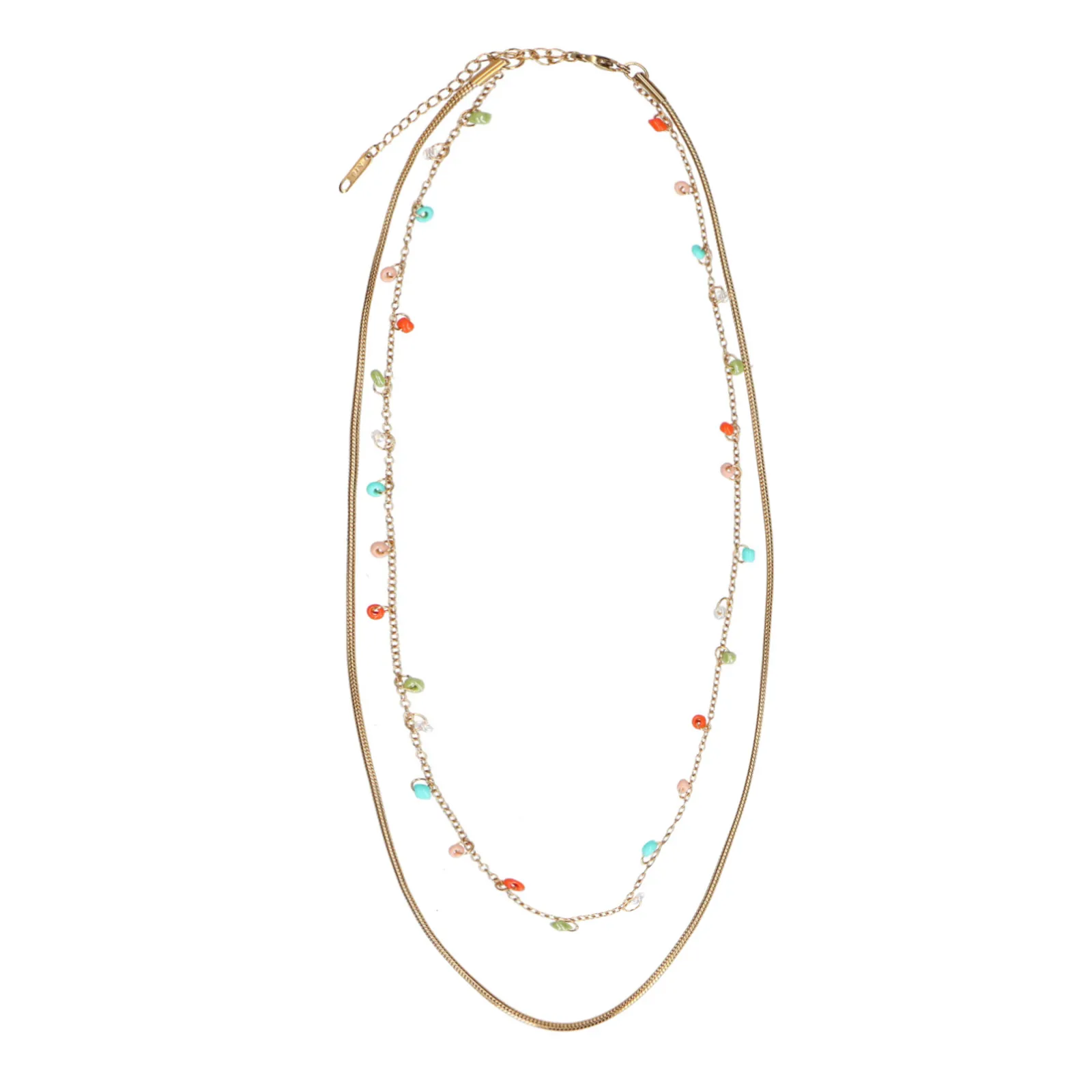 Deze Goudkleurige Ketting Van Sacha Is Gemaakt Van Stainless Steel En Heeft Een Combinatie Van Twee Kettingen. Een Dunne Afgeronde Dichte Schakel En Een Korte Ketting Met Kleine Kralen. De Ketting Heeft Een Totale Lengte Van 47 Cm.
