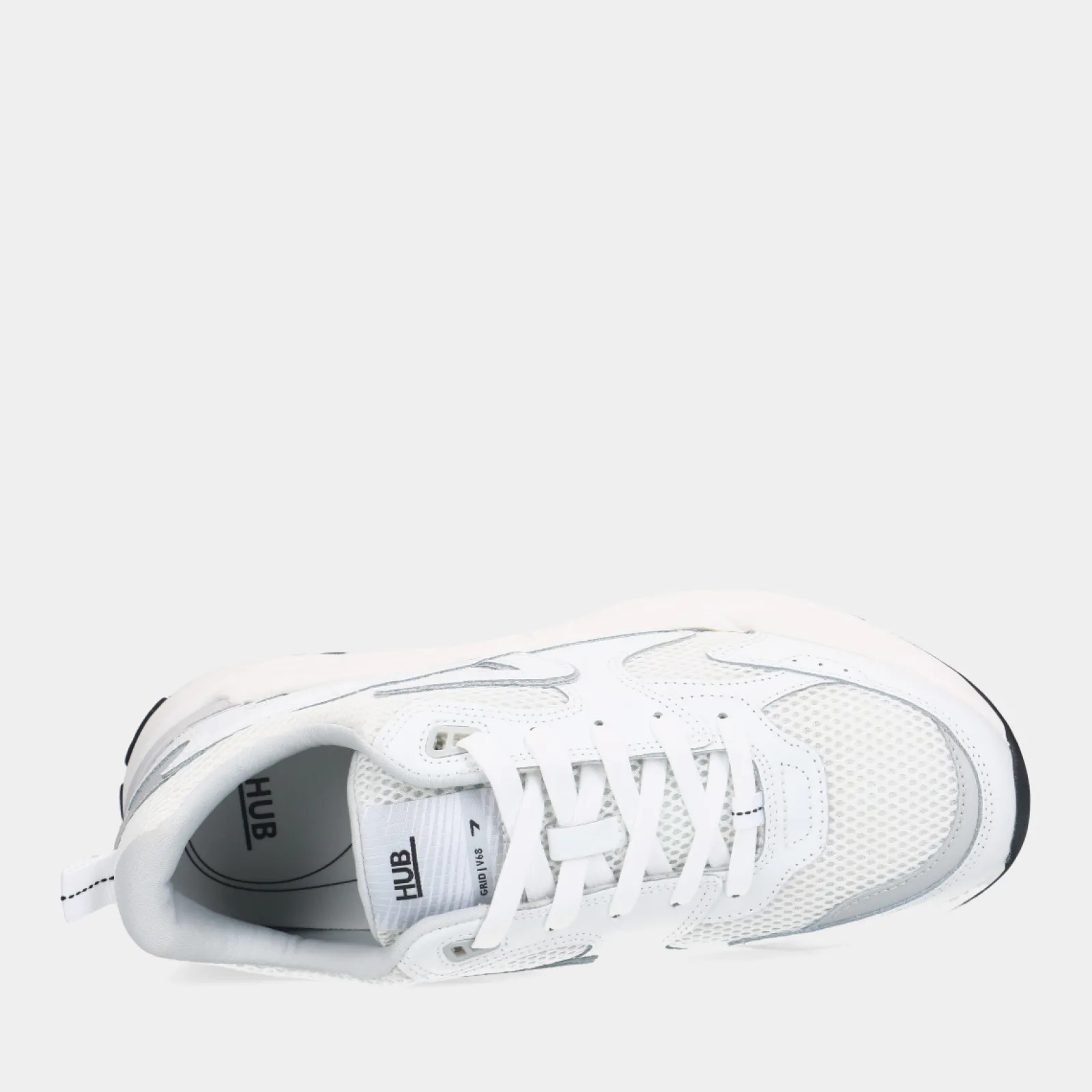 Grid-M L26 White Heren Sneakers Van Het Merk Hub. De Lage Sneakers Hebben Een Tijdloos En Sportief Uiterlijk Dankzij De Mix Van Ademend Mesh, Witte En Grijze Kleuraccenten En Een Golvende Platform Zool Van 4 Cm Dik. De Zijkant Van De Hub Grid-M L26 Sneakers Bevat Het Iconische Z-Stitch Logo. Het Bovenwerk Bestaat Uit Zowel Leer Als Mesh Gemaakt Van 100% Gerecycled Nylon. De Heren Sneakers Hebben Een Eva Zool Met Gel-Insole Voor Extra Comfort.