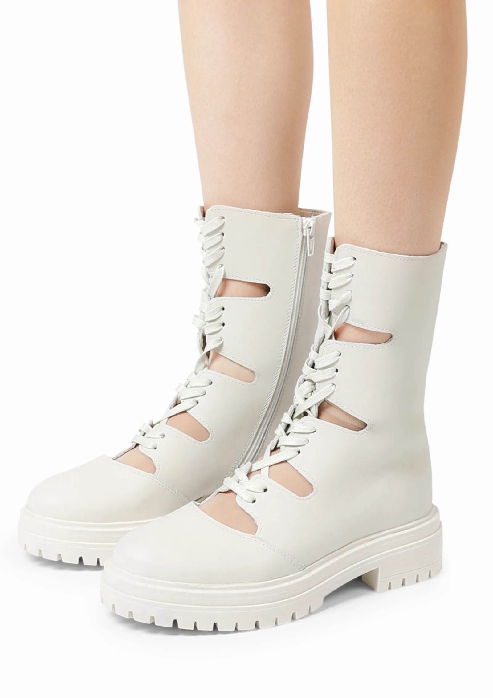 Deze Latte Leren Boots Hebben Stoere Cut Outs Aan De Voorkant. De Laarsjes Hebben Een Hakhoogte Van 4 Cm, Een Schachthoogte Van 19 Cm En Een Schachtomtrek Van 29 Cm. Verzorg De Laarzen Met Pure Protect Voor Langdurig Draagplezier.
