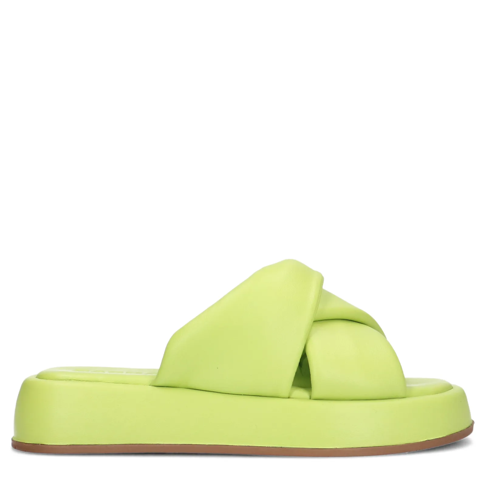 Ga Voor Een Opvallende Summer Look Met Deze Limegroene Plateau Slippers Van Sacha! De Slippers Zijn Volledig Gemaakt Van Leer En Hebben Twee Brede Gekruiste Banden. De Slippers Hebben Een Plateauzool Van 3 Cm Dik Met Een Licht Verhogende Hak Van 4 Cm. Maak Gebruik Van De Juiste Onderhoudsproducten!