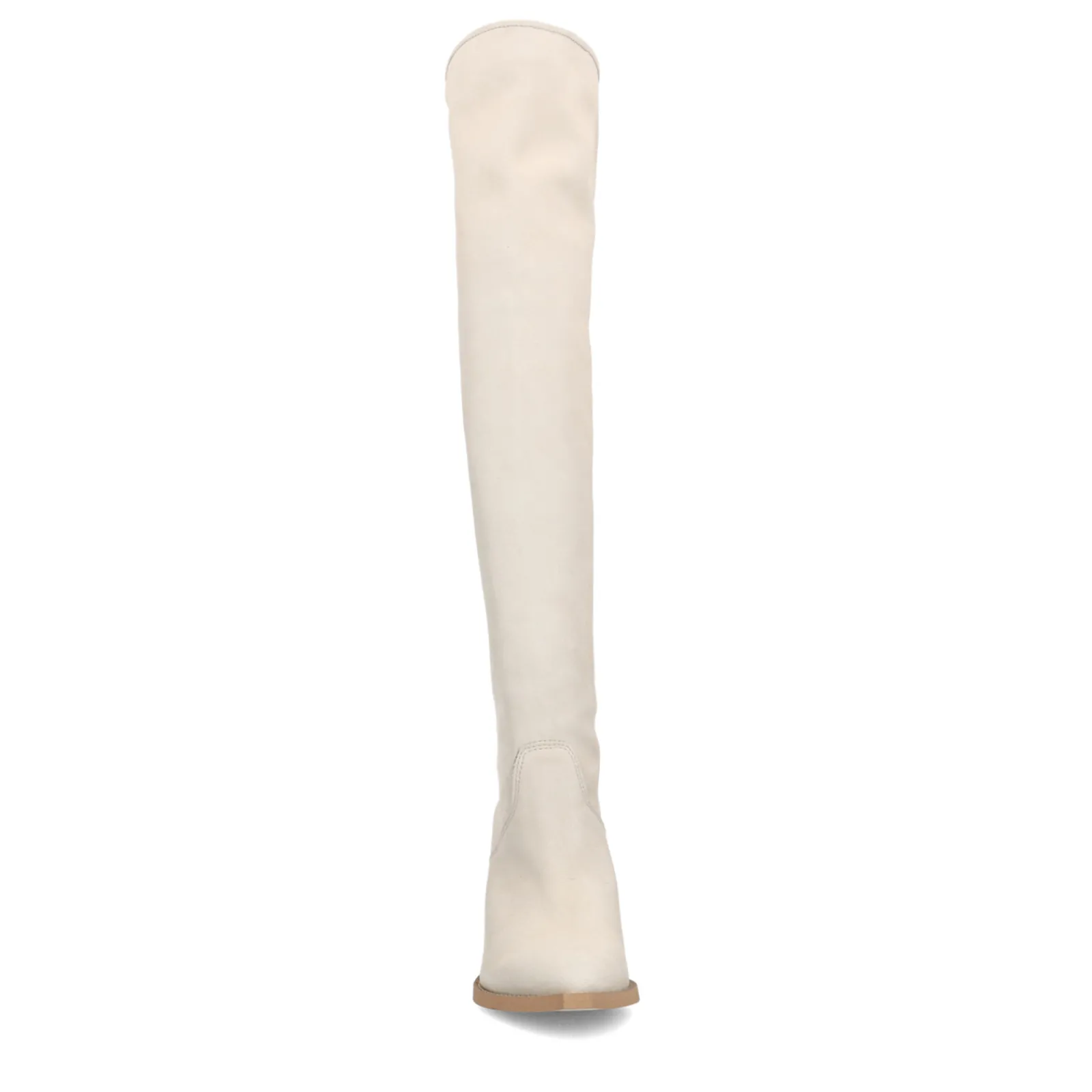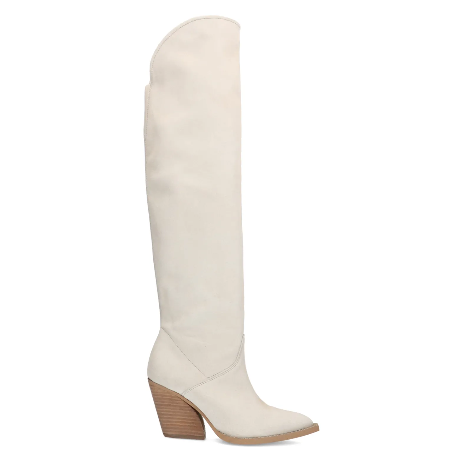 Deze Off White Cowboylaarzen Hebben Een Afzak Effect Bij De Schacht. De Laarzen Komen Net Tot Over De Knie En Hebben Elastiek Aan De Achterkant Waardoor Je Er Gemakkelijk Instapt. De Cowboylaarzen Zijn Volledig Gemaakt Van Suede. De Laarzen Hebben De Kenmerken Van Een Cowboylaars Door De Punten Neus En De Schuine Western Hak Van 9 Cm Hoog. De Laarzen Hebben Een Schachthoogte Van 56 Cm En Een Schachtomtrek Van 37 Cm. Maak Gebruik Van De Juiste Onderhoudsproducten.