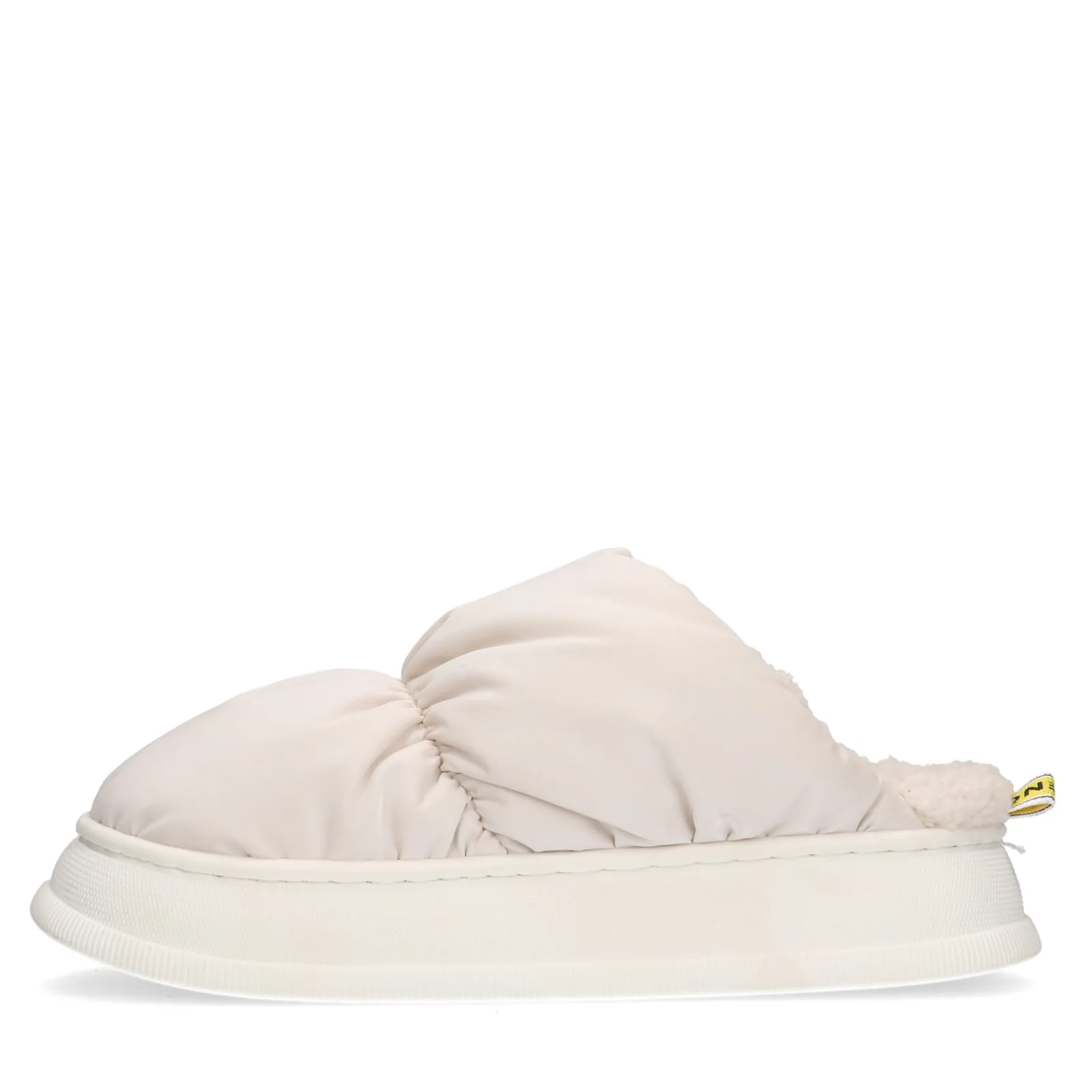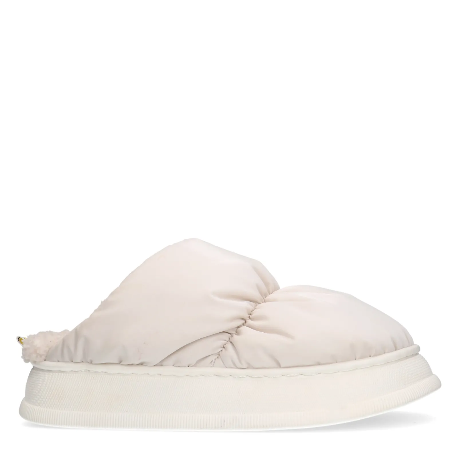 Off White Instappers Met Platform Zool Van Sacha. De Trendy En Comfortabele Slides Hebben Een Gestikte Puffy Upper Van Textiel, Een Binnenvoering Van Imitatiebont En Een Platform Zool Van 3 Cm. De Instappers Zijn Zowel Binnens- Als Buitenhuis Te Dragen! Verkrijgbaar In 3 Maten.