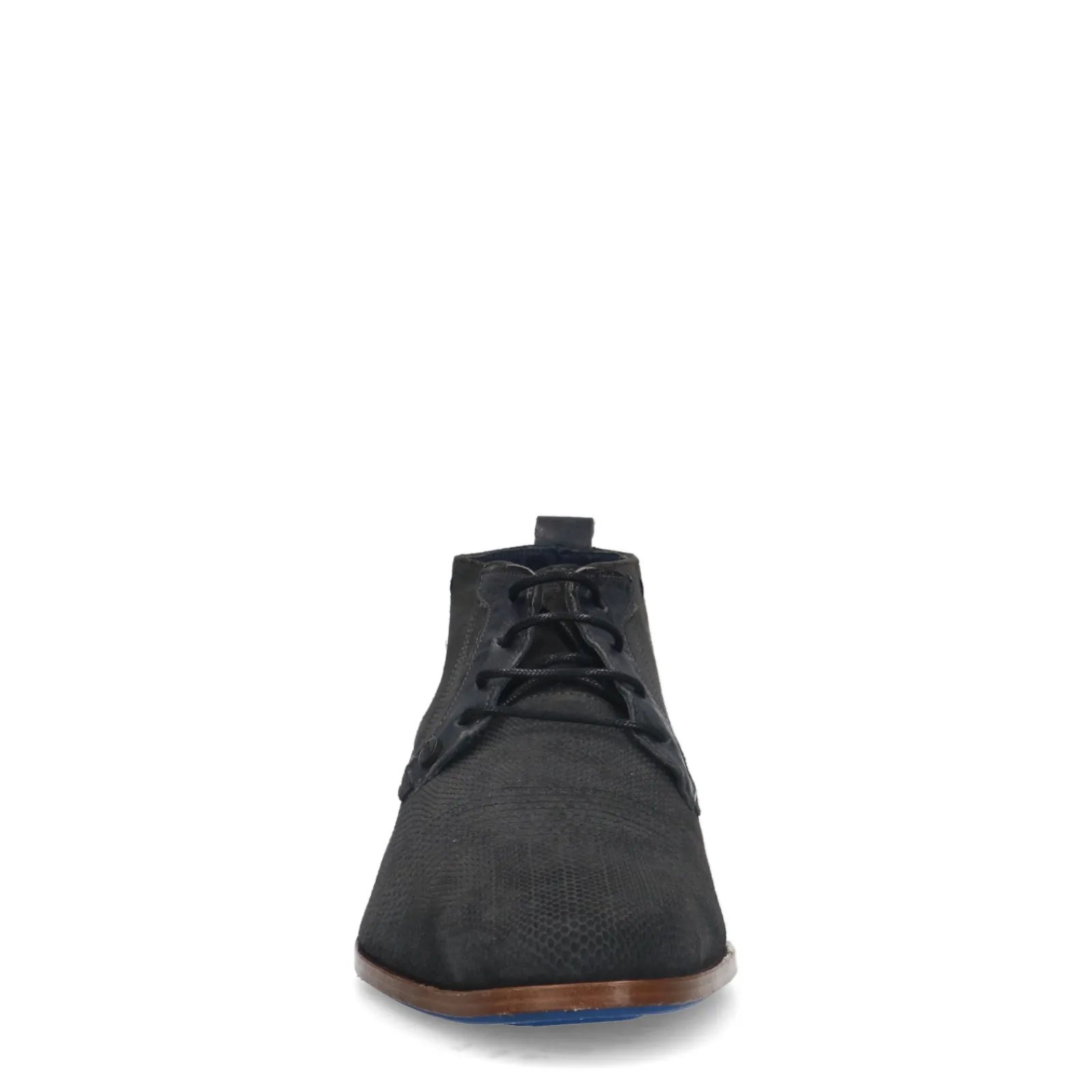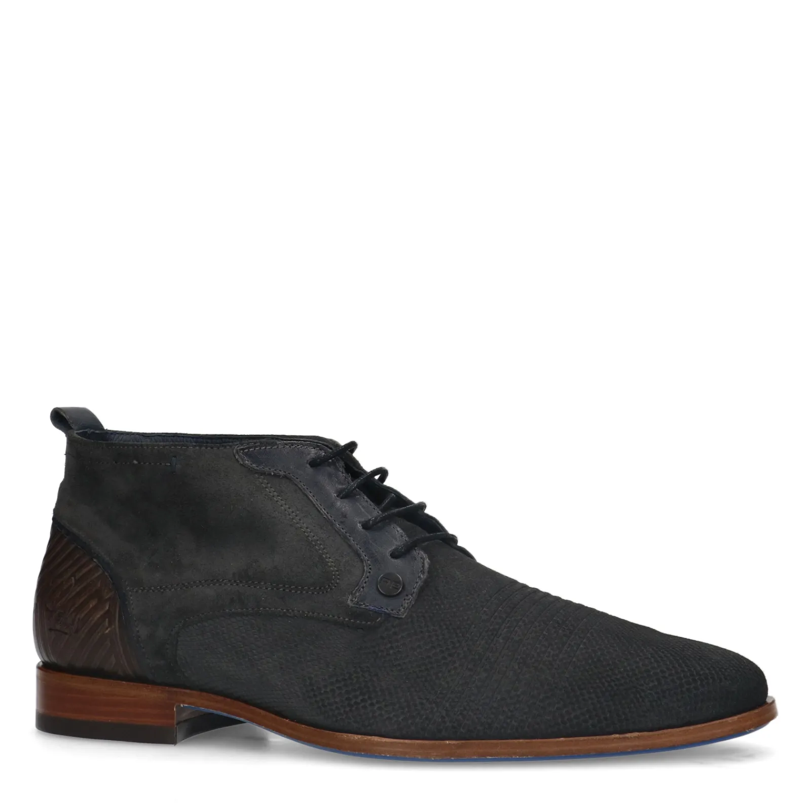 Donkerblauwe Halfhoge Veterschoenen Met Subtiele Print En Bruine Hielcap Van Het Merk Rehab. De Veterschoenen Zijn Aan D…