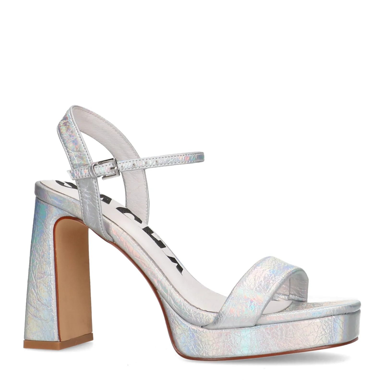Deze Zilverkleurige Sandalen Van Sacha Zijn Echte Eyecatchers! De Sandalen Hebben Een Metallic Finish Waardoor Ze Extra Shinen. De Hak Heeft Een Hoogte Van 10 Cm Met Een Plateau Zool Van 2 Cm. De Sandalen Hebben Een Smal Bandje En Sluiten Middels Een Enkelbandje Met Zilverkleurige Gesp. De Binnen- En Buitenzijde Zijn Gemaakt Van Synthetisch Materiaal. Maak Gebruik Van De Juiste Onderhoudsproducten!