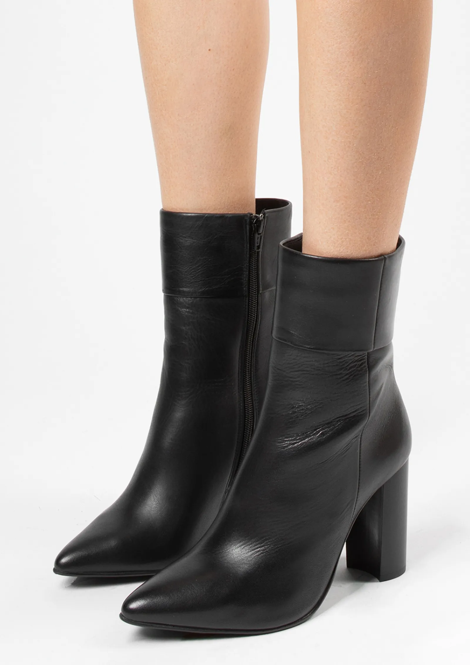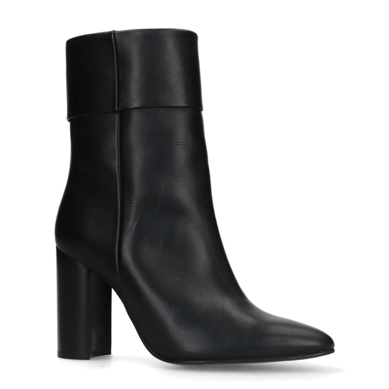 Zwarte Enkellaarsjes Uit De Women Essentials Collectie Van Sacha. De Puntneus, Het Gestikte Detail Aan De Bovenzijde En Blokhak Van 9 Cm Hoog Geven De Laarsjes Een Elegante Uitsraling. Zowel De Buiten- Als Binnenkant Zijn Gemaakt Van Leer. Draag De Laarsjes Onder Een Mom Jeans Met Een Mooie Top Of Een Leuk Jurkje. Maak Gebruik Van De Juiste Onderhoudsproducten Zoals De Colloni Carbon Pro Spray.