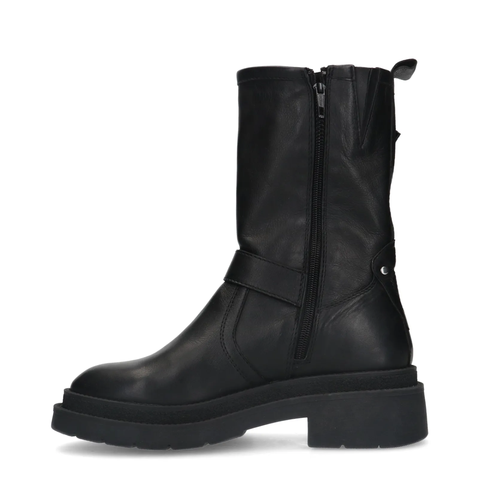 Zwarte Leren Enkellaarsjes Van Sacha Met Subtiele Biker Details. De Leren Enkellaarsjes Hebben Twee Zilverkleurige Buckl…