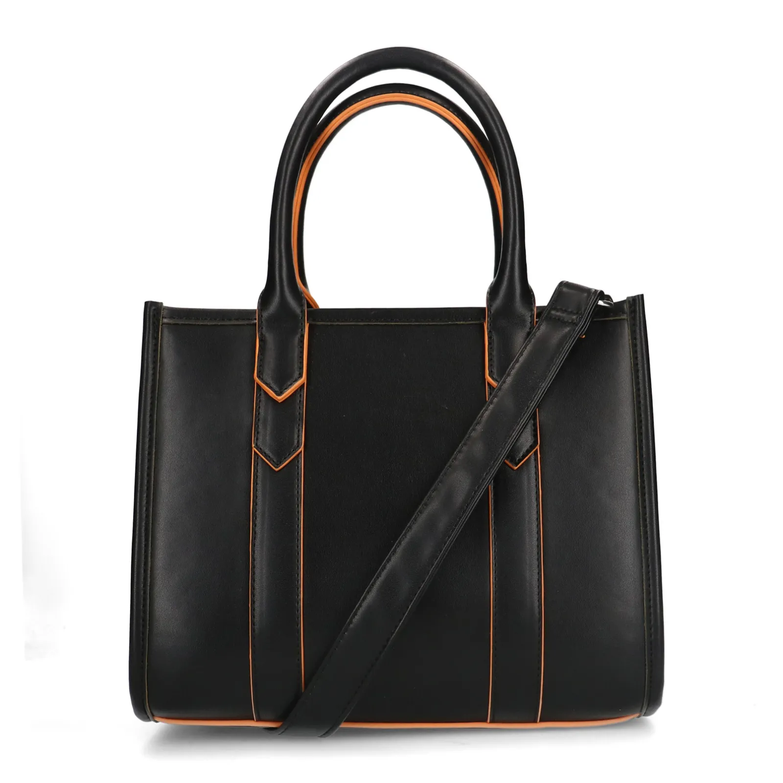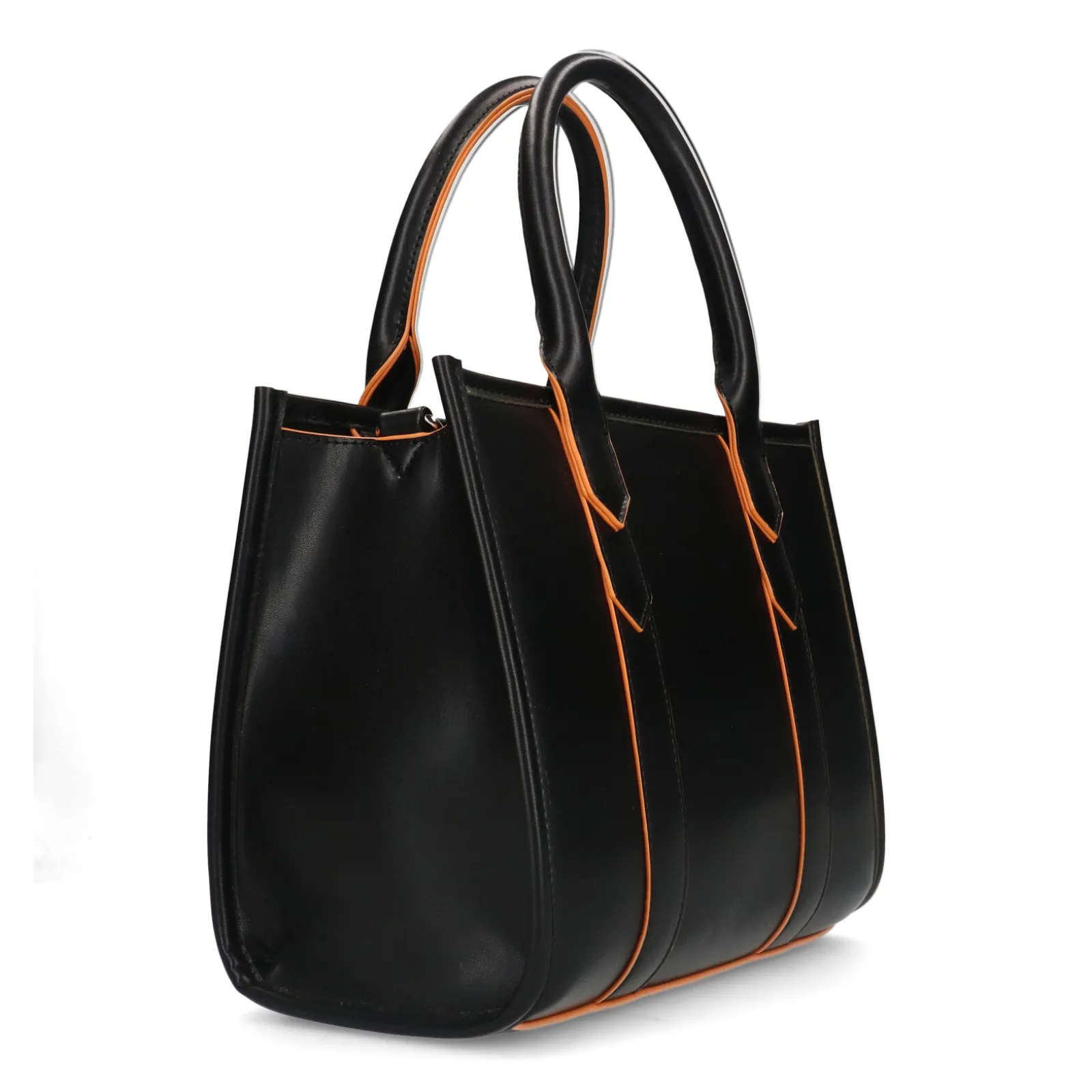 Ga Voor Een Statement Look Met Deze Trendy Zwarte Handtas Van Sacha! De Tas Heeft Een Basic Look Met Opvallende Maar Subtiele Oranje Details. Over De Tas Lopen Zwarte Gestikte Details Met Zwarte Handvaten Gecombineerd Met Een Optionele Verstelbare Schouderband. De Schouderband Heeft Een Lengte Van 97 Cm En De Tas Heeft Een Totale Afmeting Van 18X18X6 Cm (Hxbxd). De Handtas Heeft Een Klein Insteekvakje Aan De Binnenzijde En Sluite Middels Een Rits. Maak Gebruik Van De Juiste Onderhoudsproducten!