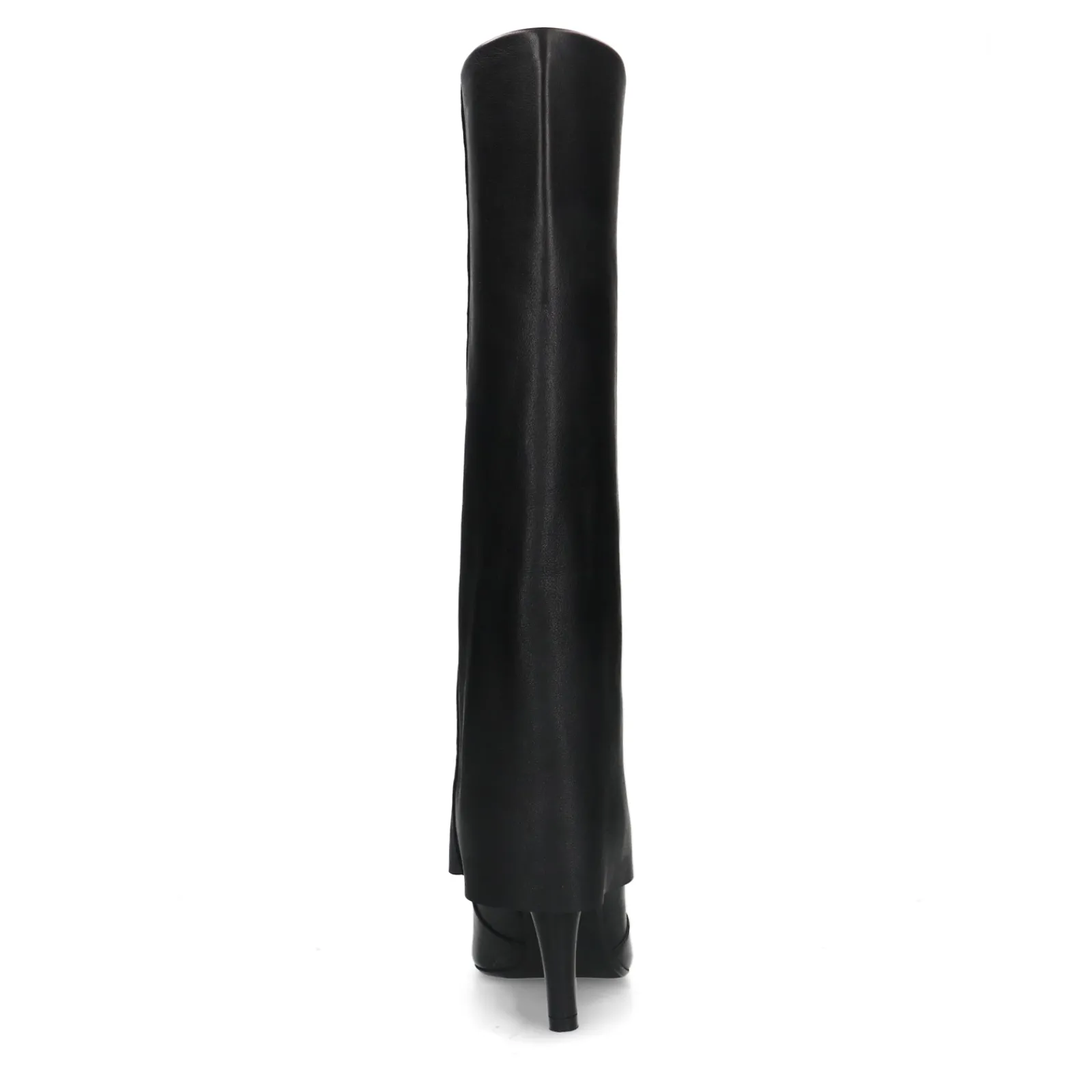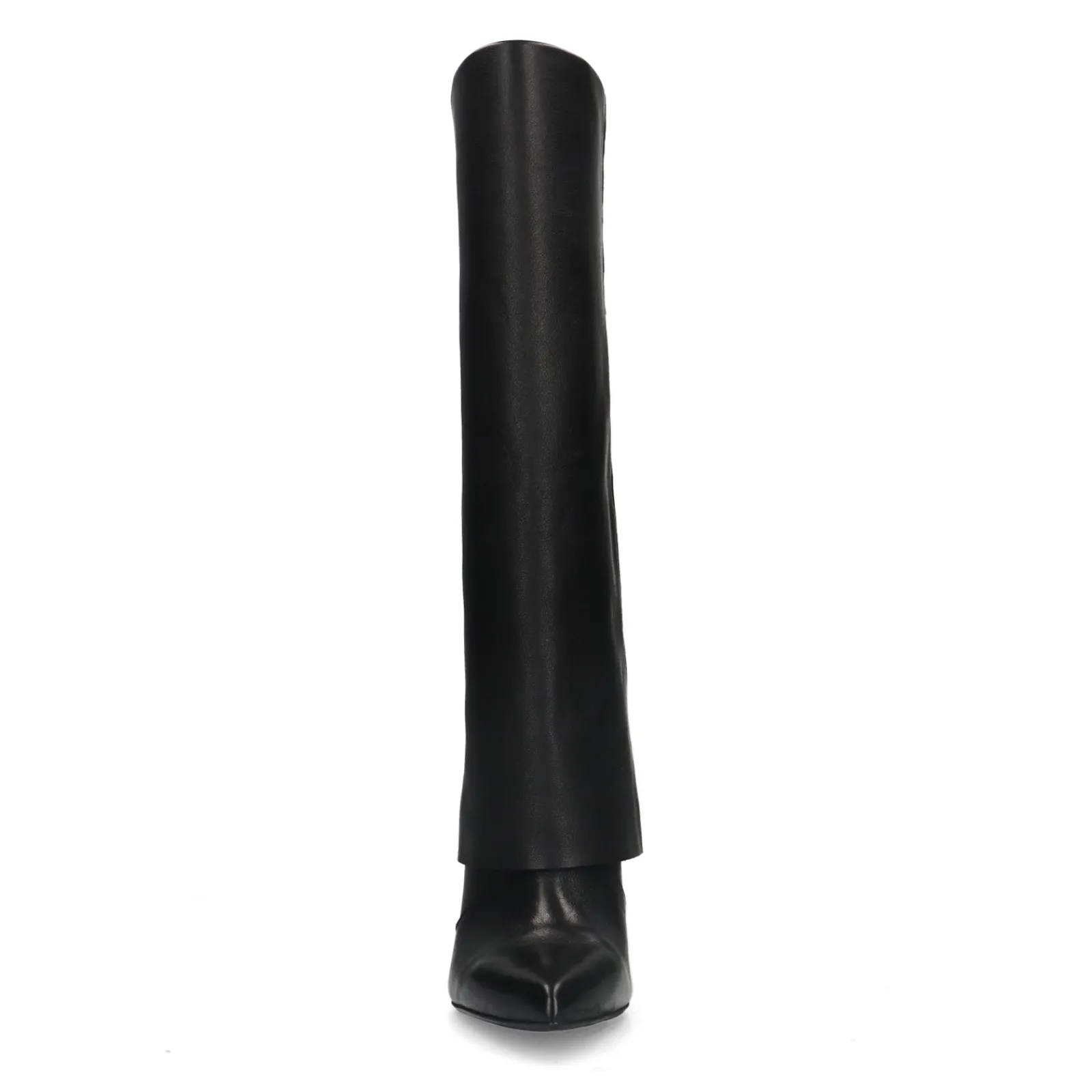 Deze Zwarte Leren Kniehoge Stiletto Boots Met Flap Van Sacha Hebben Een High Fashion Feeling! De Boots Zijn Geheel Gemaakt Van Leer En Hebben Een Omgevouwen Design. De Hoge Instaplaarzen Hebben Een Hak Van 9 Cm, Een Puntige Neus, Een Schachthoogte Van 40 Cm En Een Schachtomtrek Van 38 Cm. Maak Gebruik Van De Juiste Onderhoudsproducten.