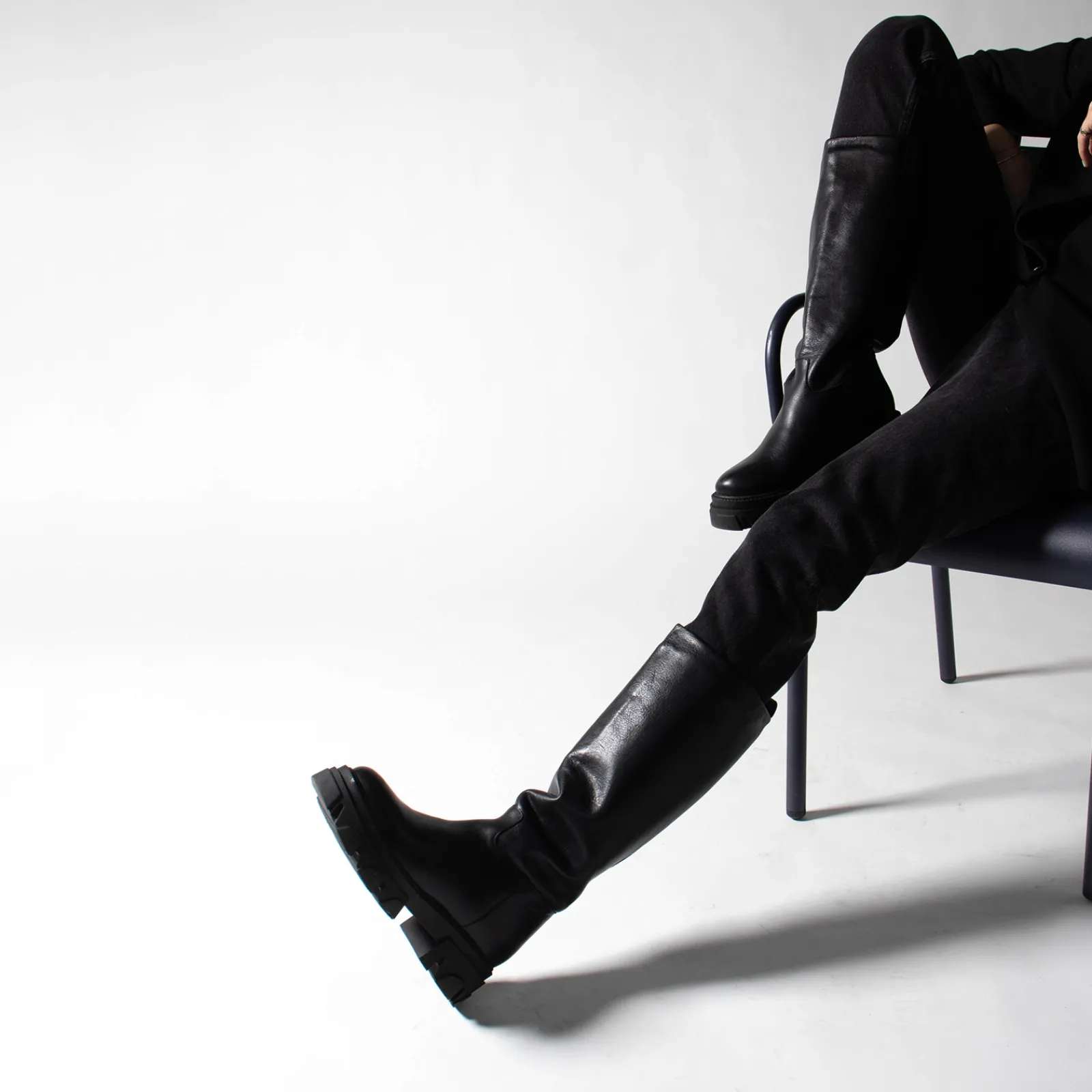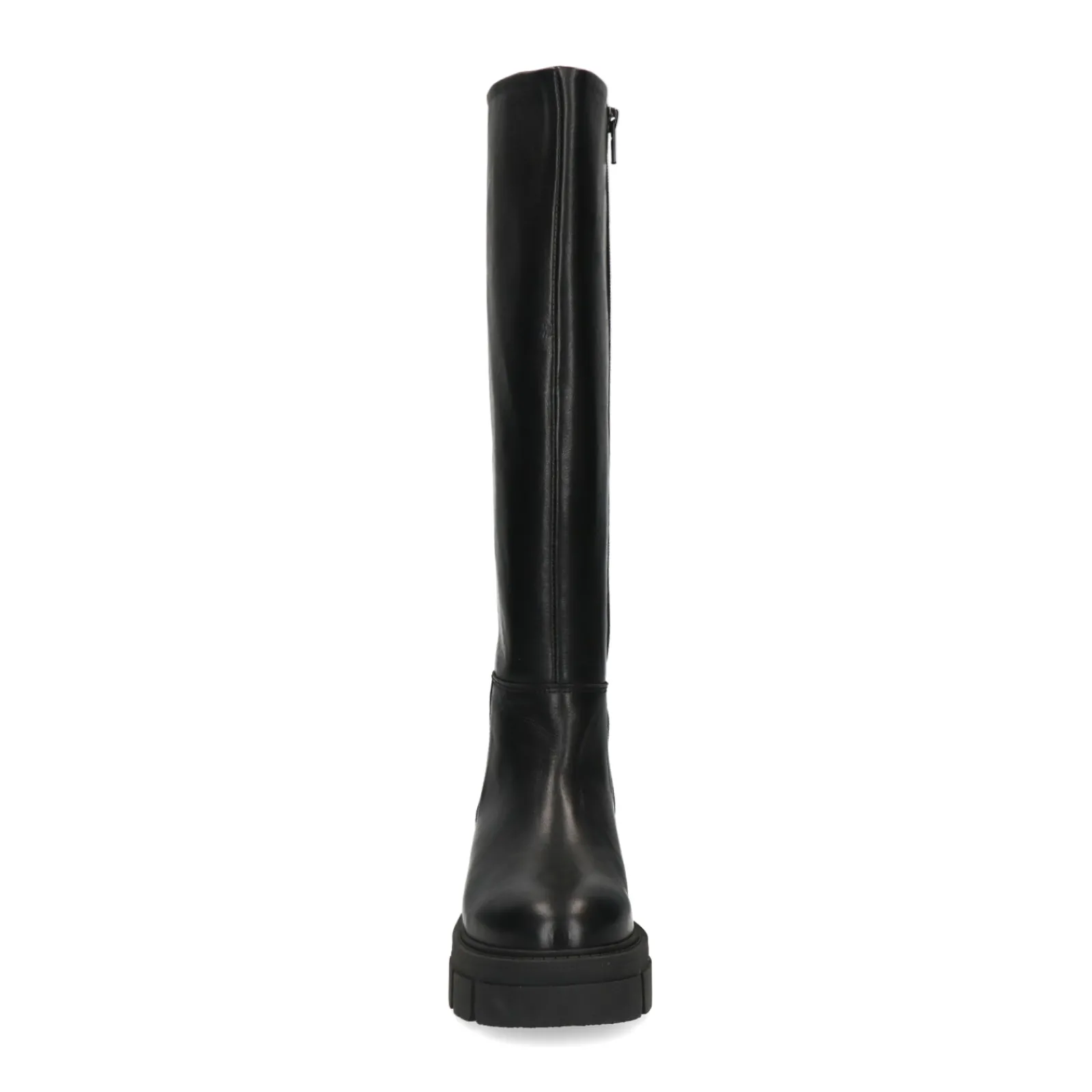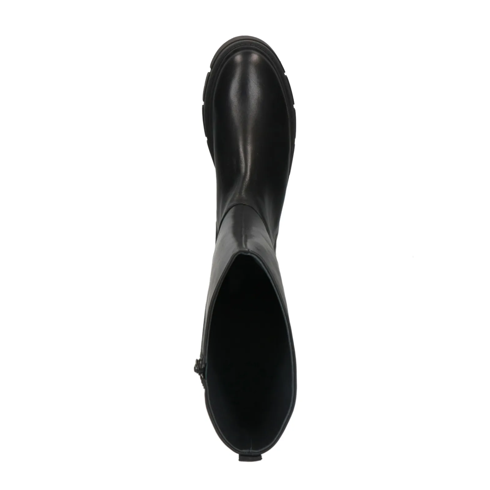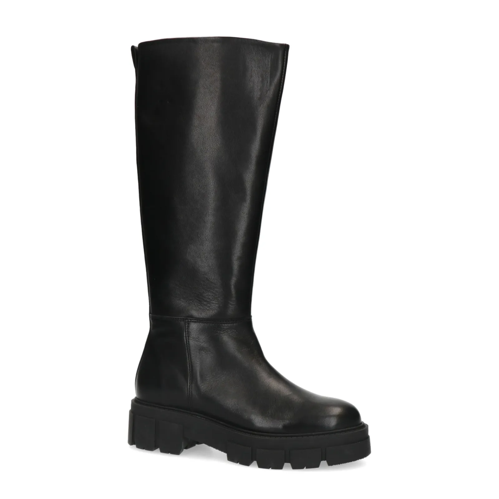 Zwarte Hoge Leren Boots Van Sacha. Deze Statement Laarzen Zijn Door De Grove Zool Een Mooie Toevoeging Aan Je Outfit! De Laarzen Hebben Een Plateauzool Van 3 Cm Hoog En Een Hakhoogte 4 Cm. Hierbij Een Schachtomtrek Van 36 Cm En Een Schachthoogte Van 39 Cm. Maak Gebruik Van De Juiste Onderhoudsproducten.