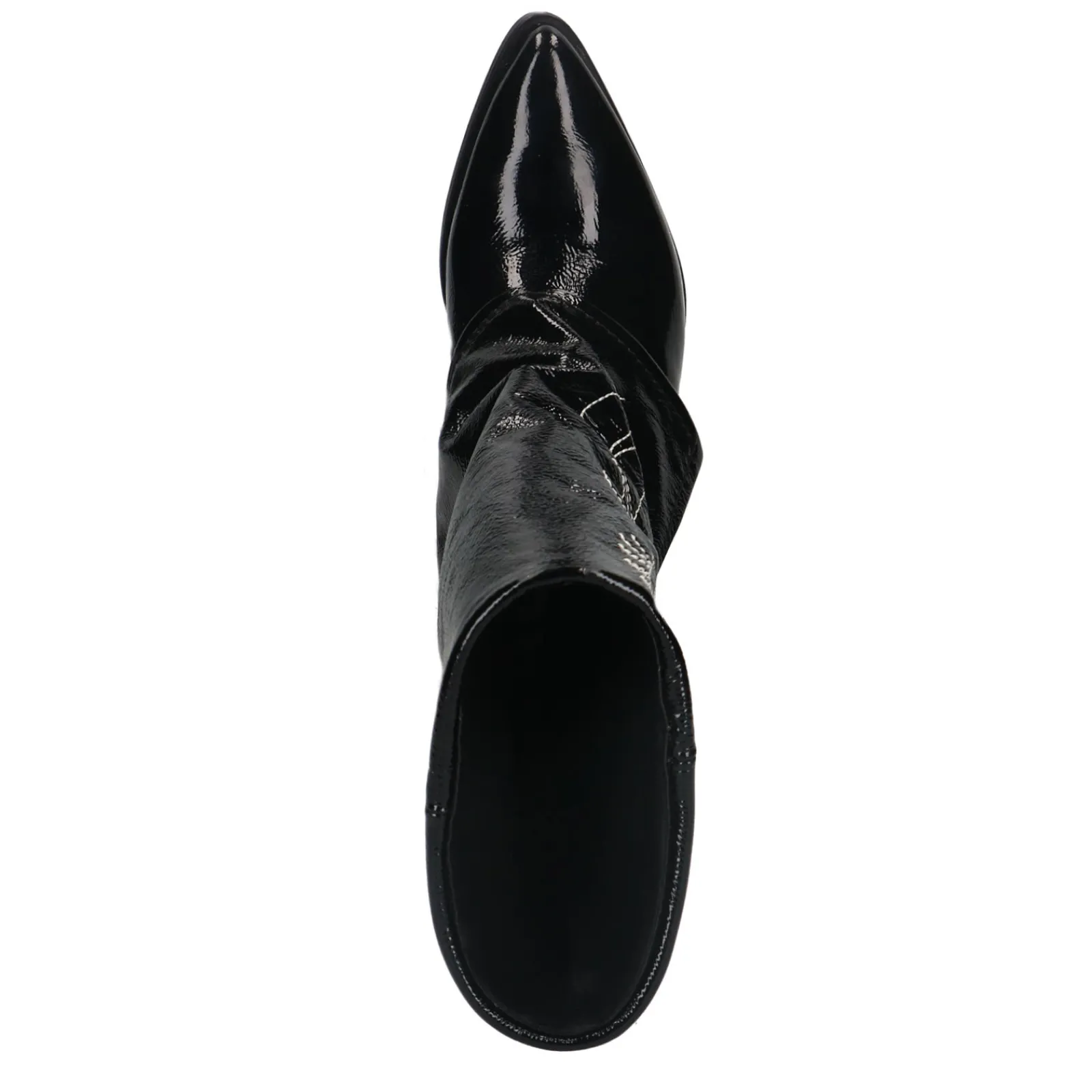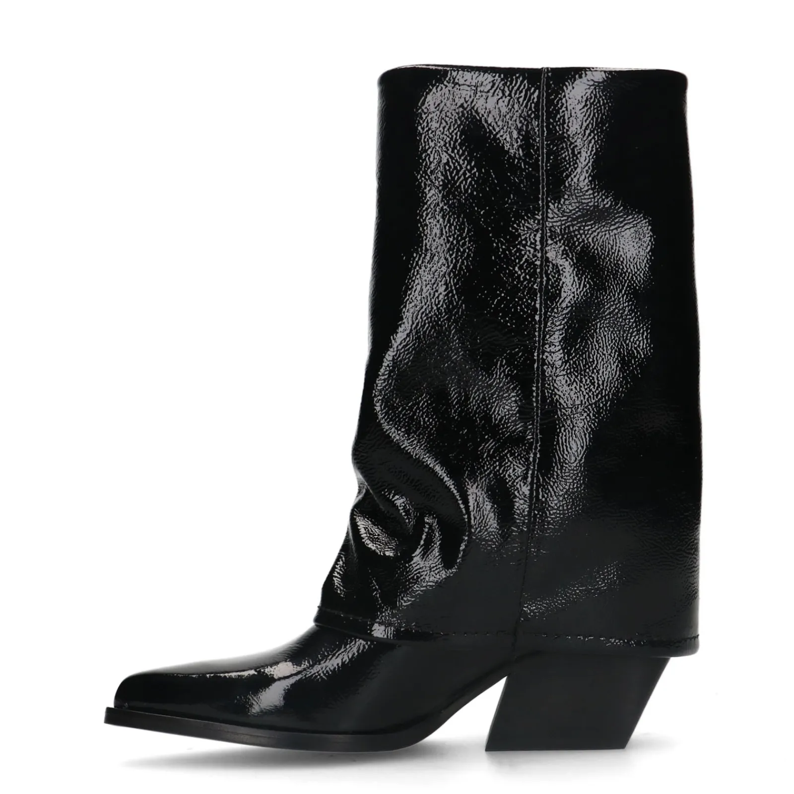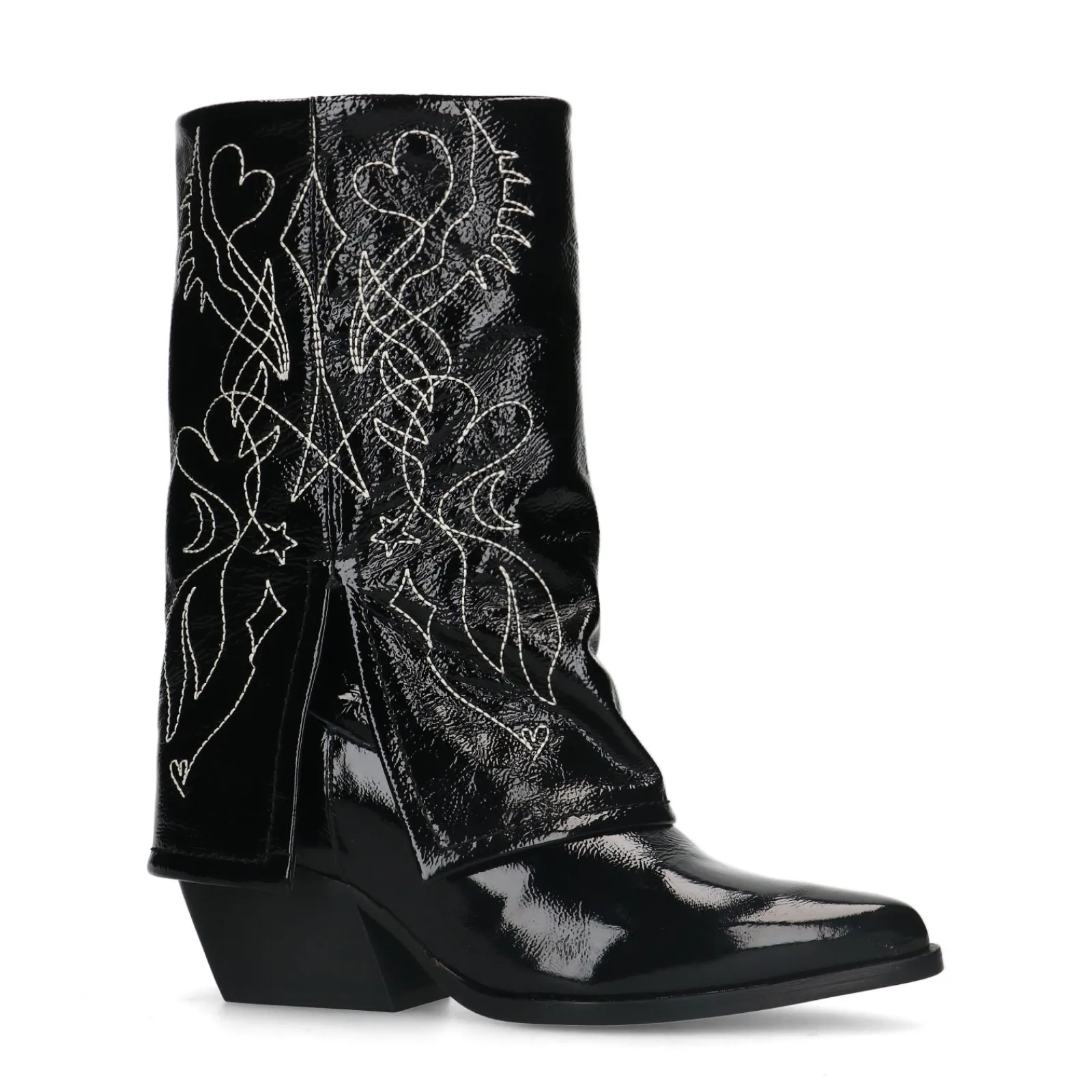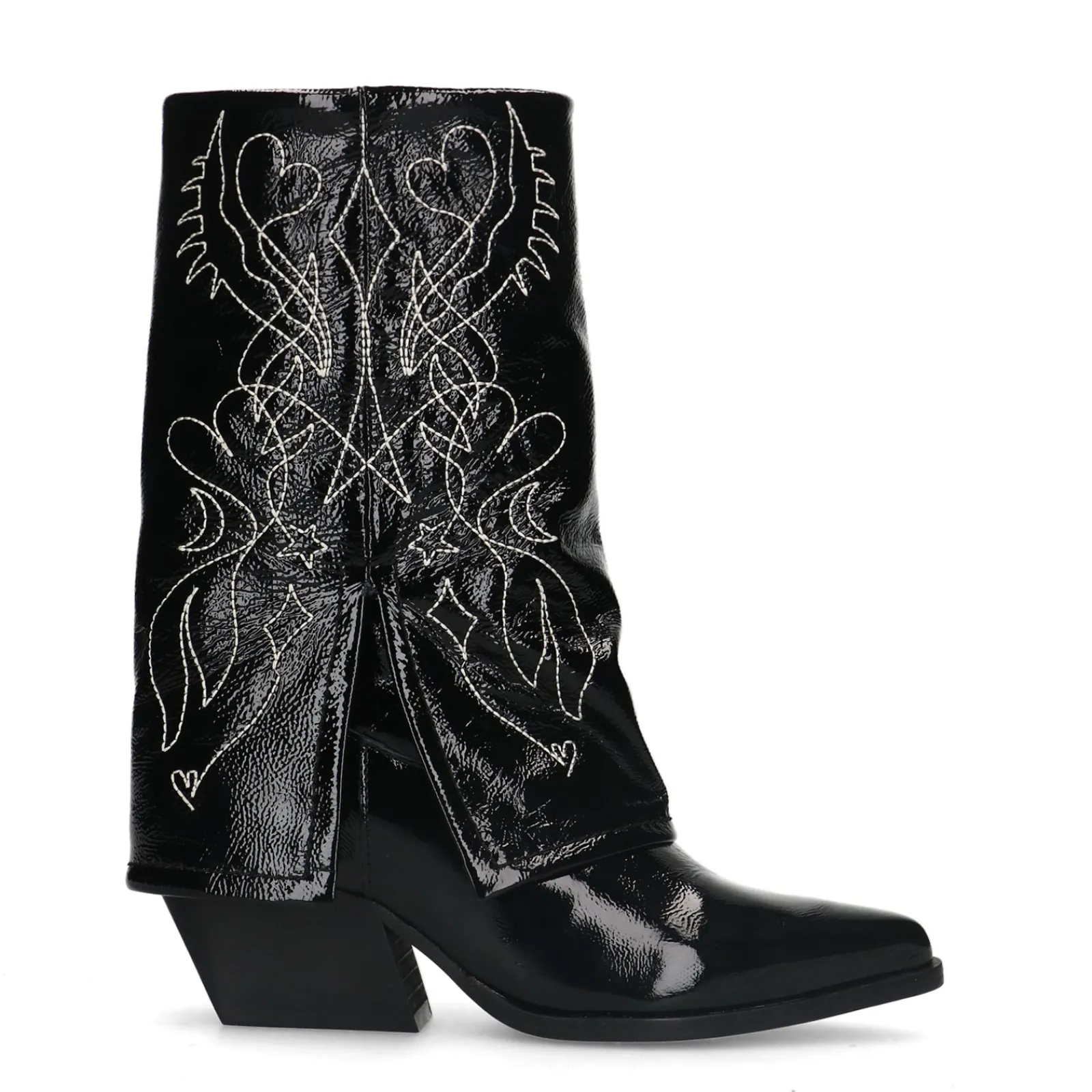 Deze Zwarte Lakleren Western Enkelboots Van Sacha Hebben Een Uniek Detail. De Omgevouwen Flap Creeert Een Afzak-Effect. De Laarzen Hebben Een Puntige Neus En Een Hak Met Een Hoogte Van 7 Cm. De Schachthoogte Is 22 Cm En De Schachtomtrek Meet 35 Cm. De Buitenkant Van De Enkellaarsjes Is Gemaakt Van Leer En Heeft Een Gaaf Design Met Witte Sierstiksels. Maak Gebruik Van De Juiste Onderhoudsproducten!