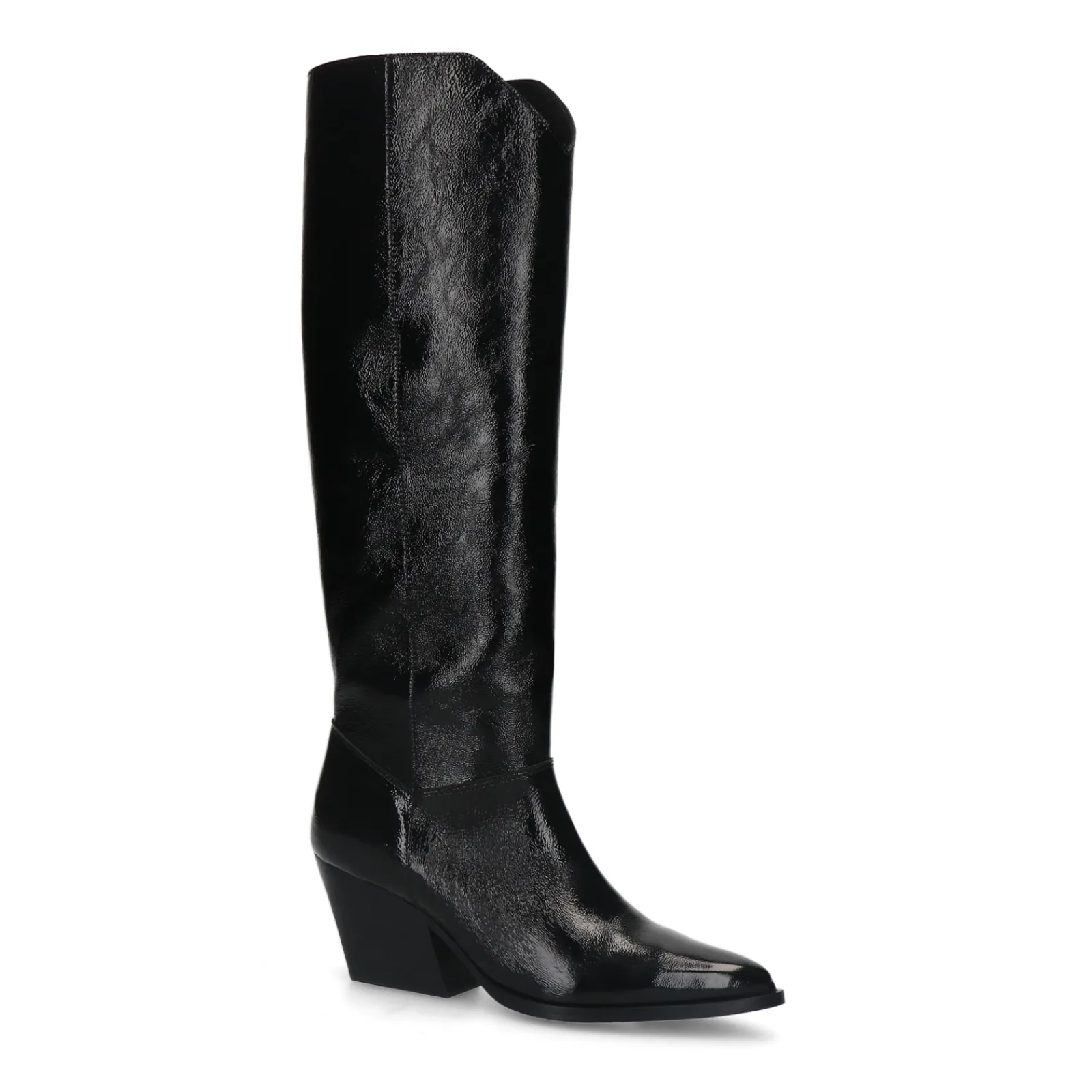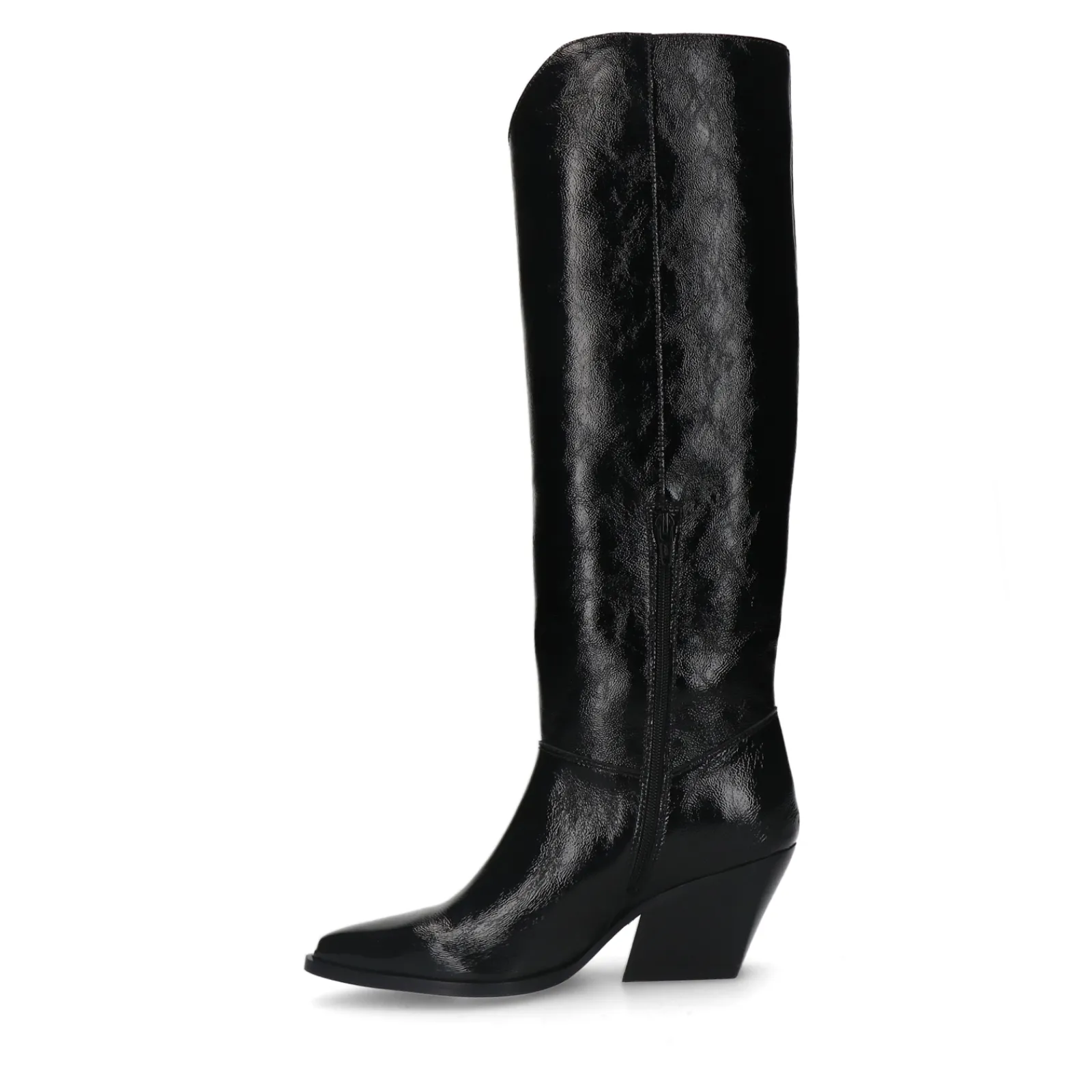 Lakleren Zwarte Cowboyboots Van Sacha Met Een Hogere Schacht! Deze Western Laarzen Hebben Een Minimal Design Met Een Puntige Neus, Schuine Hak Van 7 Cm En Een Korte Rits Aan De Binnenzijde. De Laarzen Zijn Aan De Buiten- En Binnenkant Gemaakt Van Lakleer. Hierbij Hoort Een Schachthoogte Van 40 Cm En Een Schachtomtrek Van 37 Cm. Maak Gebruik Van De Juiste Onderhoudsproducten.