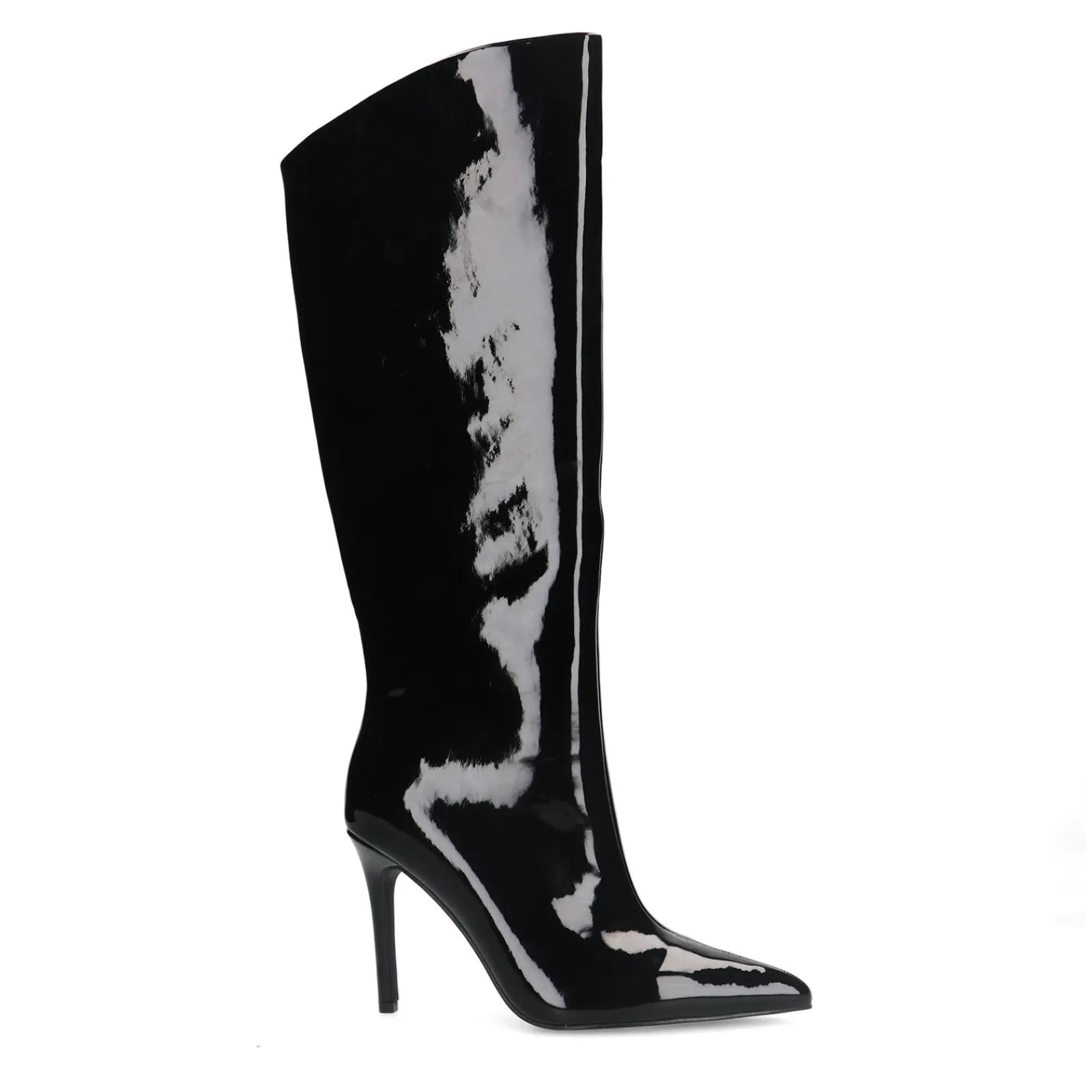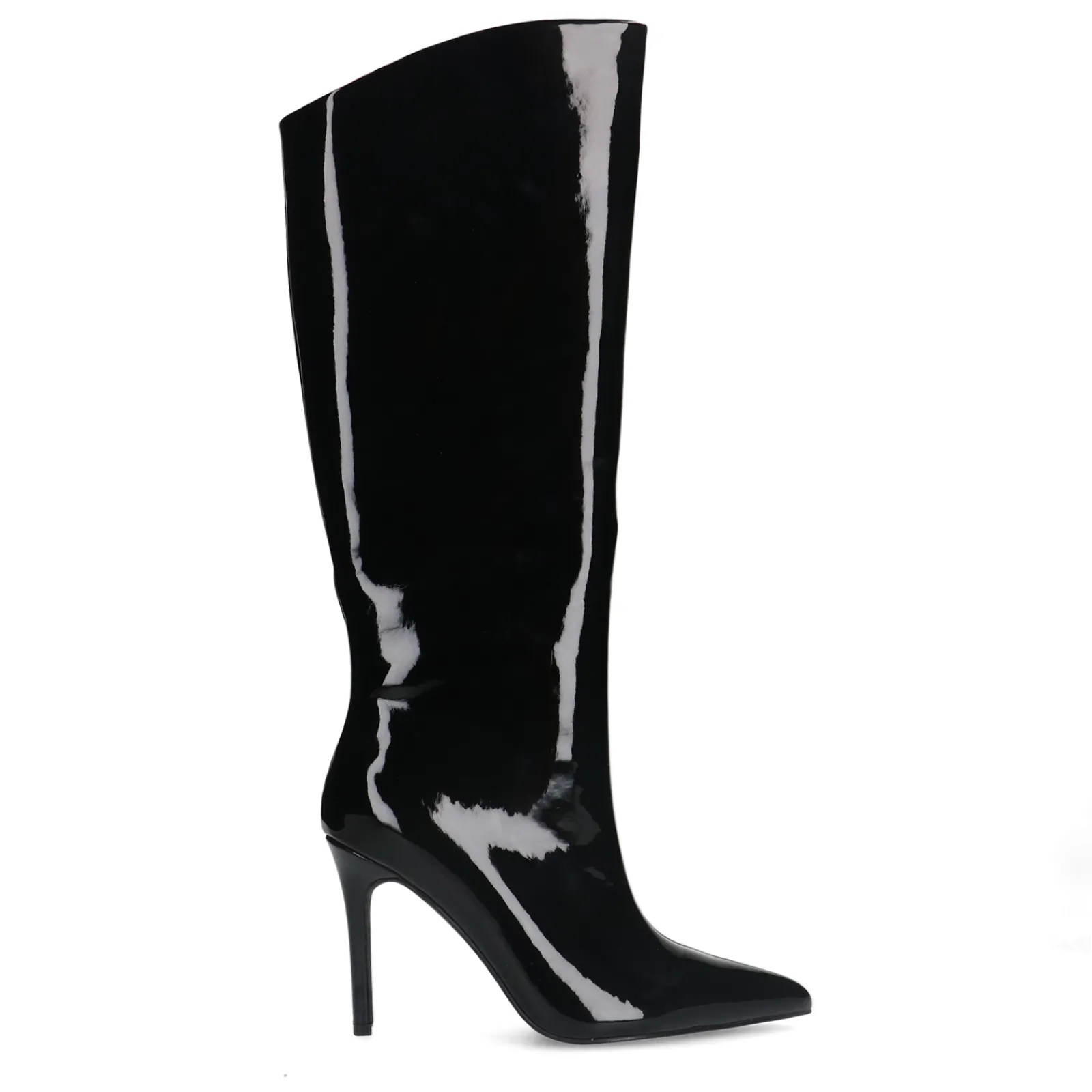 Hoge Zwarte Boots In Een Laklook Met Naaldhak Van Sacha. De Sleek Boots Hebben Een Schuine Afsnede Aan De Bovenzijde Van De Schacht En Een Korte Rits Aan De Binnenzijde. De Schachthoogte Meet 35 Cm, De Schachtomtrek Is 40 Cm En De Naalhak Heeft Een Hoogte Van 10 Cm. Maak Gebruik Van De Juiste Onderhoudsproducten.