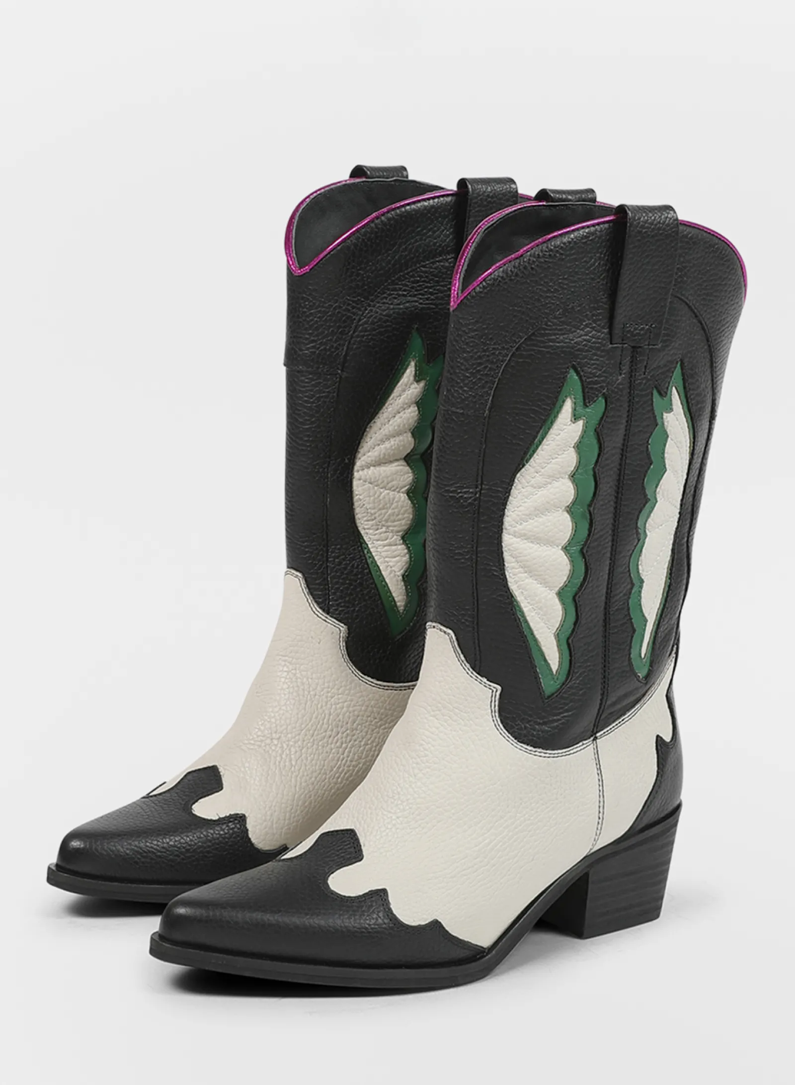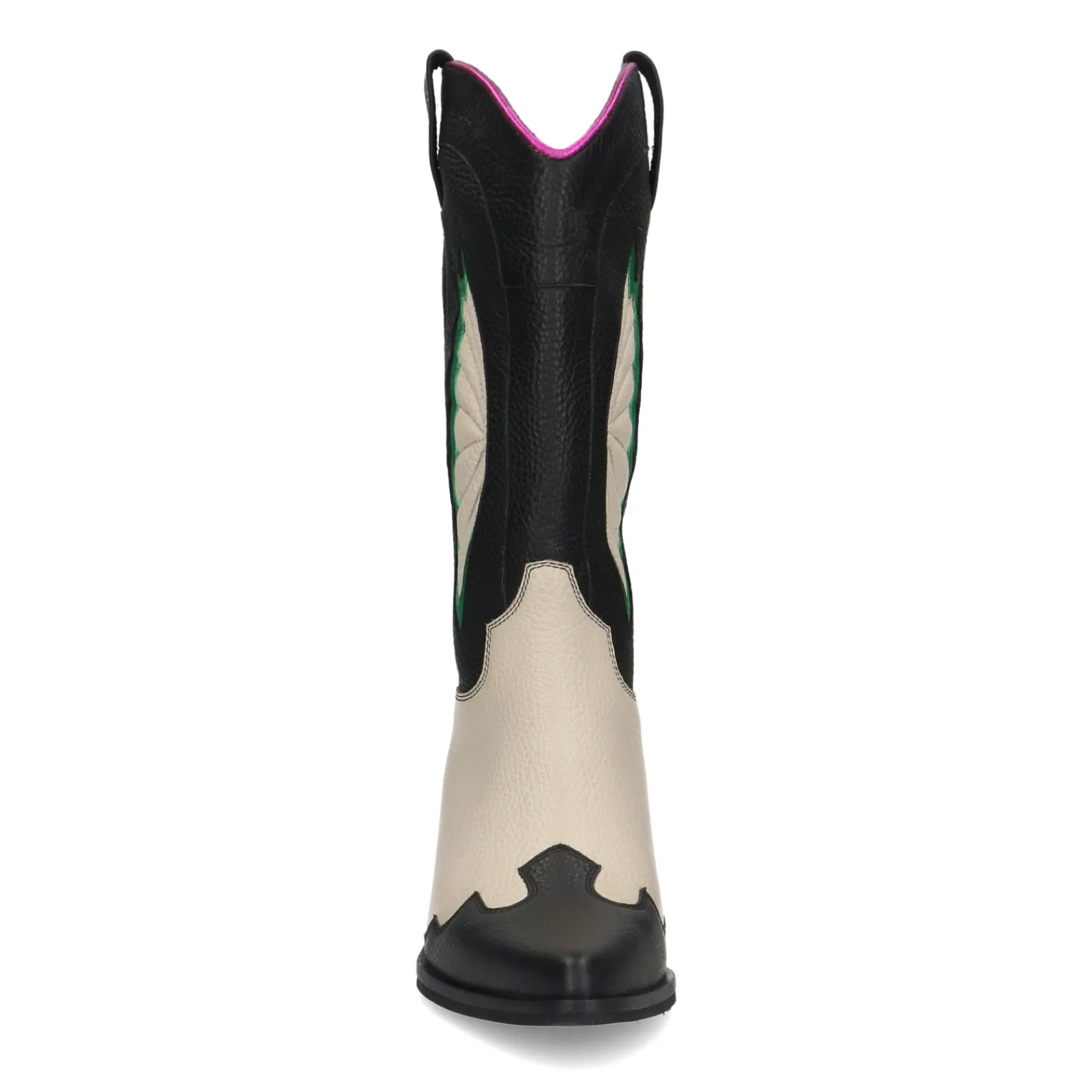 Deze Zwarte Leren Cowboylaarzen Van Sacha Hebben Een Uniek Western Design Met Off White, Groene En Roze Details. De Laar…