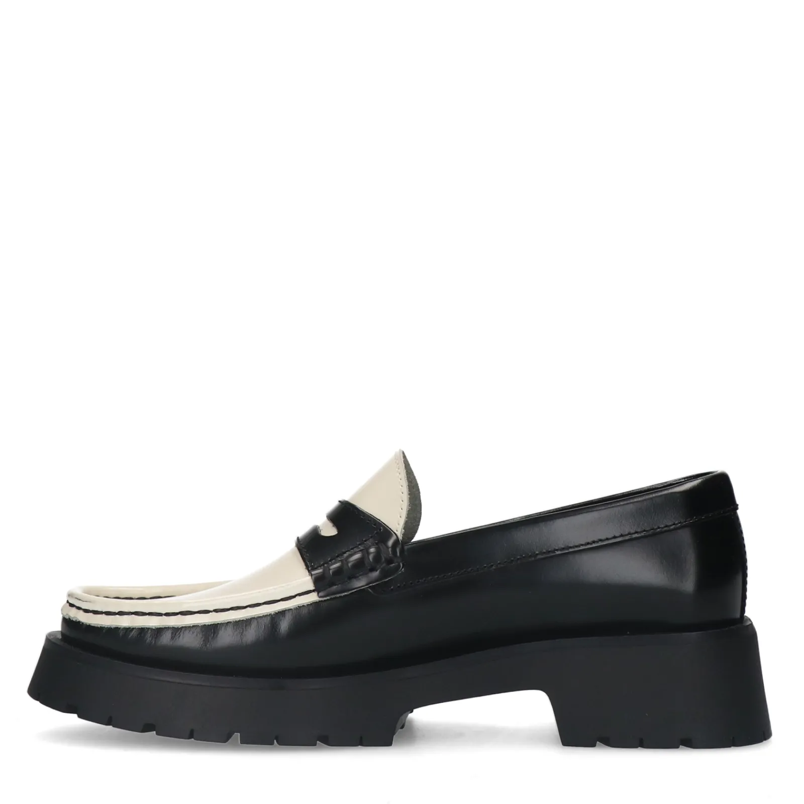 Chunky Leren Loafers Van Sacha Met Opvallende Plateau Zool. De Loafers Hebben Een Penny Detail Op De Wreef Van De Voet, Een Mix Tussen Zwarte En Witte Details En Een Plateau Zool Van 2 Cm Dik. De Hak Van De Dames Instappers Heeft Een Hoogte Van 4 Cm. De Binnenzijde Van De Loafers Is Gemaakt Van Suede. Maak Gebruik Van De Juiste Onderhoudsproducten!