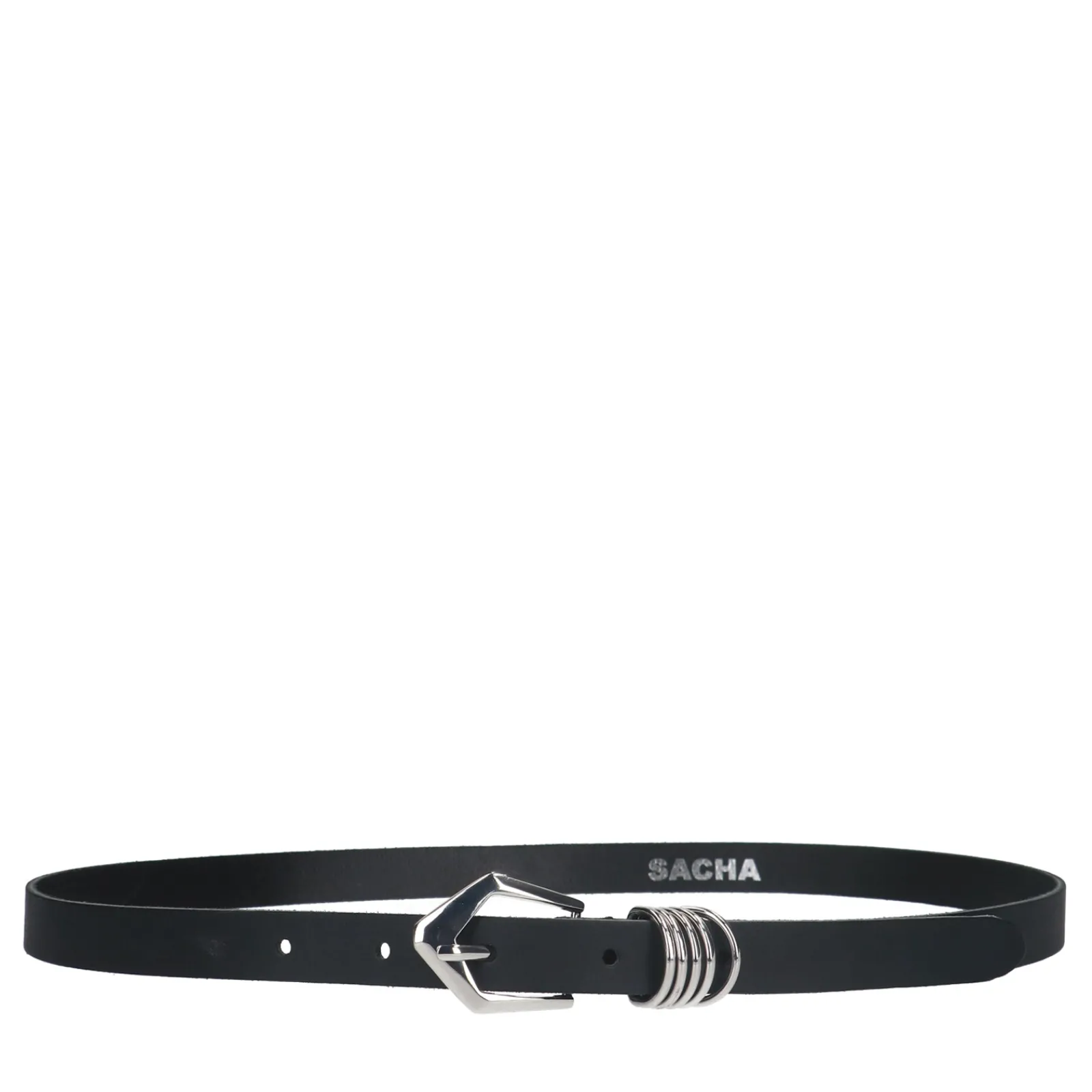 Zwarte Leren Smalle Riem Van Sacha. De Riem Sluit Middels Een Zilverkleurige Gesp Met Zilverkleurige Ringetjes Als Detail. De Riem Heeft Een Breedte Van 2 Cm.