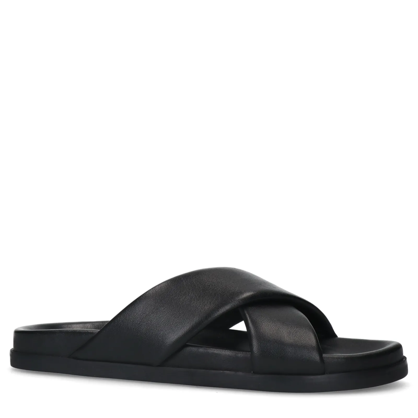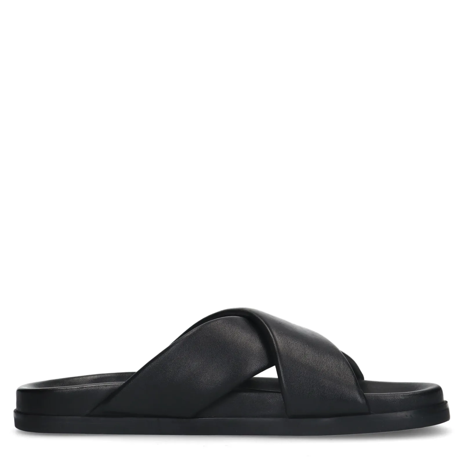 Deze Zwarte Leren Sippers Van Sacha Hebben Twee Gekruiste Banden Over De Voet. Door De Brede Band Op De Voet En De Zwarte Zool Zijn Ze De Slippers Erg Trendy En Stijlvol. De Zool Heeft Een Hoogte Van 2 Cm. Maak Gebruik Van De Juiste Onderhoudsproducten!