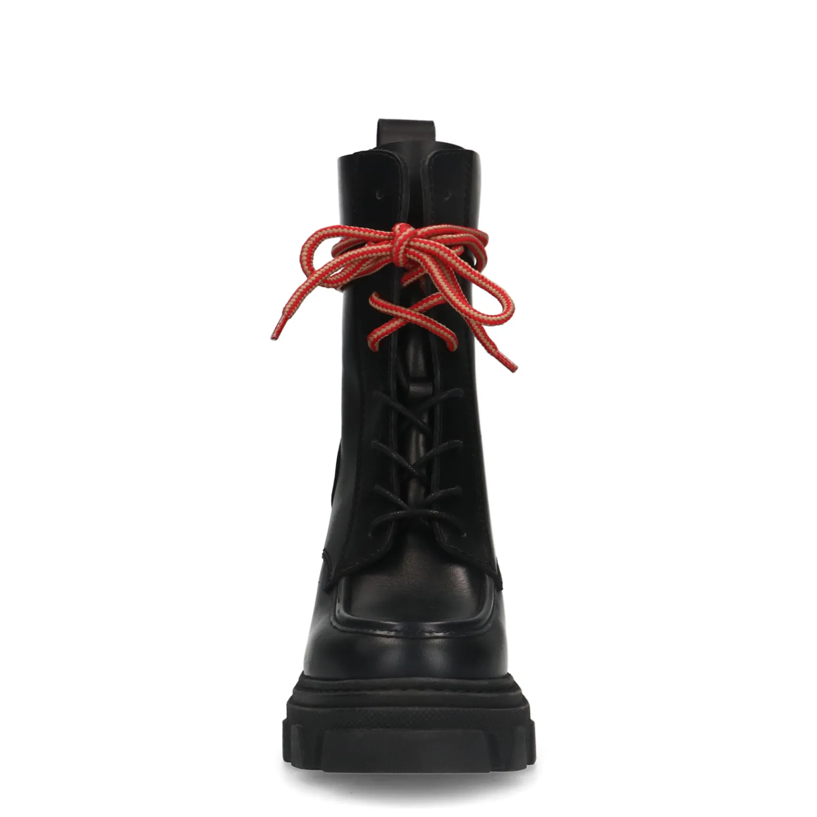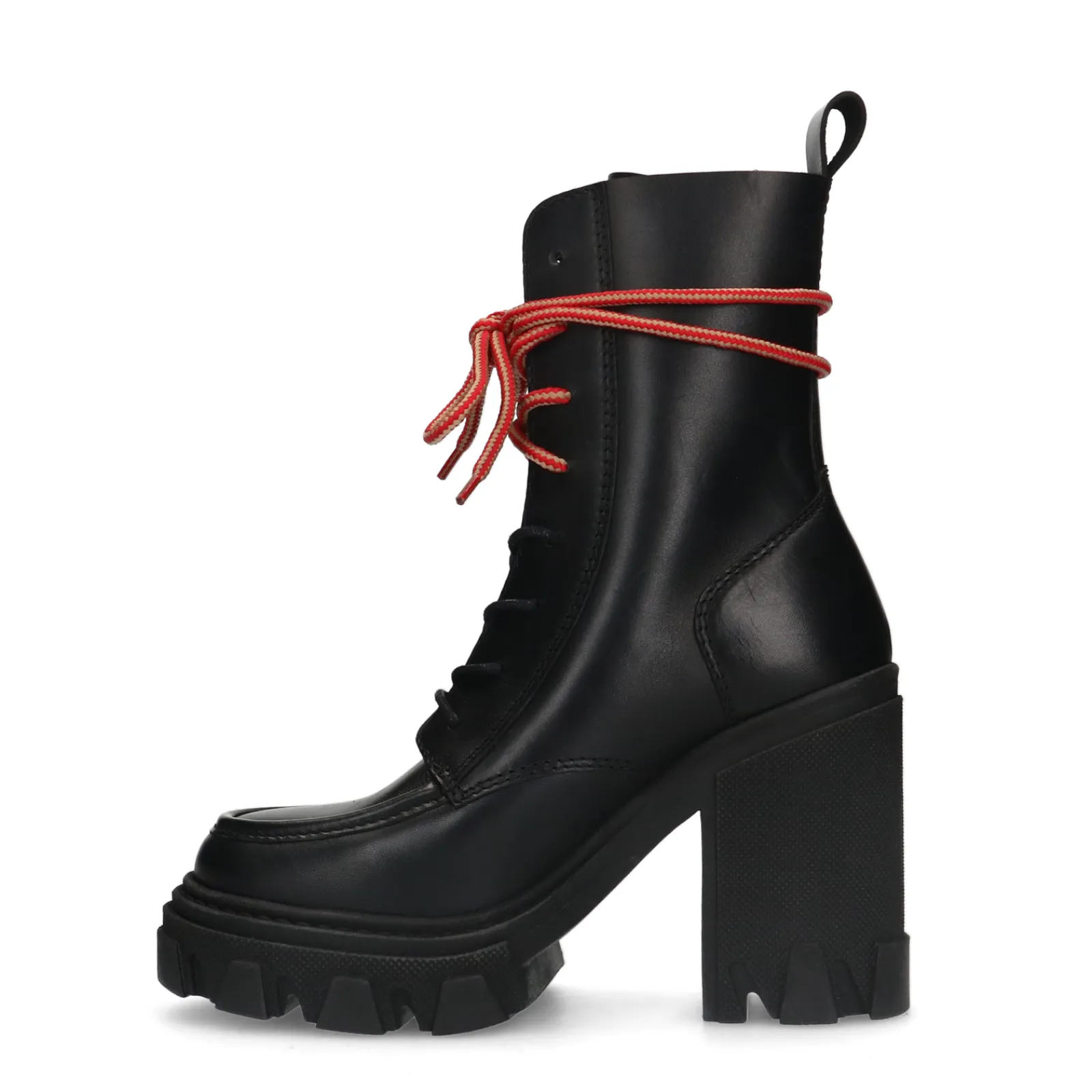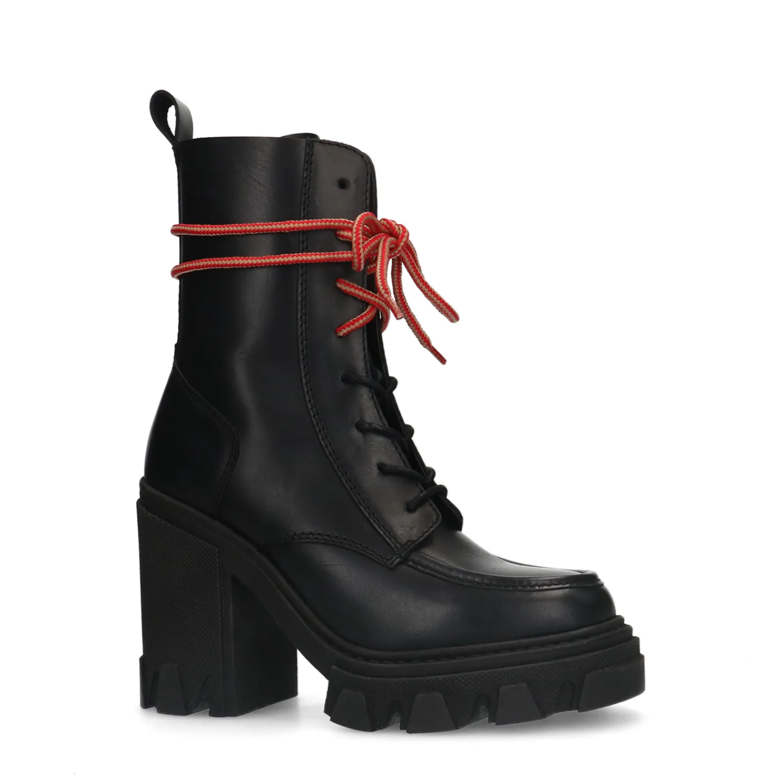 Stoere Chunky Veterboots Van Sacha Met Grove Plateau Hak. De Zwarte Enkellaarsje Met Hak Sluiten Middels Een Zwarte Veter En Een Roodgekleurde Veter Als Toevoeging. De Hoge Hak Met Relief Heeft Een Hoogte Van 11 Cm Met Een Plateauzool Van 4 Cm Voor Comfort. De Enkelboots Zijn Zowel Aan De Binnen- Als Buitenzijde Gemaakt Van Leer. Maak Daarom Gebruik Van De Juiste Onderhoudsproducten Om Het Leer Te Bescheren En Verzorgen.