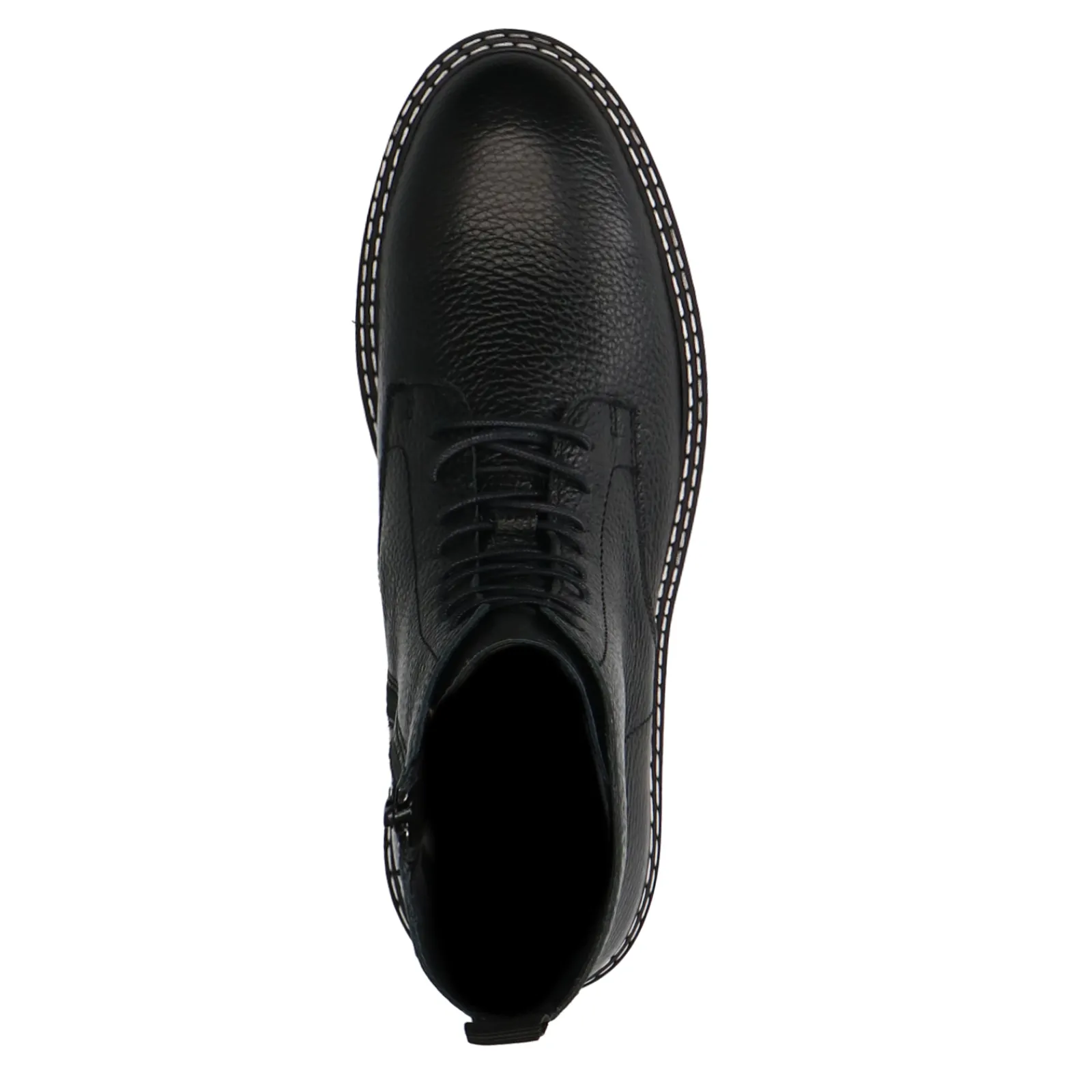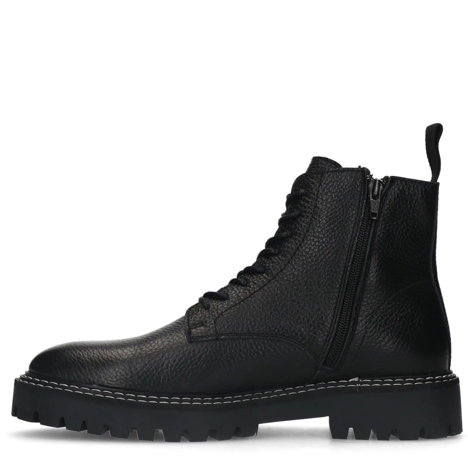 Deze Zwarte Veterlaarzen Van Sacha Hebben Een Chunky Zool En Een Dubbele Rij Witte Sierstiksels Op De Bovenzijde Van De Buitenzool. De Zool Heeft Een Hoogte Van 2.5 Cm Met Een Hakhoogte Van 3.5 Cm. De Zwarte Veterboots Hebben Twee Rijen Met Ieder 5 Veterogen, Een Zwarte Rits Aan De Binnenzijde En Een Zwarte Lus Aan De Achterzijde. Hierbij Hoort Een Schachtomtrek Van 25 Cm En Een Schachthoogte Van 13 Cm. Maak Gebruik Van De Juiste Onderhoudsproducten Om Het Leer Te Beschermen En Te Verzorgen!