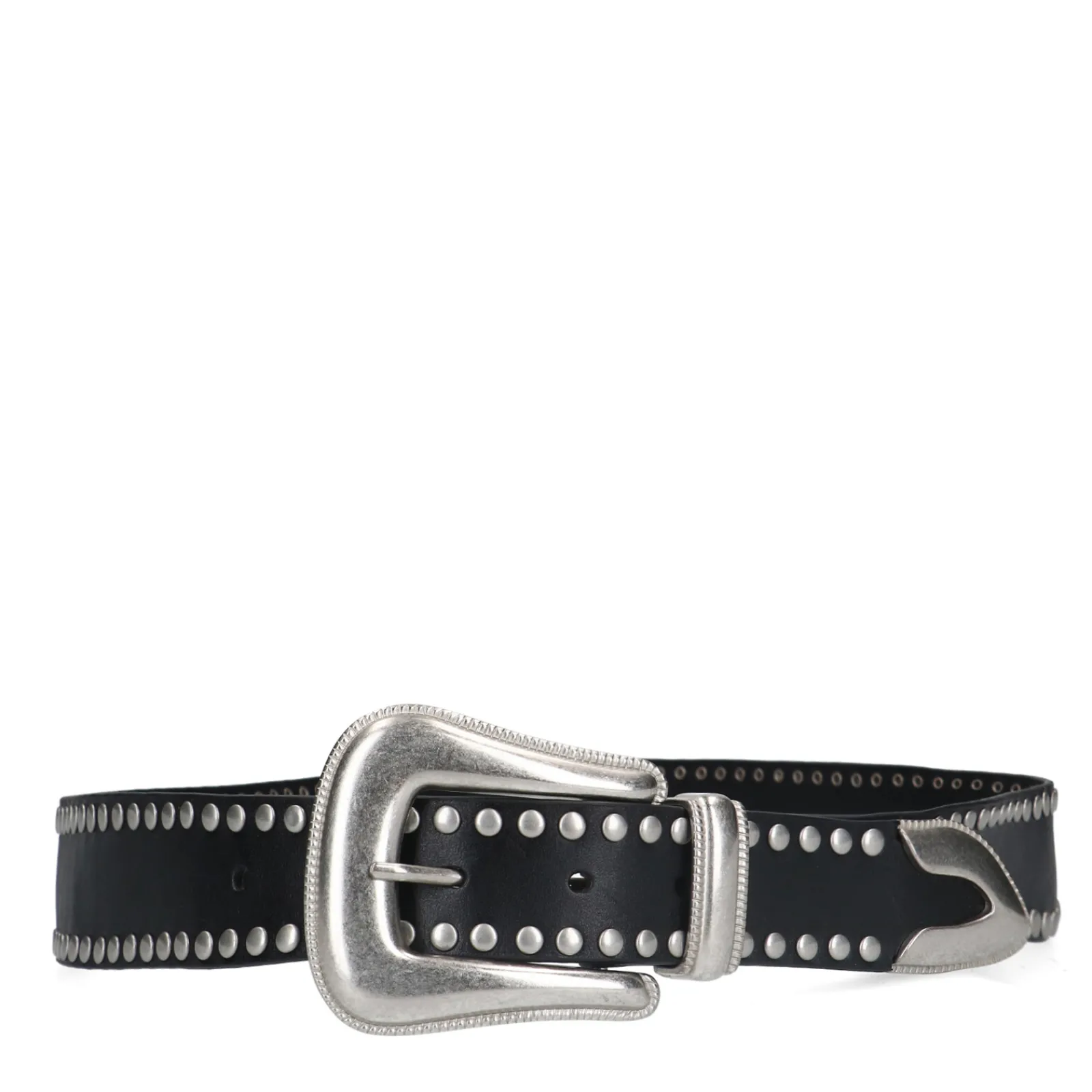 Zwarte Western Riem Van Sacha Volledig Gemaakt Van Leer. De Riem Heeft Een Zilverkleurige Buckle En Zilverkleurige Studs In Het Design.