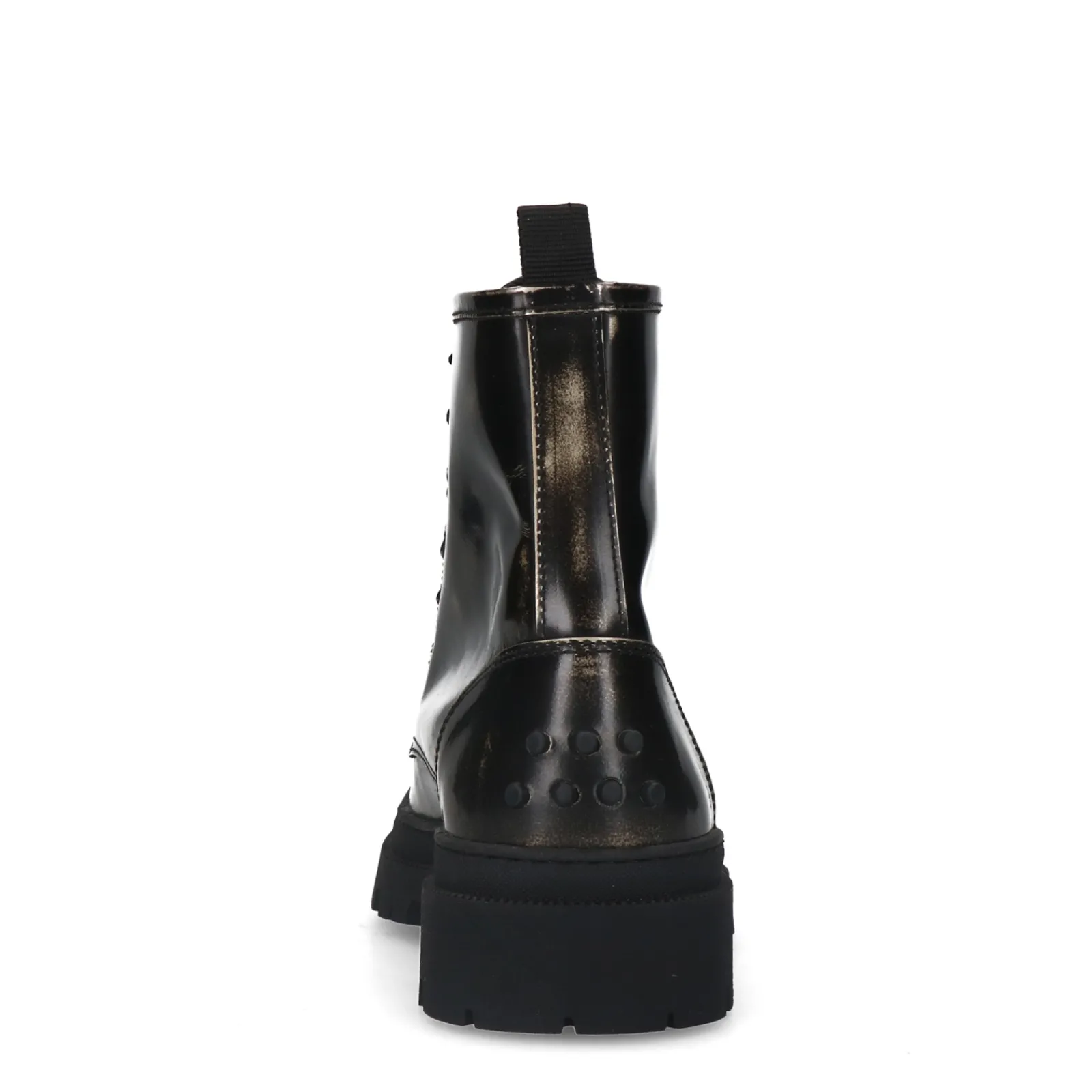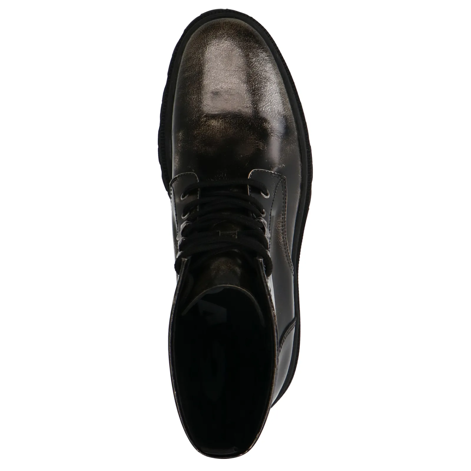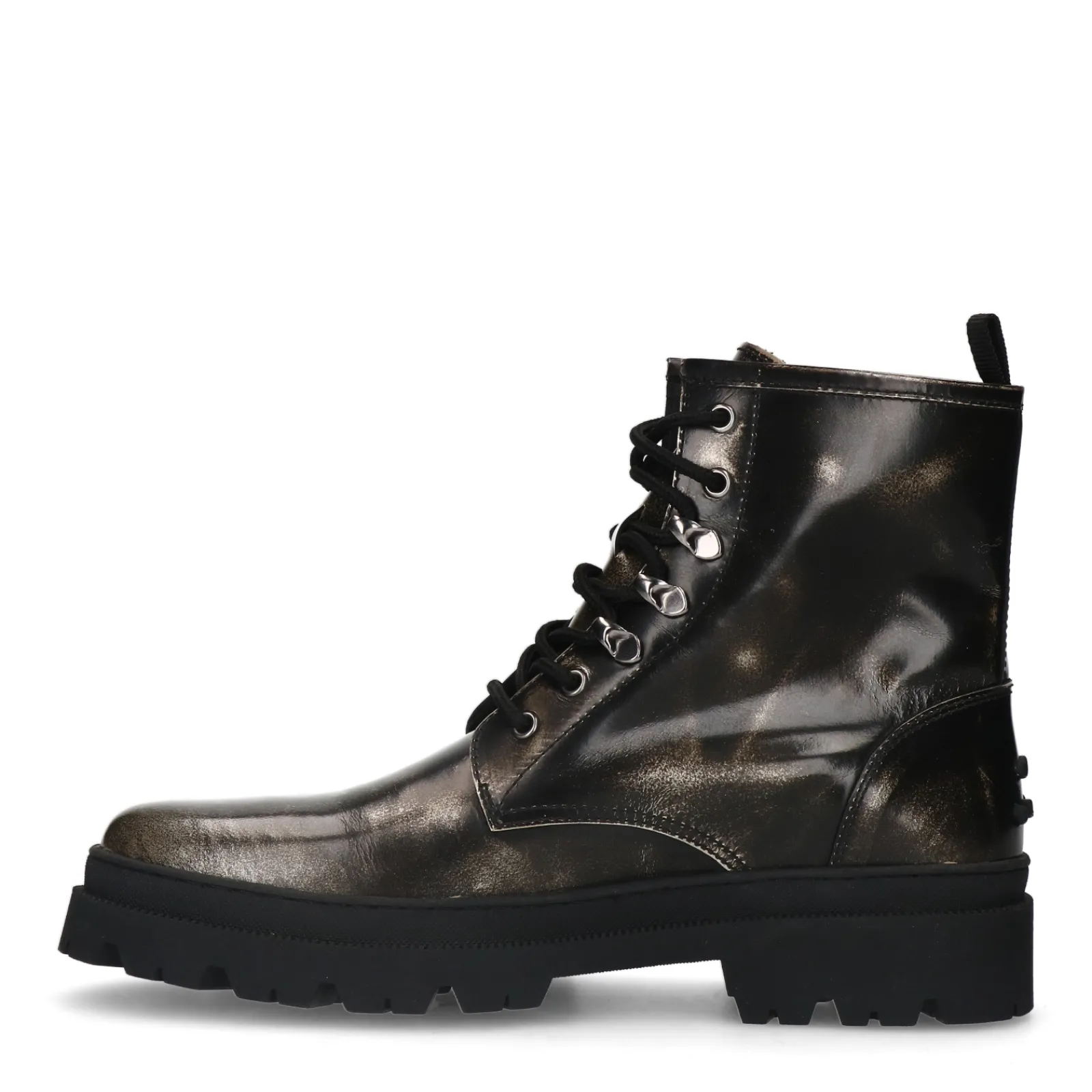 Deze Zwarte Veterboots Hebben Een Uniek Effect. De Silverwashing Aan De Gladleren Buitenzijde Zorgt Voor Een Ruwe Look. De Veterlaarzen Hebben 7 Zilverkleurige Veterogen Aan Iedere Zijde , Een Zool Van 2 Cm En Een Lage Hak Van 3 Cm. Aan De Achterzijde Heeft De Hak 7 Kleine Rubberen Details. De Heren Veterboots Hebben Een Schachthoogte Van 15 Cm En Een Schachtomtrek Van 28 Cm. Maak Gebruik Van De Juiste Onderhoudsproducten.
