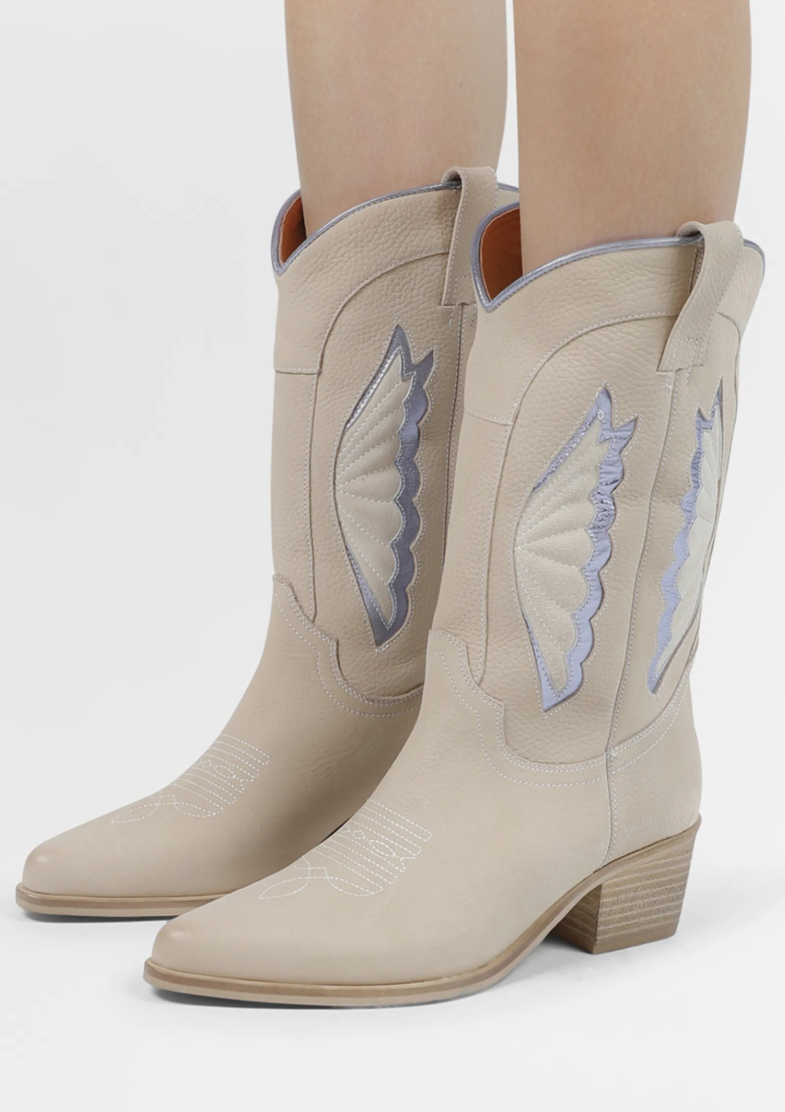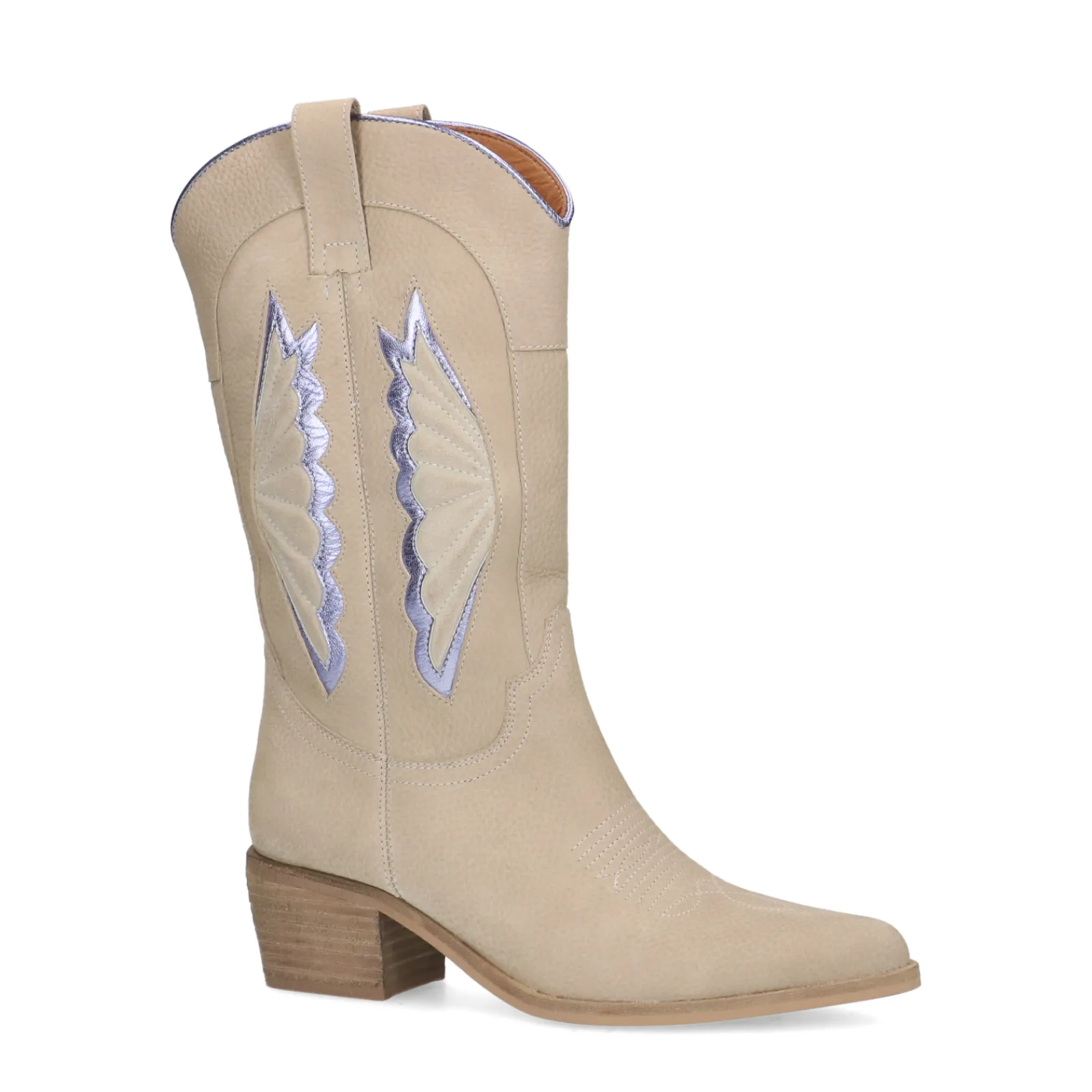Deze Beige Leren Cowboylaarzen Van Sacha Hebben Een Uniek Western Design Met Lila Metallic Details, En Een Afwerking Met Off White Sierstiksels. De Laarzen Hebben Een Bruine Lage Hak Van 5 Cm En Een Puntige Neus. Hierbij Hoort Een Schachthoogte Van 23 Cm En Een Schachtomtrek Van 35 Cm. De Western Boots Zijn Aan De Buitenkant Gemaakt Van Leer. Maak Gebruik Van De Juiste Onderhoudsproducten.