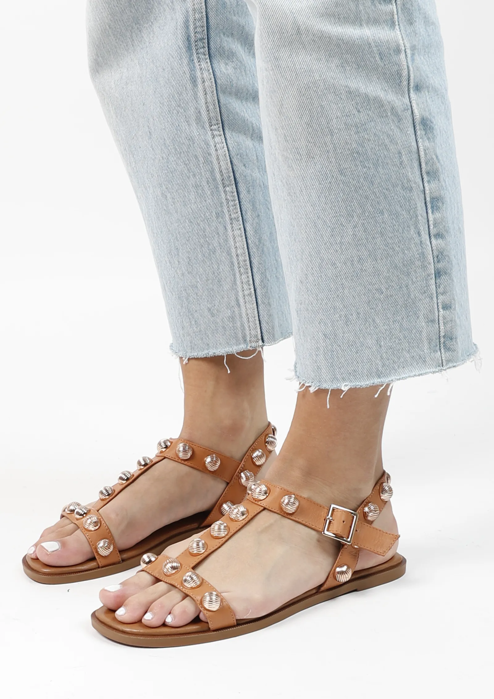 Beige Leren Sandalen Met Goudkleurige Studs^Sacha Best Sale