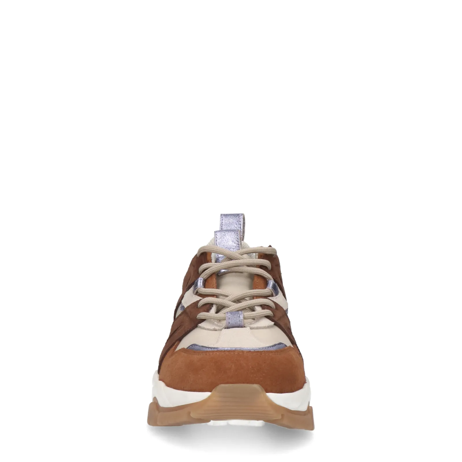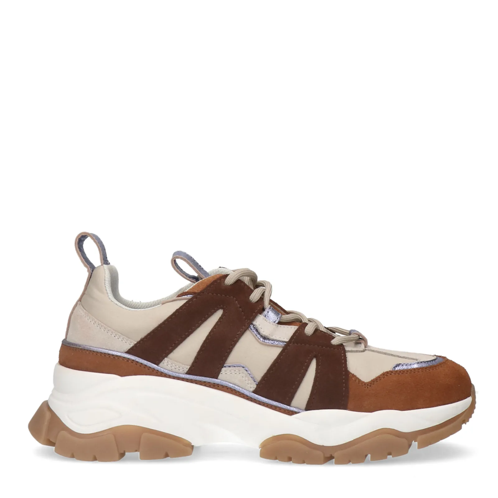 Deze Chunky Sneakers Van Sacha Hebben Een Grof Karakter Die Wordt Gecombineerd Met Opvallende Metallic Paarse Details. Naast De Beige Synthetische Basis Aan De Buitenzijde, Hebben De Dames Sneakers Verschillende Camel Suede Overlays. De Zool Heeft Een Dikte Van 3 Cm. Maak Gebruik Van De Juiste Onderhoudsproducten.