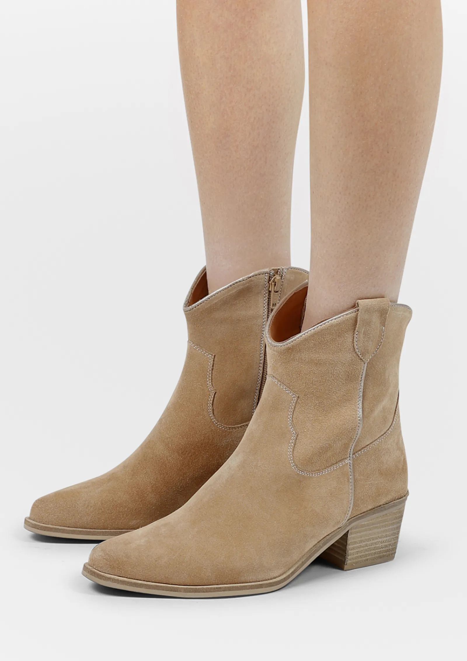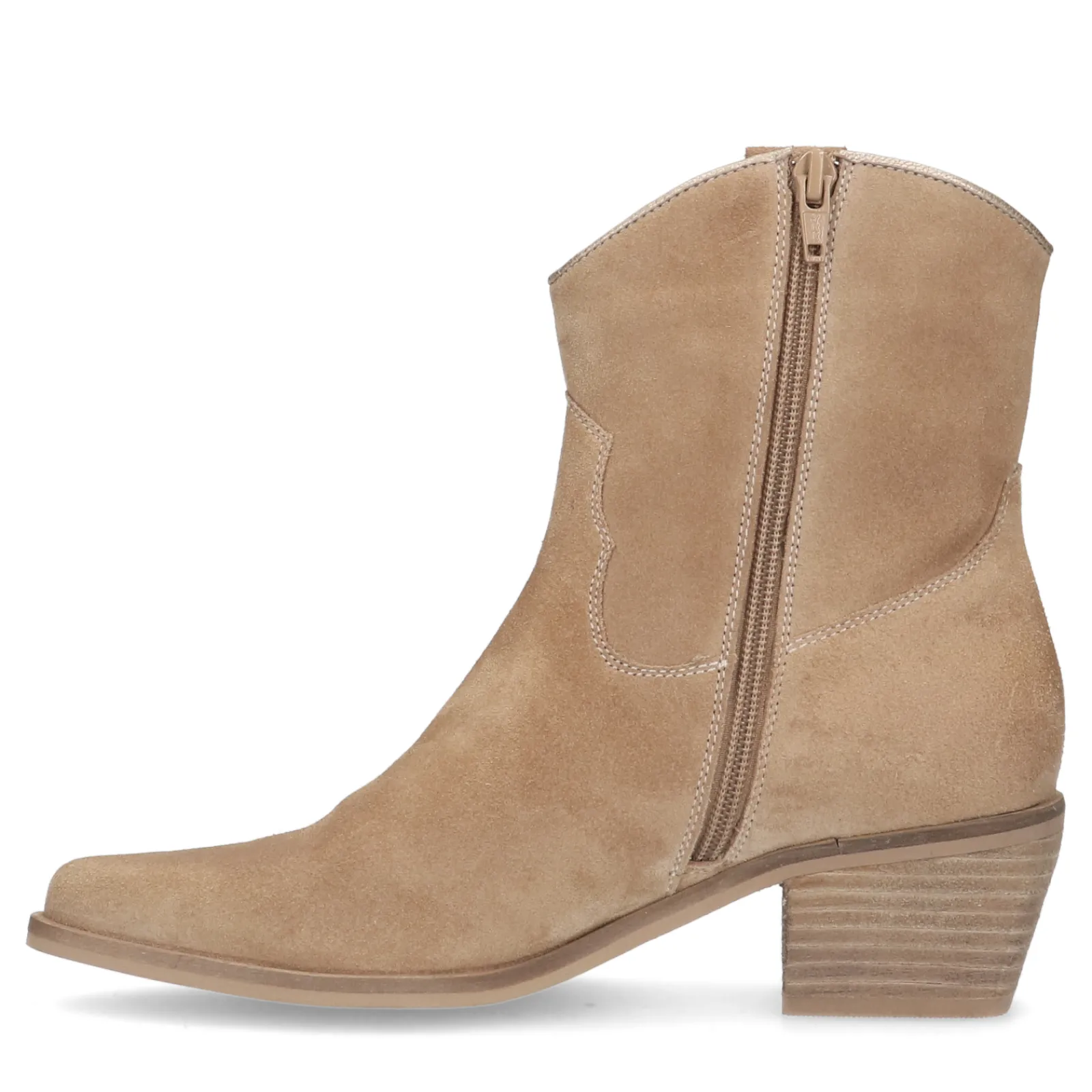 Deze Beige Suede Lage Boots Van Sacha Zijn Perfecte Basic Cowboylaarzen. De Western Boots Zijn Aan De Buitenkant Geheel Gemaakt Van Suede Met Een Subtiele Goudkleurige Afwerking. De Laarzen Hebben Een Schachthoogte Van 14 Cm, Een Schachtomtrek Van 29 Cm En Een Hakhoogte Van 5 Cm. De Beige Enkellaarsjes Hebben Een Puntige Neus. Maak Gebruik Van De Juiste Onderhoudsproducten!