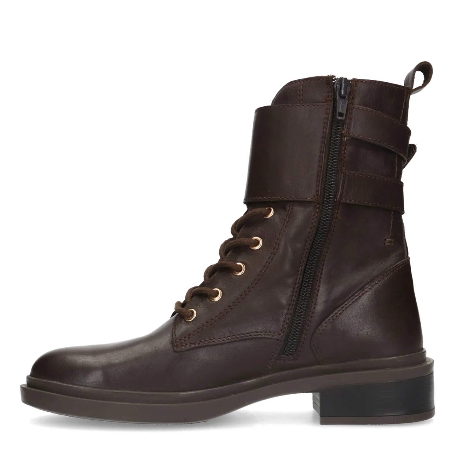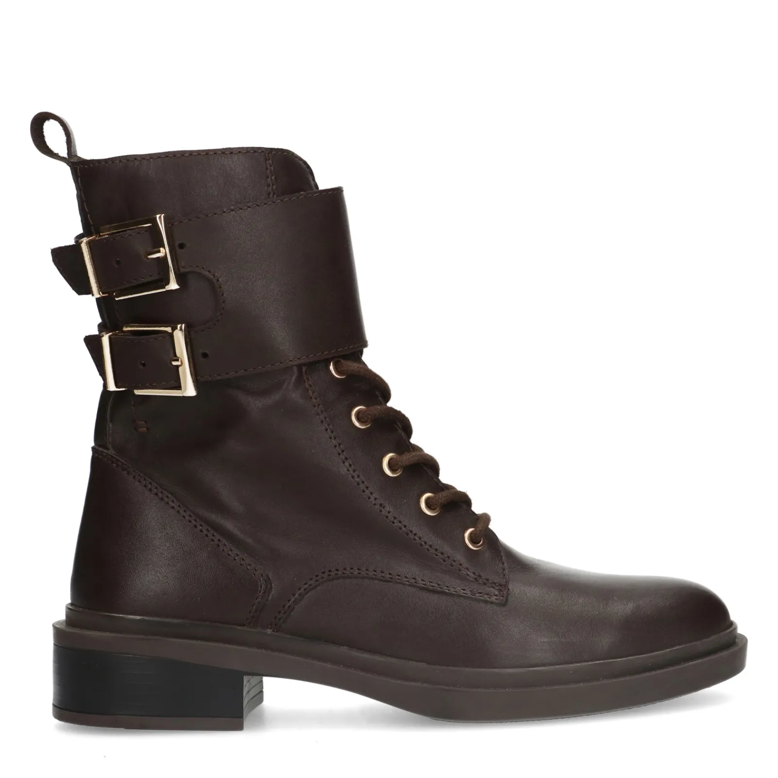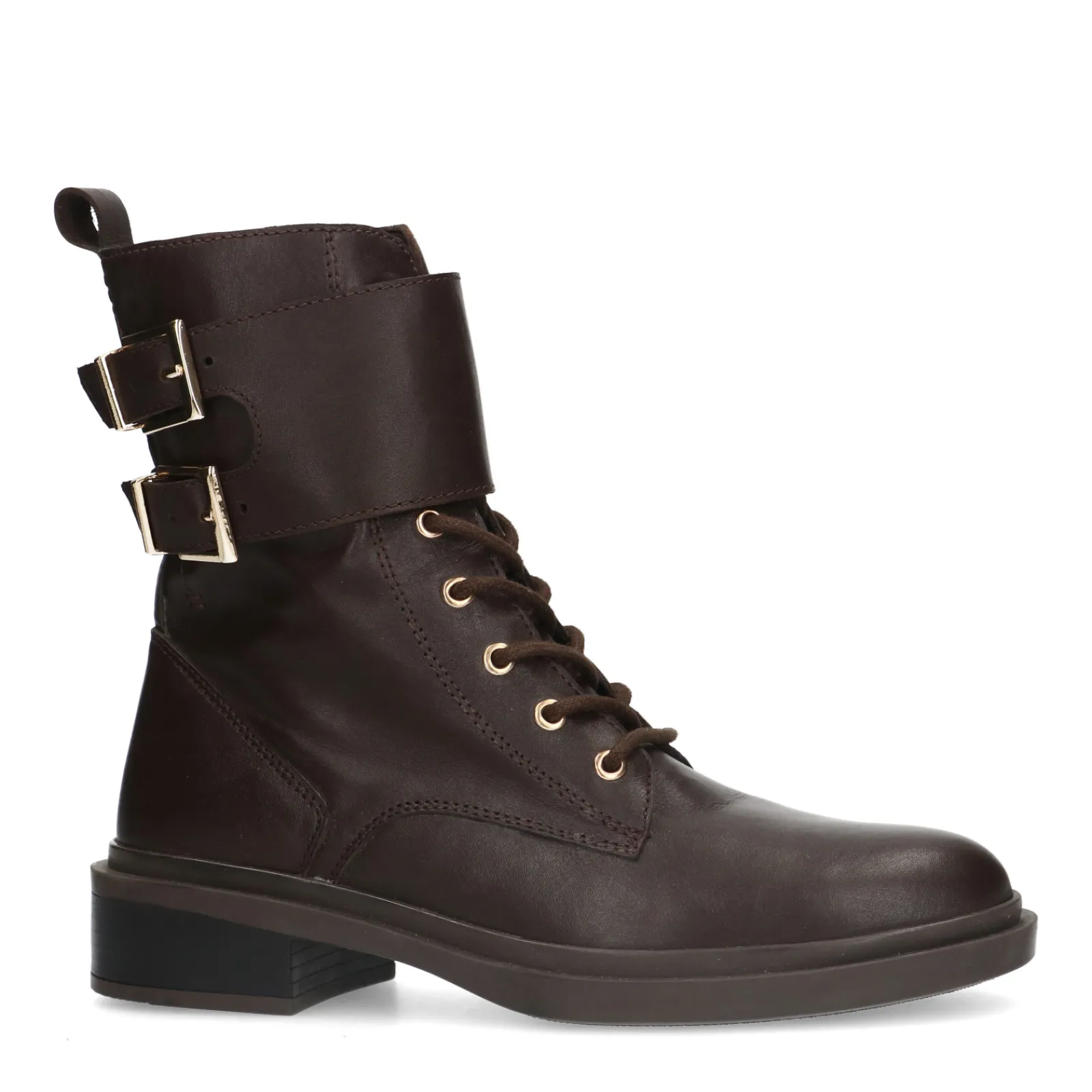Deep Chocolate Bruine Enkel Veterboots Met Goudkleurige Gespen. De Bruine Veterlaarsjes Van Sacha Zijn Zowel Aan De Binnen- Als Buitenzijde Gemaakt Van Leer. Zowel De Veterogen Als De Twee Buckle Gespen Zijn Goudkleurig. Aan De Binnenzijde Van De Boots Zit Een Handige Rits. Maak Gebruik Van De Juiste Onderhoudsproducten!