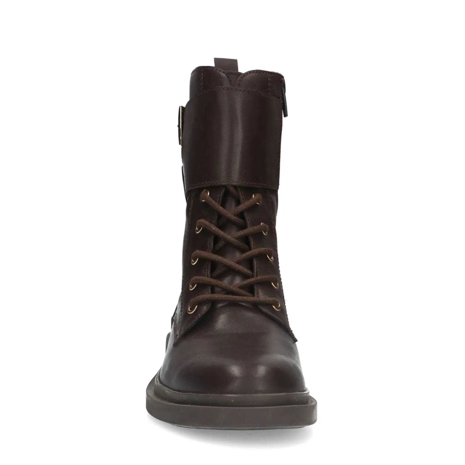 Deep Chocolate Bruine Enkel Veterboots Met Goudkleurige Gespen. De Bruine Veterlaarsjes Van Sacha Zijn Zowel Aan De Binn…