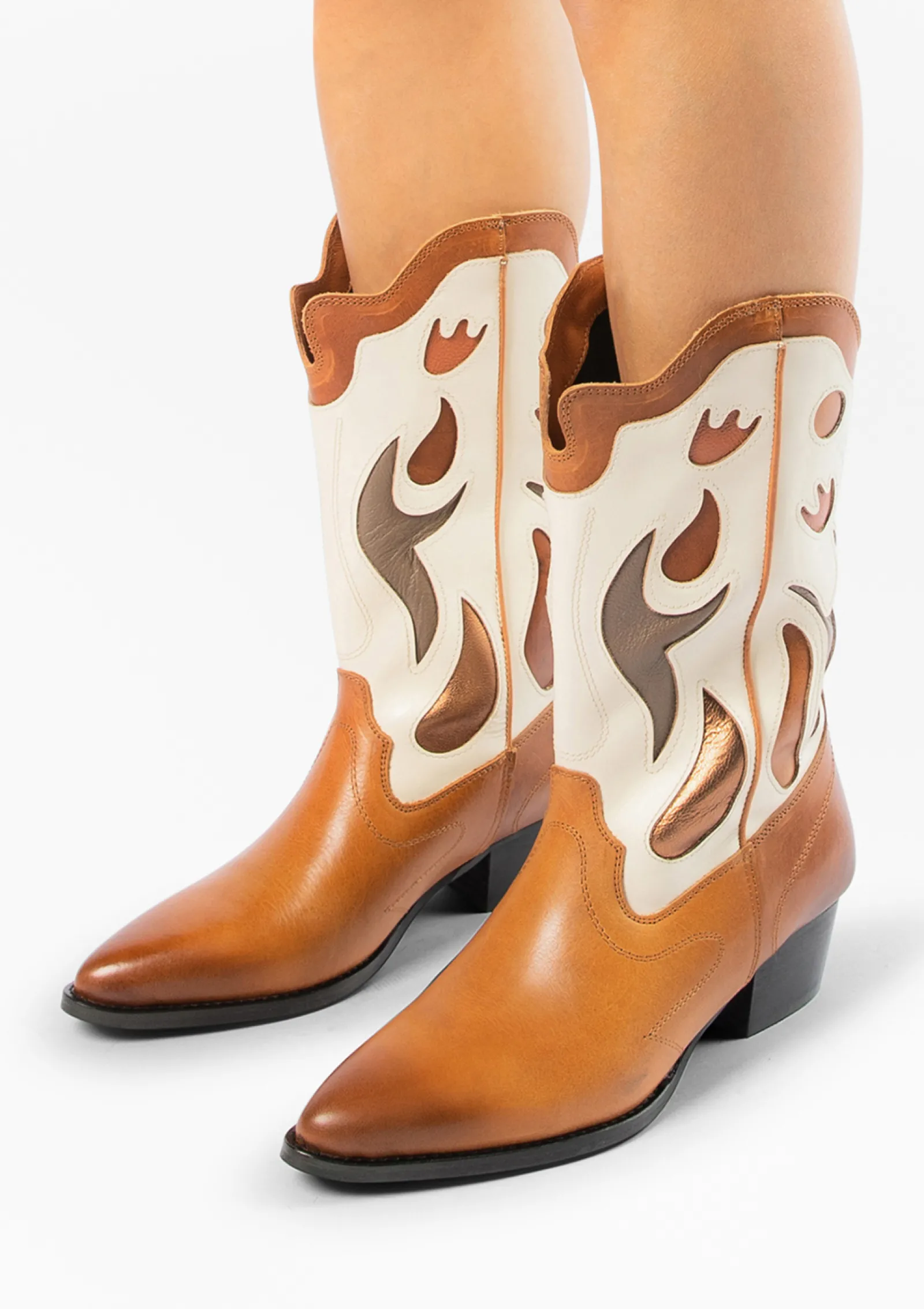 Cognac Leren Cowboylaarzen Met Off White Details^Sacha Flash Sale