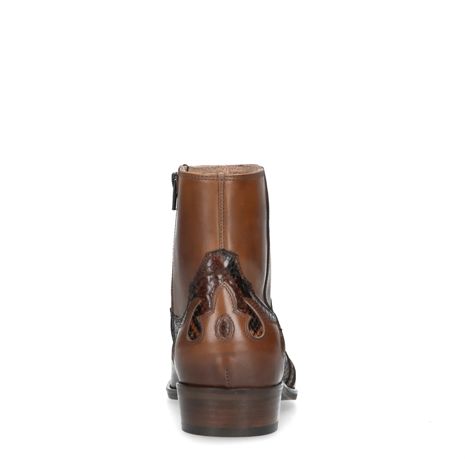 Met Deze Cognac Western Boots Uit De Dandy Collection Van Sacha Geef Je Een Stoere Twist Aan Elke Look! De Snakeprint, Western Stiksels, Lage Hak Van 3 Cm Hoog En De Spitsere Neus Zorgen Voor Een Typische Westerse Uitstraling. De Boots Zijn Volledig Gemaakt Van Leer En Door De Rits Aan De Binnenzijde Trek Je Ze Gemakkelijk Aan En Uit. Combineer Met Een Mooie Jeans En Blouse Of Trui Voor Een Compleet Gestylede Look!