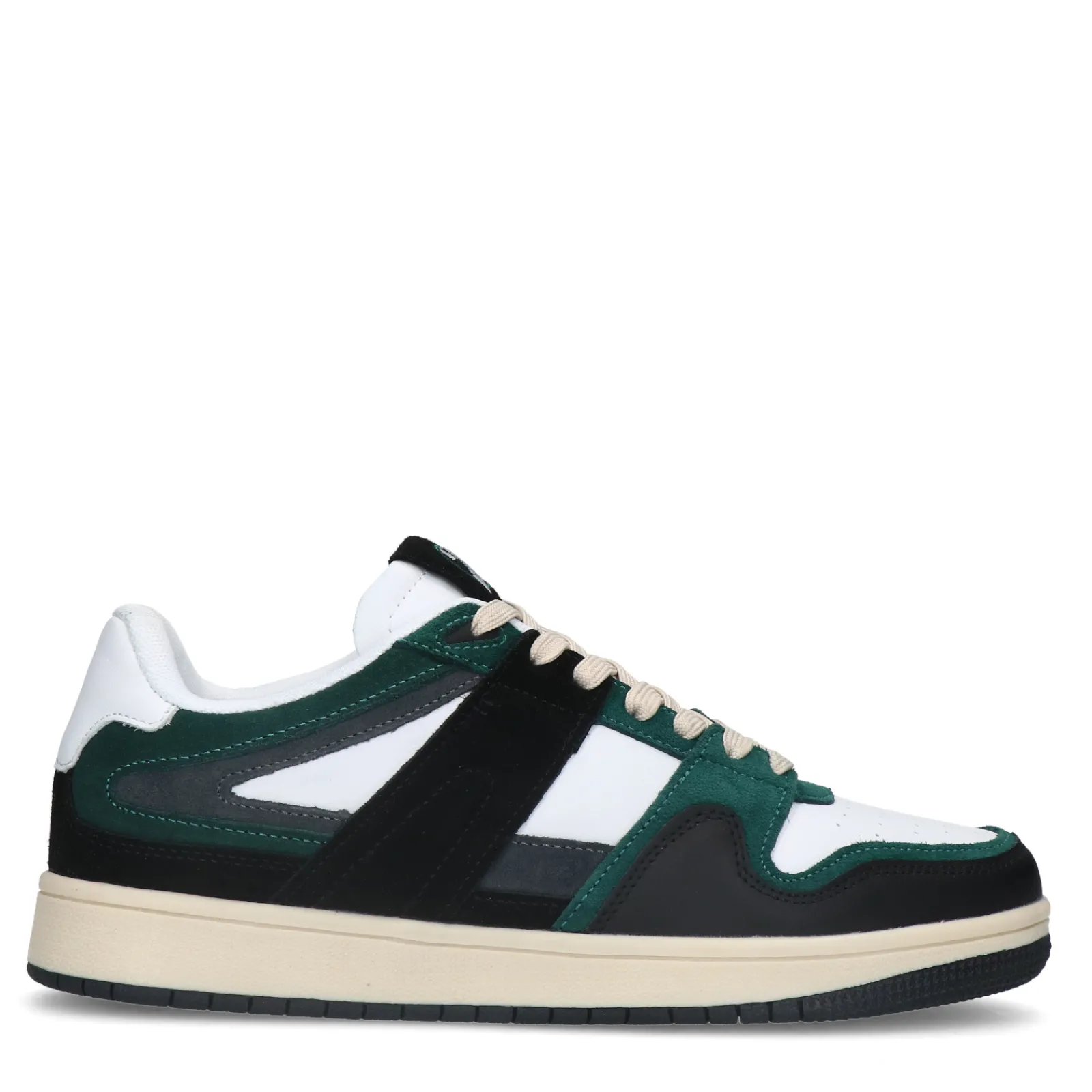 Deze Donkergroene Sneakers Van Sacha Hebben Een Opvallend Design Door Het Contrasterende Kleurenpallet. De Sneakers Hebben Een Witte Leren Buitenzijde Gecombineerd Met Suede Groene, Zwarte En Grijze Details. De Heren Sneakers Hebben Als Optie Twee Verschillende Veters, Zowel Beige Als Zwarte Veters. De Zool Heeft Een Dikte Van 3 Cm. Maak Gebruik Van De Juiste Onderhoudsproducten!