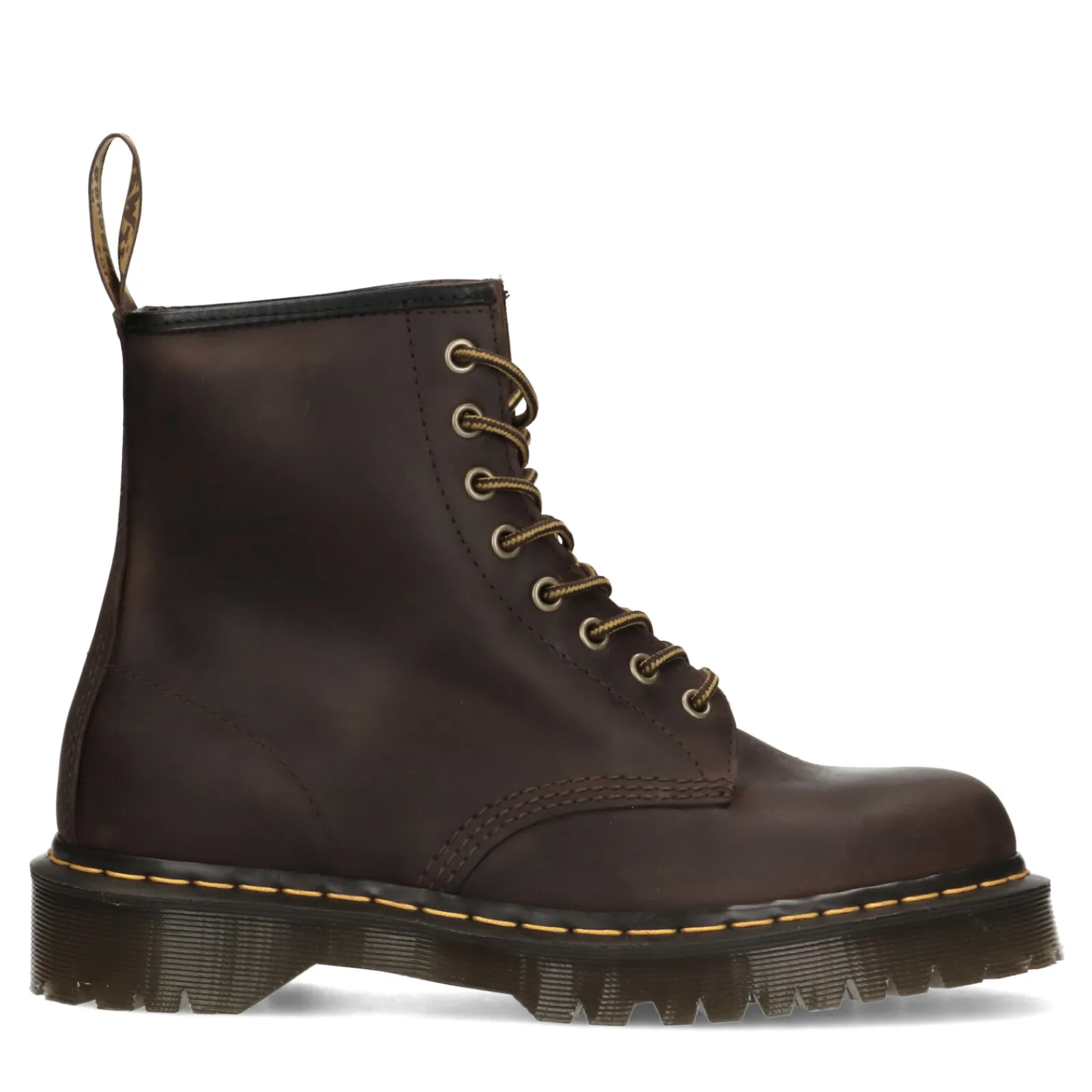 Deze Iconische Dr. Martens Veterboots Hebben Een Getextueerde Look Door Het Bruinkleurige Leer. De Veterlaarzen Zijn Zowel Aan De Binnen- Als Buitenkant Gemaakt Van Leer. De Typerende Bex Zool Heeft Een Dikte 2 Cm En Een Hakhoogte Van 3 Cm. De Boots Hebben 8 Veterogen Met Geel Gedetailleerde Veters. De Schoenen Hebben Een Schachthoogte Van 16 Cm En Een Schachtomtrek Van 26 Cm. Maak Gebruik Van De Juiste Onderhoudsproducten Om Zo Lang Mogelijk Van Je Docs Te Genieten!