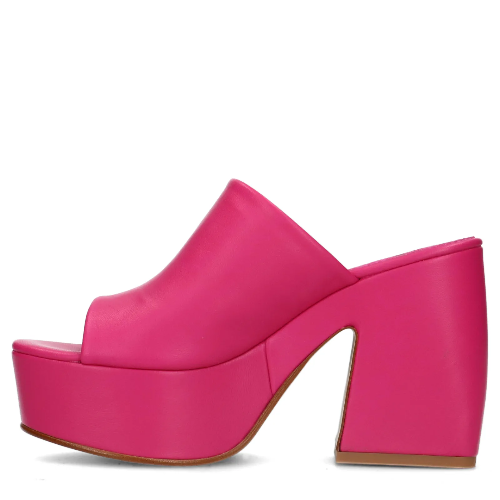 High In The Sky Met Deze Fuchsia Roze Leren Muiltjes Van Sacha! Deze Muil Slippers Met Brede Band Hebben Een Chunky Plateau Hak Van 11 Cm Hoog En Een Plateau Zool Van 4 Cm. Bescherm En Verzorg Je Muiltjes Met De Juiste Onderhoudsproducten!