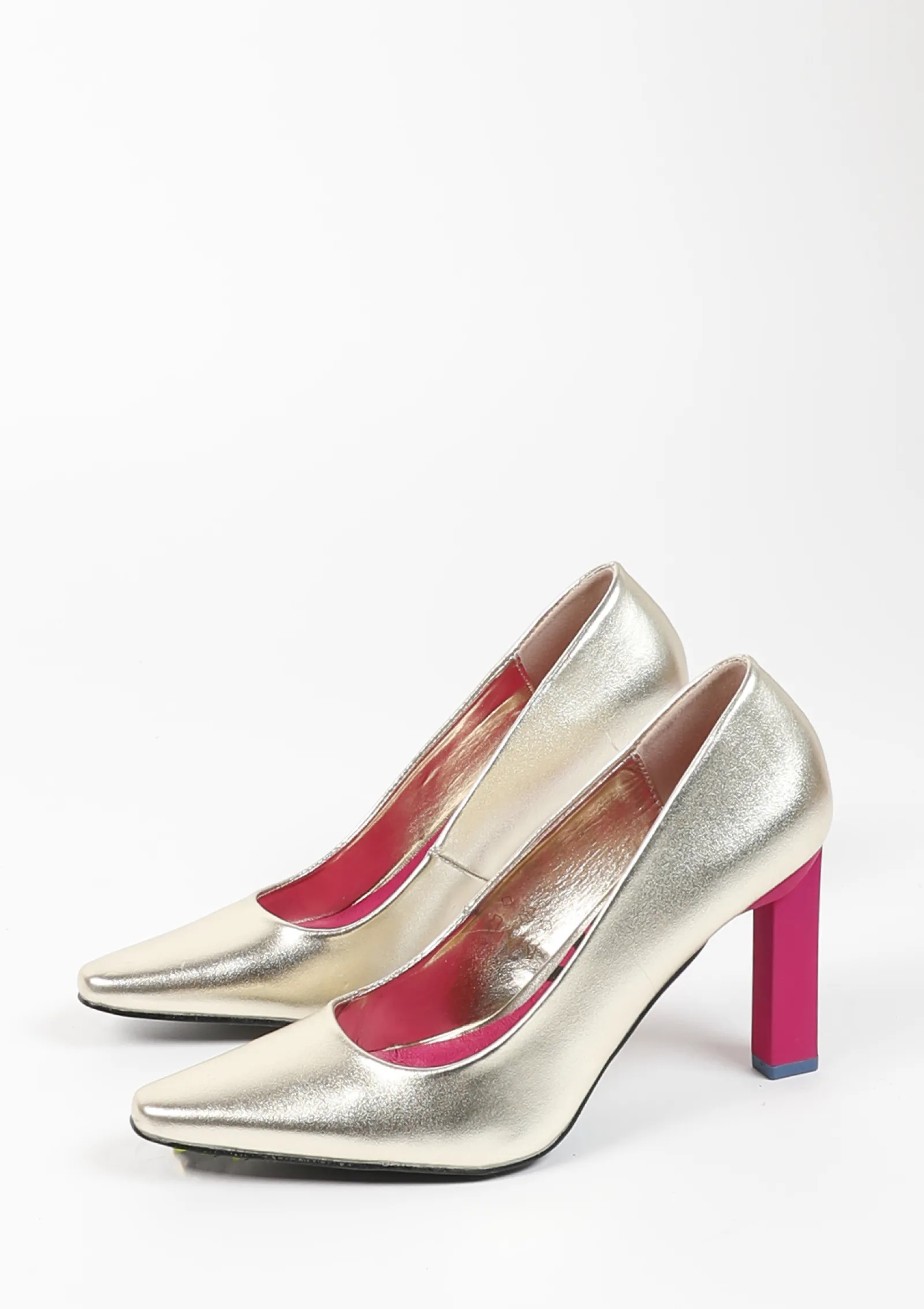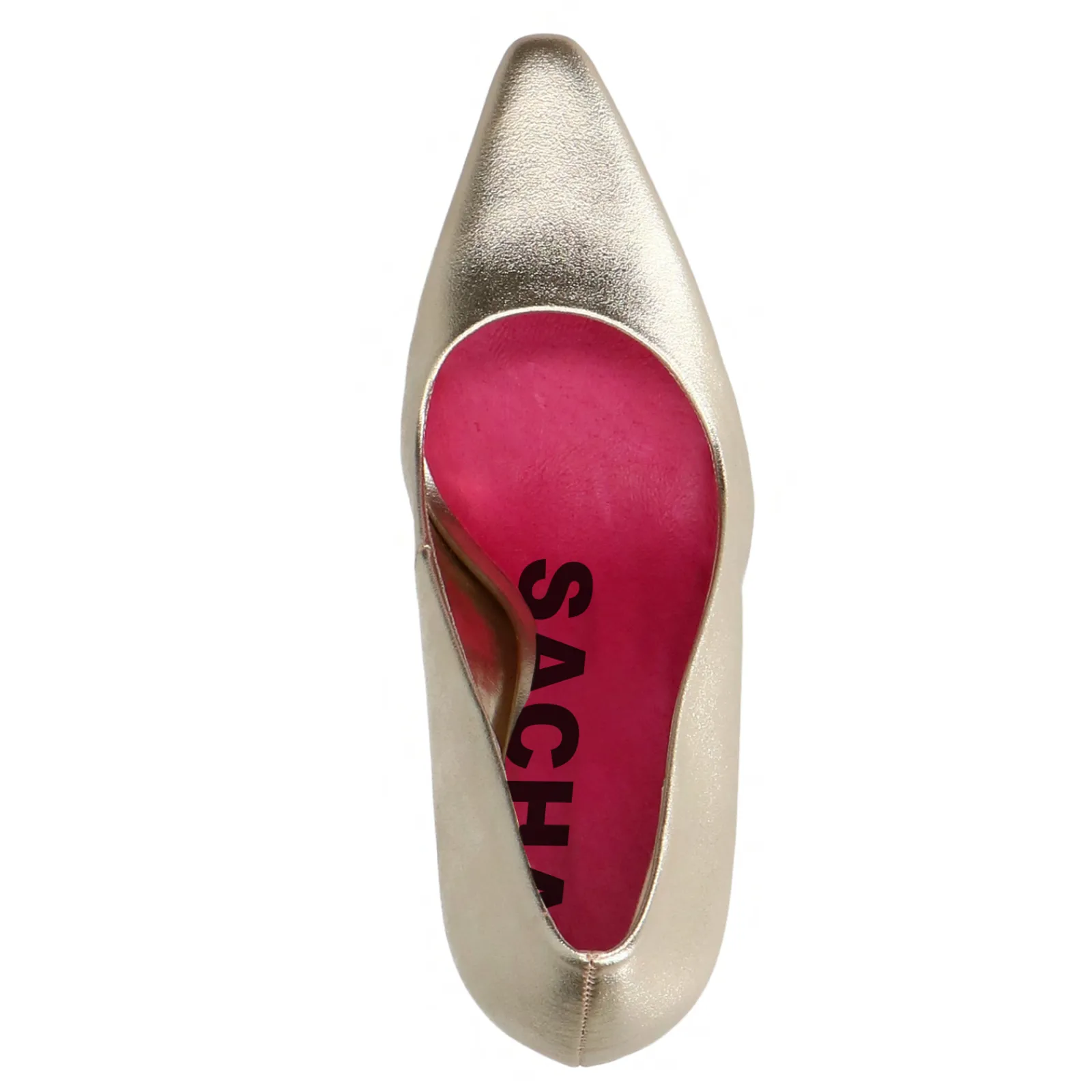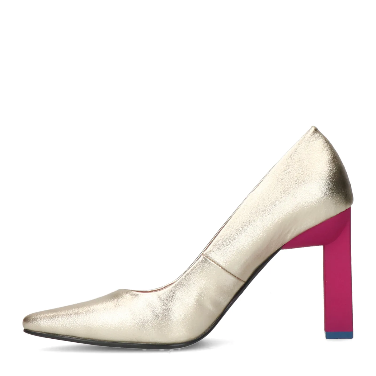 Een Matte Goudkleurige Finish Gecombineerd Met Roze Details En Een Funky Hak, Deze Pumps Van Sacha Hebben Deze Eigenschappen In Het Opvallende Design. De Hak Heeft Een Hoogte Van 9 Cm En De Pumps Hebben Hierbij Een Puntige Neus. Maak Gebruik Van De Juiste Onderhoudsproducten!