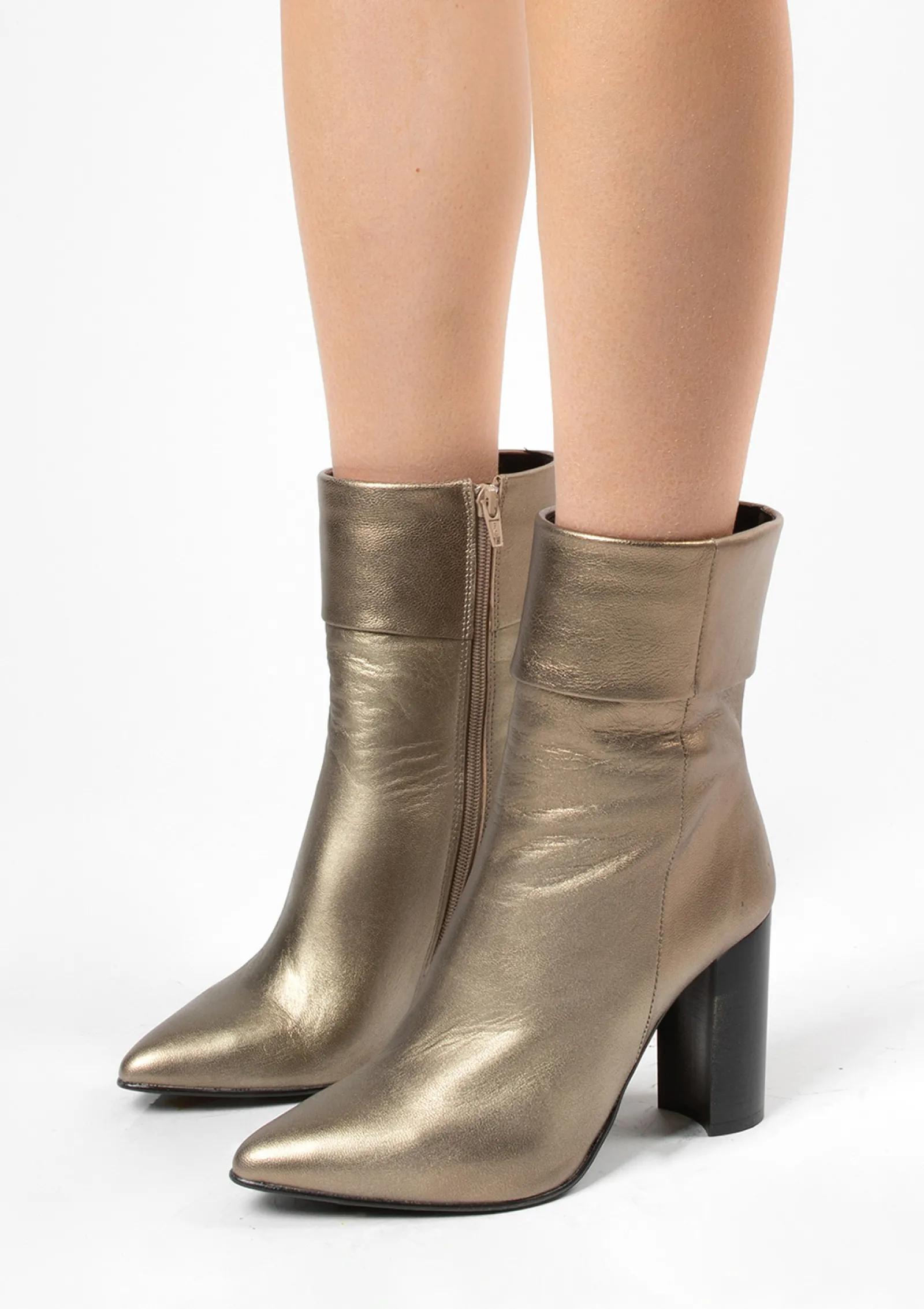 Deze Goudkleurige Enkellaarsjes Met Hak Van Sacha Hebben Matte Metallic Finish. De Laarsjes Hebben Aan De Bovenkant Een …