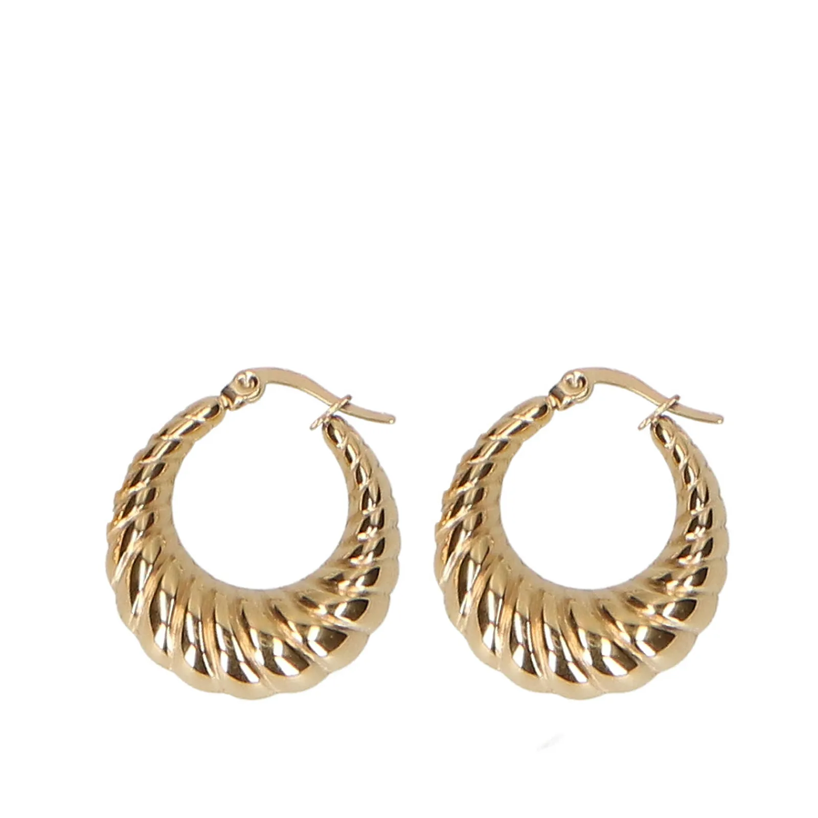 Deze Goudkleurige Gedraaide Oorringen Van Sacha Staan Ook Wel Bekend Als De ‘Croissant’ Oorringen! De Oorbellen Hebben Een Diameter Van 25 Mm En Een Lengte Van 3 Cm. De Oorringen Zijn Geheel Gemaakt Van Stainless Steel.