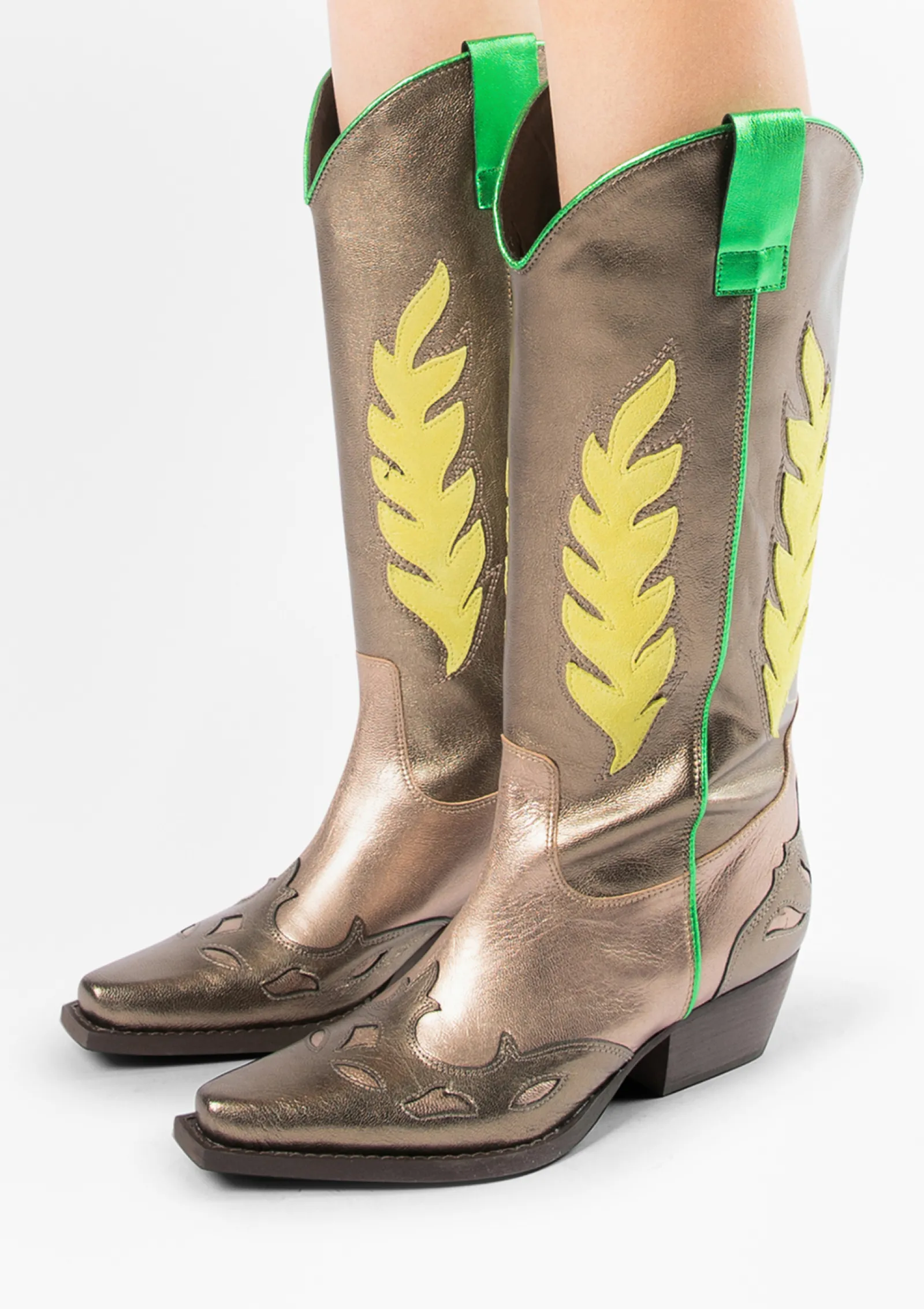 Wij Zijn Over De Moon Van Deze Leren Cowboylaarzen Van Sacha! De Grijze Metallic Boots Zijn Afgewerkt Met Gestikte Gele En Groene Metallic Details: De Perfecte Kleurencombinatie. Door De Traditionele Western Stiksels, Puntneus En Blokhak Van 5 Cm Hoog Voel Jij Jezelf Een Echte Cowgirl. Zowel De Binnen- Als Buitenkant Zijn Gemaakt Van Leer. De Schachthoogte Is 30 Cm En De Schachtomtrek 32 Cm. Maak Gebruik Van De Juiste Onderhoudsproducten Om Jaren Te Genieten Van Je Western Boots!